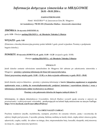 Informacja dotycząca zimowiska w MRĄGOWIE 24.01 –30.01.2016 r. ZAKWATEROWANIE: Hotel: MAZURIA*** ul. Jaszczurcza Góra 28, Mrągowo tel. kontaktowy: 798 051 051 (Dominika Mathea – kierownik zimowiska) ZBIÓRKA: 24 stycznia (NIEDZIELA) godz. 8.30- Olsztyn: parking ERANOVA – ul. Obrońców Tobruku 3, Olsztyn WYJAZD: godz. 9.00 (Dzieciom z chorobą lokomocyjną prosimy podać tabletki 1 godz. przed wyjazdem. Prosimy o podpisanie bagażu dziecka.). POWRÓT: 30 stycznia (SOBOTA) ok. godz. 11.00 – 11.20 (wyjazd o godz. 10.00) Olsztyn: parking ERANOVA – ul. Obrońców Tobruku 3 Olsztyn UWAGA !!! Jeżeli dziecko zostanie odwiezione samochodem do Mrągowa lub zabrane po zakończeniu zimowiska z Mrągowa - prosimy o pisemną informację do biura lub nauczyciela tańca. Dzieci przywozimy między godz. 11:00 – 11:30, a w dniu wyjazdu odbieramy w godz. 09:15 – 09:45. Jeżeli dziecko zażywa lekarstwa - prosimy o pisemną informację w karcie (lekarstwa zapakować w oryginalne opakowanie wraz z ulotką do woreczka/kosmetyczki, podpisać imieniem i nazwiskiem dziecka i wraz z informacją o dawkowaniu oddać wychowawcy na zbiórce). Prosimy o nie pakowanie dziecku do bagażu żadnych leków !!! Informujemy, że zdjęcia dzieci(dotyczy Uczestników, których Rodzice wyrazili zgodę zawartą w umowie na przetwarzanie i wykorzystywanie wizerunku), przebywających na kolonii będą umieszczone na naszym FanPagu: https://www.facebook.com/EranovaBiuroPodrozy/ NA OBÓZ NALEŻY ZABRAĆ: Przybory toaletowe (mydło, mydelniczka, szampon, przybory do czesania włosów, pastę i szczoteczkę do zębów), klapki pod prysznic, 2 ręczniki, piżamę, bieliznę osobistą na każdy dzień, ciepłą odzież zimową (polar, rękawiczki, czapka, szalik) do zabaw na śniegu, dres, nieprzemakalne buty, koszulki, skarpetki, strój stosowny na mszę św., zajęcia taneczne/sportowe. Dla dzieci jeżdżących na nartach (wersja B): obowiązkowo dzieci muszą posiadać kask narciarski, tłusty krem do twarzy, 2 pary rękawiczek, kombinezon (kurtka i spodnie narciarskie); wskazane jest posiadanie gogli i kominiarki, bielizny termoaktywnej, długich skarpet/podkolanowek. Osoby, które wypożyczają sprzęt za dodatkową opłatą mają w cenie buty, narty – UWAGA! W tej samej cenie dzieci otrzymają kask, ponieważ udało nam się wynegocjować z wypożyczalnią dodatkowy bonus. Dla dzieci chodzących na zajęcia taneczne (wersja A): wygodny strój na zajęcia teneczne: bluzka z krótkim rękawkiem, leginsy, spodnie dresowe, tenisówki. Dodatkowo dla wszystkich chętnych : ozdoby i przebrania na imprezy wieczorne, stroje karnawałowe, stroje związane z bajkowymi postaciami. Dodatkowo dziewczynki mogą zabrać kosmetyki do twarzy, włosów i paznokci. Dzieci mogą posiadać telefony komórkowe !!! Będą one wydawane dzieciom tylko i wyłącznie w czasie poobiednim od 3 dnia zimowiska (26.01.2016 r.). Poza tym czasem wyłączone komórki będą pod opieką wychowawcy. Centrum Tańca Wasilewski – Felska i wychowawcy nie ponoszą odpowiedzialności za telefony, w czasie, gdy korzystają z nich dzieci Prosimy o umieszczenie na telefonie naklejki z imieniem i nazwiskiem dziecka oraz nr PIN oraz prosimy spakować ładowarkę do telefonu. UWAGA!!! Przez pierwsze dwa dni nie dzwonimy do dzieci. Od 3 dnia zimowiska (26 stycznia) istnieją dwie możliwości kontaktu z dzieckiem: 1. Dzwonimy podczas godzin posiłków tj. Wersja A – 9.00-9.30, 14.00-14:30 tel. 506 172 621 Wersja B- 8.45-9.15, 14.00-14.30 tel. 798 051 051 2. Dzwonimy w czasie ciszy poobiedniej na numer telefonu komórkowego dziecka w godz. 14.30 – 15.15 od dnia 26 I 2016r. Nie będzie możliwości poproszenia dzieci do tel. o innej porze dnia (komórki będą wyłączone). W nagłych przypadkach telefonować do: kierownika zimowiska - Dominika Mathea - 798 051 051 lub prosimy o pozostawianie informacji w recepcji hotelu bądź sms-a na komórkę kierownika, skontaktujemy się tak szybko jak to będzie możliwe. Prosimy jednocześnie o informowanie kierownika kolonii o życzeniach lub uwagach, które dziecko Państwu przekazało telefonicznie, a o których my nie wiemy. Drodzy Rodzice !!! Serdecznie prosimy, by odwiedzać dzieci jedynie w wyjątkowej potrzebie, gdyż spotkanie takie wzmaga tęsknotę za domem, a chcielibyśmy, aby dziecko pozostało z nami do końca zimowiska. Zasada ta została podyktowana prośbami rodziców. W razie rezygnacji podczas trwania obozu nie zwracamy żadnych kosztów.
