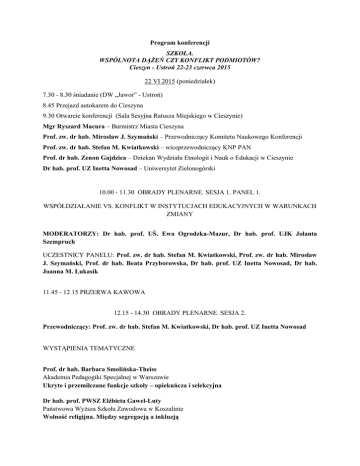 Program konferencji SZKOŁA. WSPÓLNOTA DĄŻEŃ CZY KONFLIKT PODMIOTÓW? Cieszyn - Ustroń 22-23 czerwca 2015 22 VI 2015 (poniedziałek) 7.30 - 8.30 śniadanie (DW „Jawor” - Ustroń) 8.45 Przejazd autokarem do Cieszyna 9.30 Otwarcie konferencji (Sala Sesyjna Ratusza Miejskiego w Cieszynie) Mgr Ryszard Macura – Burmistrz Miasta Cieszyna Prof. zw. dr hab. Mirosław J. Szymański – Przewodniczący Komitetu Naukowego Konferencji Prof. zw. dr hab. Stefan M. Kwiatkowski – wiceprzewodniczący KNP PAN Prof. dr hab. Zenon Gajdzica – Dziekan Wydziału Etnologii i Nauk o Edukacji w Cieszynie Dr hab. prof. UZ Inetta Nowosad – Uniwersytet Zielonogórski 10.00 - 11.30 OBRADY PLENARNE. SESJA 1. PANEL 1. WSPÓŁDZIAŁANIE VS. KONFLIKT W INSTYTUCJACH EDUKACYJNYCH W WARUNKACH ZMIANY MODERATORZY: Dr hab. prof. UŚ. Ewa Ogrodzka-Mazur, Dr hab. prof. UJK Jolanta Szempruch UCZESTNICY PANELU: Prof. zw. dr hab. Stefan M. Kwiatkowski, Prof. zw. dr hab. Mirosław J. Szymański, Prof. dr hab. Beata Przyborowska, Dr hab. prof. UZ Inetta Nowosad, Dr hab. Joanna M. Łukasik 11.45 - 12.15 PRZERWA KAWOWA 12.15 - 14.30 OBRADY PLENARNE. SESJA 2. Przewodniczący: Prof. zw. dr hab. Stefan M. Kwiatkowski, Dr hab. prof. UZ Inetta Nowosad WYSTĄPIENIA TEMATYCZNE Prof. dr hab. Barbara Smolińska-Theiss Akademia Pedagogiki Specjalnej w Warszawie Ukryte i przemilczane funkcje szkoły – opiekuńcza i selekcyjna Dr hab. prof. PWSZ Elżbieta Gaweł-Luty Państwowa Wyższa Szkoła Zawodowa w Koszalinie Wolność religijna. Między segregacją a inkluzją Dr hab. prof. UJK Jolanta Szempruch Uniwersytet Jana Kochanowskiego w Kielcach Relacje rodziny i szkoły w procesie wychowania dziecka - wspólnota dążeń czy konflikt podmiotów? Prof. dr hab. Piotr Błajet Uniwersytet Mikołaja Kopernika w Toruniu Dyrektor szkoły jako przywódca wspólnoty – refleksje po studiach podyplomowych dla liderów oświaty Dyskusja 14.30 - 15.30 OBIAD - Kamienica Konczakowskich 15.30 - 18.30 SPACER PO CIESZYNIE z przewodnikiem na wybranych szlakach (Wzgórze Zamkowe, Cieszyńska Wenecja, Książnica, spacer szlakiem Nohavicy i piosenki Andrusa: Park Pokoju, Głęboka, most graniczny, Avion, drukarnia). W tym: Szkoła muzyczna na Wzgórzu Zamkowym - koncert 18.30 Przejazd autokarem do DW „Jawor” 20.00 – UROCZYSTA KOLACJA 23 VI 2015 (wtorek – DW „Jawor”) 8.00 - 9.00 – ŚNIADANIE 9.15 - 10.15 SEKCJA I. PANEL 2. MOŻLIWOŚCI I OGRANICZENIA W INICJOWANIU I ROZWOJU WSPÓLNOTY PODMIOTÓW SZKOLNEJ EDUKACJI (sala konferencyjna) MODERATORZY: Dr hab. Joanna M. Łukasik, Dr hab. Jarosław Michalski UCZESTNICY PANELU: Dr hab. prof. GSW „Milenium” Grażyna Bartkowiak, Dr hab. prof. UZ Ewa Pasterniak-Kobyłecka, Dr Magdalena Grochowalska (UP), Dr Renata S. Zaborek (UJK) 10.15 - 11.30 WYSTĄPIENIE TEMATYCZNE: Dr Edyta Kahl Uniwersytet Zielonogórski ZNP a polityka władz oświatowych w Polsce Ludowej - wspólnota dążeń czy konflikt? Dr Jarosława Lach Akademia Pedagogiki Specjalnej w Warszawie Relacje nauczyciele - rodzice w sytuacjach trudnych Sandra Kocjan, Katarzyna Szolc Uniwersytet Śląski Szkoła – miejsce konfliktów, czy współpracy rodziców i nauczycieli? Mgr Magdalena Zapotoczna Uniwersytet Zielonogórski Uczniowskie firmy wobec tworzenia edukacyjnej wspólnoty Dr Sławomir Trusz Uniwersytet Pedagogiczny w Krakowie Czy nauczyciele myślą źle o "eurosierotach"? Stereotypy i uprzedzenia wobec dzieci sezonowych migrantów, jako przykład poznawczo-społecznych barier w tworzeniu edukacyjnej wspólnoty Dr Jolanta Wiśniewska, dr Patrycja Jurkiewicz Akademia Pedagogiki Specjalnej w Warszawie Uczeń dorosły w szkole - prawidłowość czy przymus? Dr Anetta Soroka-Fedorczuk Uniwersytet Zielonogórski Wspólnota w narracjach pamiętnikarskich nauczycielek wczesnej edukacji 9.15 - 10.15 – SEKCJA II. PANEL 3. MIĘDZYKULTUROWE KONTEKSTY WSPÓLNOTY (kawiarnia) MODERATORZY: Dr hab. NWSP Agata Popławska, Doc. PhDr. Josef Malach UCZESTNICY PANELU: Dr hab. prof. UŚ Ewa Ogrodzka-Mazur, Dr hab. Anna Gajdzica (UŚ), Dr hab. Barbara Grabowska (UŚ), Dr Iwona Ocetkiewicz (UP), Dr Gabriela PiechaczekOgierman (UŚ) , Dr Aleksandra Minczanowska (UŚ) 10.15 - 11.30 WYSTĄPIENIE TEMATYCZNE: Dr Agnieszka Pawluk-Skrzypek Szkoła Główna Gospodarstwa Wiejskiego w Warszawie Nauczyciel i rodzice wobec SPE – wspólnota potrzeb, wspólnota dążeń? Komunikat z badań Dr Urszula Klajmon-Lech Uniwersytet Śląski Integracja - idea a rzeczywistość w opinii rodziców dzieci niepełnosprawnych Dr Aniela Różańska Uniwersytet Śląski Zadania szkoły jako wspólnoty podmiotów zróżnicowanych kulturowo a szkolna edukacja religijna Mgr Barbara Kowalczyk Akademia Pedagogiki Specjalnej w Warszawie Nauczyciel wyznaczony przez dyrektora szkoły do planowania i realizowania zadań z zakresu doradztwa zawodowego - czy można mówić o konflikcie ról? Mgr Aneta Wojnarowska Uniwersytet Pedagogiczny w Krakowie Rodzina zróżnicowana kulturowo w przestrzeni wczesnej edukacji Mgr Alicja Hruzd-Matuszczyk Uniwersytet Śląski Szkoła z polskim językiem nauczania – potrzeby i oczekiwania społeczności szkoły wobec możliwości i oczekiwań władz lokalnych i krajowych różnicowanym kulturowo 11.30 - 12.00 PRZERWA KAWOWA 12.00 - 13.15 SEKCJA I. Panel 4. WSPÓLNOTA I KONFLIKT W PRZESTRZENI SZKOŁY. UWARUNKOWANIA I EFEKTY (sala konferencyjna) MODERATORZY: Prof. dr hab. Beata Przyborowska, Prof. dr hab. Piotr Błajet UCZESTNICY PANELU: Dr hab. prof. UKW Ryszarda Cierzniewska, Dr hab. prof. APS Jarosław Michalski, Dr Edyta Bartkowiak (UZ), Dr Ewa Bochno (UZ), Dr Hanna StępniewskaGębik (UP), Dr Błażej Przybylski (APS) 13.15 - 14.00 WYSTĄPIENIE TEMATYCZNE: Dr Monika Jurewicz Szkoła Główna Gospodarstwa Wiejskiego w Warszawie Spostrzeganie własnej indywidualności w percepcji studentów kierunku pedagogika. Komunikat z badań Dr Marta Krasuska-Betiuk Akademia Pedagogiki Specjalnej w Warszawie Współpraca uczelni i szkoły w ramach praktyk ped