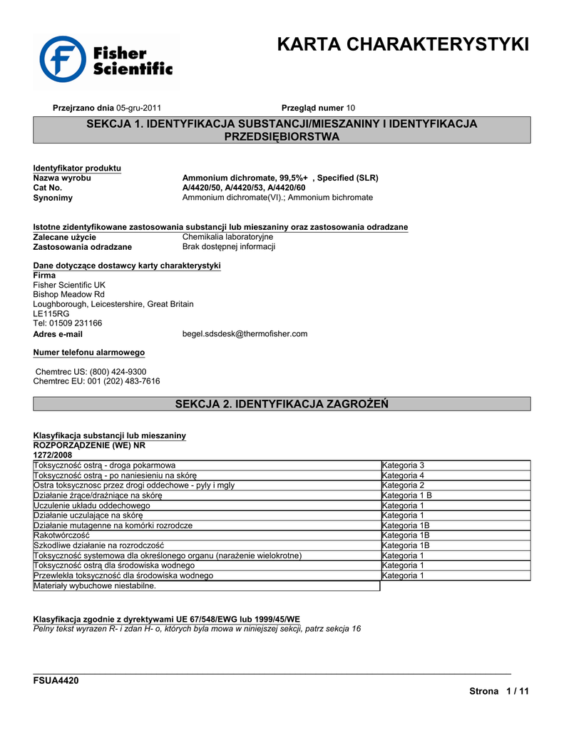KARTA CHARAKTERYSTYKI Przejrzano dnia 05-gru-2011 Przegląd numer 10 SEKCJA 1. IDENTYFIKACJA SUBSTANCJI/MIESZANINY I IDENTYFIKACJA PRZEDSIĘBIORSTWA Identyfikator produktu Nazwa wyrobu Cat No. Synonimy Ammonium dichromate, 99,5%+ , Specified (SLR) A/4420/50, A/4420/53, A/4420/60 Ammonium dichromate(VI).; Ammonium bichromate Istotne zidentyfikowane zastosowania substancji lub mieszaniny oraz zastosowania odradzane Chemikalia laboratoryjne Zalecane użycie Brak dostępnej informacji Zastosowania odradzane Dane dotyczące dostawcy karty charakterystyki Firma Fisher Scientific UK Bishop Meadow Rd Loughborough, Leicestershire, Great Britain LE115RG Tel: 01509 231166 [email protected] Adres e-mail Numer telefonu alarmowego Chemtrec US: (800) 424-9300 Chemtrec EU: 001 (202) 483-7616 SEKCJA 2. IDENTYFIKACJA ZAGROŻEŃ Klasyfikacja substancji lub mieszaniny ROZPORZĄDZENIE (WE) NR 1272/2008 Toksyczność ostrą - droga pokarmowa Toksyczność ostrą - po naniesieniu na skórę Ostra toksycznosc przez drogi oddechowe - pyly i mgly Działanie żrące/drażniące na skórę Uczulenie układu oddechowego Działanie uczulające na skórę Działanie mutagenne na komórki rozrodcze Rakotwórczość Szkodliwe działanie na rozrodczość Toksyczność systemowa dla określonego organu (narażenie wielokrotne) Toksyczność ostrą dla środowiska wodnego Przewlekła toksyczność dla środowiska wodnego Materiały wybuchowe niestabilne. Kategoria 3 Kategoria 4 Kategoria 2 Kategoria 1 B Kategoria 1 Kategoria 1 Kategoria 1B Kategoria 1B Kategoria 1B Kategoria 1 Kategoria 1 Kategoria 1 Klasyfikacja zgodnie z dyrektywami UE 67/548/EWG lub 1999/45/WE Pelny tekst wyrazen R- i zdan H- o, których byla mowa w niniejszej sekcji, patrz sekcja 16 _____________________________________________________________________________________________ FSUA4420 Strona 1 / 11 KARTA CHARAKTERYSTYKI Przejrzano dnia 05-gru-2011 Ammonium dichromate, 99,5%+ , Specified (SLR) _____________________________________________________________________________________________ SEKCJA 2. IDENTYFIKACJA ZAGROŻEŃ Symbol(e) Zwrot(y) R Zestawy wyrazen R- E - Produkt wybuchowy T+ - Produkt bardzo toksyczny N - Produkt niebezpieczny dla środowiska R45 - Może powodować raka R46 - Może powodować dziedziczne wady genetyczne R60 - Może upośledzać płodność R61 - Może działać szkodliwie na dziecko w łonie matki R 2 - Zagrożenie wybuchem wskutek uderzenia, tarcia, kontaktu z ogniem lub innymi źródłami zapłonu R 8 - Kontakt z materiałami zapalnymi może spowodować pożar R21 - Działa szkodliwie w kontakcie ze skórą R25 - Działa toksycznie po połknięciu R26 - Działa bardzo toksycznie przez drogi oddechowe R34 - Powoduje oparzenia R42/43 - Może powodować uczulenie w następstwie narażenia drogą oddechową i w kontakcie ze skórą R48/23 - Działa toksycznie przez drogi oddechowe; stwarza poważne zagrożenie zdrowia w następstwie długotrwałego narażenia R50/53 - Działa bardzo toksycznie na organizmy wodne; może powodować długo utrzymujące się niekorzystne zmiany w środowisku wodnym Elementy etykiety Hasło ostrzegawcze Niebezpieczeństwo _____________________________________________________________________________________________ FSUA4420 Strona 2 / 11 KARTA CHARAKTERYSTYKI Przejrzano dnia 05-gru-2011 Ammonium dichromate, 99,5%+ , Specified (SLR) _____________________________________________________________________________________________ Zwroty wskazujące rodzaj zagrożenia H350 - Może powodować raka H340 - Może powodować wady genetyczne H360FD - Może działać szkodliwie na płodność. Może działać szkodliwie na dziecko w łonie matki H330 - Wdychanie grozi śmiercią H301 - Działa toksycznie po połknięciu H372 - Powoduje uszkodzenie narządów poprzez długotrwałe lub wielokrotne narażenie H312 - Działa szkodliwie w kontakcie ze skórą H314 - Powoduje poważne oparzenia skóry oraz uszkodzenia oczu H334 - Może powodować objawy alergii lub astmy lub trudności w oddychaniu w następstwie wdychania H317 - Może powodować reakcję alergiczną skóry H410 - Działa bardzo toksycznie na organizmy wodne, powodując długotrwałe skutki H200 - Materiały wybuchowe niestabilne Zwroty wskazujące środki ostrożności - EU (§28, 1272/2008) P210 - Przechowywać z dala od źródeł ciepła/iskrzenia/otwartego ognia/gorących powierzchni. Palenie wzbronione P280 - Stosować rękawice ochronne/ odzież ochronną/ ochronę oczu/ ochronę twarzy P301 + P330 + P331 - W PRZYPADKU POŁKNIĘCIA: wypłukać usta. NIE wywoływać wymiotów P305 + P351 + P338 - W PRZYPADKU DOSTANIA SIĘ DO OCZU: Ostrożnie płukać wodą przez kilka minut. Wyjąć soczewki kontaktowe, jeżeli są i można je łatwo usunąć. Nadal płukać P342 + P311 - W przypadku wystąpienia objawów ze strony układu oddechowego: Skontaktować się z OŚRODKIEM ZATRUĆ lub z lekarzem P304 + P340 - W PRZYPADKU DOSTANIA SIĘ DO DRÓG ODDECHOWYCH: wyprowadzić lub wynieść poszkodowanego na świeże powietrze i zapewnić warunki do odpoczynku w pozycji umożliwiającej swobodne oddychanie P302 + P352 - W PRZYPADKU KONTAKTU ZE SKÓRĄ: Umyć dużą ilością wody z mydłem P273 - Unikać uwolnienia do środowiska Inne zagrożenia Brak dostępnej informacji. SEKCJA 3. SKŁAD/INFORMACJA O SKŁADNIKACH Składniki Nr WE. Procent wagowy Nr CAS 67/548/EEC klasyfikacji CLP klasyfikacji - rozporządzenia (WE) nr 1272/2008 Nr REACH. _____________________________________________________________________________________________ FSUA4420 Strona 3 / 11 KARTA CHARAKTERYSTYKI Przejrzano dnia 05-gru-2011 Ammonium dichromate, 99,5%+ , Specified (SLR) _____________________________________________________________________________________________ SEKCJA 3. SKŁAD/INFORMACJA O SKŁADNIKACH Ammonium bichromate 7789-09-5 EEC No. 232-143-1 >95 7789-09-5 E; R2 Acute Tox. 3 Xn; R21 (H301) T; R25-48/23 Acute Tox. 4 T+; R26 (H312) C; R34 Skin Corr. 1B R42/43 (H314) Carc.Cat.2; 