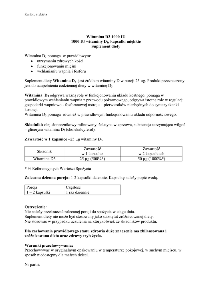 Karton, etykieta Witamina D3 1000 IU 1000 IU witaminy D3, kapsułki miękkie Suplement diety Witamina D3 pomaga w prawidłowym: utrzymaniu zdrowych kości funkcjonowaniu mięśni wchłanianiu wapnia i fosforu Suplement diety Witamina D3 jest źródłem witaminy D w porcji 25 µg. Produkt przeznaczony jest do uzupełnienia codziennej diety w witaminę D3. Witamina D3 odgrywa ważną rolę w funkcjonowaniu układu kostnego, pomaga w prawidłowym wchłanianiu wapnia z przewodu pokarmowego, odgrywa istotną rolę w regulacji gospodarki wapniowo - fosforanowej ustroju – pierwiastków niezbędnych do syntezy tkanki kostnej. Witamina D3 pomaga również w prawidłowym funkcjonowaniu układu odpornościowego. Składniki: olej słonecznikowy rafinowany, żelatyna wieprzowa, substancja utrzymująca wilgoć – gliceryna witamina D3 (cholekalcyferol). Zawartość w 1 kapsułce –25 µg witaminy D3. Składnik Witamina D3 Zawartość w 1 kapsułce 25 µg (500%*) Zawartość w 2 kapsułkach 50 µg (1000%*) * % Referencyjnych Wartości Spożycia Zalecana dzienna porcja: 1-2 kapsułki dziennie. Kapsułkę należy popić wodą. Porcja 1 – 2 kapsułki Częstość 1 raz dziennie Ostrzeżenie: Nie należy przekraczać zalecanej porcji do spożycia w ciągu dnia. Suplement diety nie może być stosowany jako substytut zróżnicowanej diety. Nie stosować w przypadku uczulenia na którykolwiek ze składników produktu. Dla zachowania prawidłowego stanu zdrowia duże znaczenie ma zbilansowana i zróżnicowana dieta oraz zdrowy tryb życia. Warunki przechowywania: Przechowywać w oryginalnym opakowaniu w temperaturze pokojowej, w suchym miejscu, w sposób niedostępny dla małych dzieci. Nr partii: Karton, etykieta Najlepiej spożyć przed końcem: Zawartość: 60 kapsułek miękkich 120 kapsułek miękkich Teva Operations Poland Sp. z. o.o., ul. Emilii Plater 53, 00-113 Warszawa