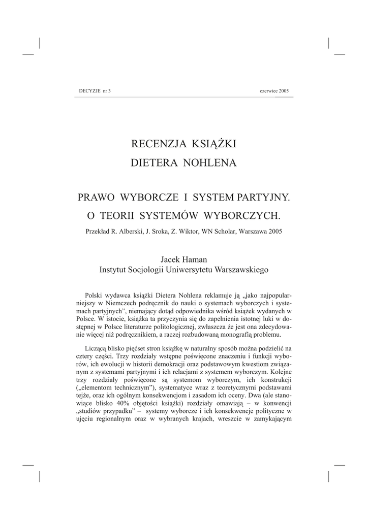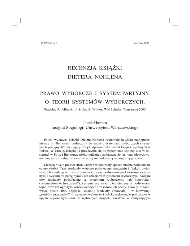 DECYZJE nr 3 czerwiec 2005 RECENZJA KSIĄŻKI DIETERA NOHLENA PRAWO WYBORCZE I SYSTEM PARTYJNY. O TEORII SYSTEMÓW WYBORCZYCH. Przekład R. Alberski, J. Sroka, Z. Wiktor, WN Scholar, Warszawa 2005 Jacek Haman Instytut Socjologii Uniwersytetu Warszawskiego Polski wydawca książki Dietera Nohlena reklamuje ją „jako najpopularniejszy w Niemczech podręcznik do nauki o systemach wyborczych i systemach partyjnych”, niemający dotąd odpowiednika wśród książek wydanych w Polsce. W istocie, książka ta przyczynia się do zapełnienia istotnej luki w dostępnej w Polsce literaturze politologicznej, zwłaszcza że jest ona zdecydowanie więcej niż podręcznikiem, a raczej rozbudowaną monografią problemu. Liczącą blisko pięćset stron książkę w naturalny sposób można podzielić na cztery części. Trzy rozdziały wstępne poświęcone znaczeniu i funkcji wyborów, ich ewolucji w historii demokracji oraz podstawowym kwestiom związanym z systemami partyjnymi i ich relacjami z systemem wyborczym. Kolejne trzy rozdziały poświęcone są systemom wyborczym, ich konstrukcji („elementom technicznym”), systematyce wraz z teoretycznymi podstawami tejże, oraz ich ogólnym konsekwencjom i zasadom ich oceny. Dwa (ale stanowiące blisko 40% objętości książki) rozdziały omawiają – w konwencji „studiów przypadku” – systemy wyborcze i ich konsekwencje polityczne w ujęciu regionalnym oraz w wybranych krajach, wreszcie w zamykającym 118 RECENZJA książkę dziewiątym rozdziale Autor odnosi się najważniejszych koncepcji teoretycznych łączących systemy partyjny i polityczny z systemami wyborczymi. Podaję to streszczenie spisu treści w dużej mierze dlatego, że spis treści jest – w pewnym sensie – najmocniejszą stroną omawianej książki. Nie należy się w tej opinii doszukiwać sarkazmu czy złośliwości: po prostu książka Nohlena jest wzorcowa, jeśli chodzi o kompozycję – a ściślej, we wzorcowy sposób identyfikuje zagadnienia najistotniejsze dla analizowania politycznych konsekwencji systemów wyborczych. Jednocześnie jest to książka par excellence politologiczna – jej przedmiotem są instytucje polityczne i ich relacje do siebie, a nie konstrukcje prawne (co mógłby sugerować tytuł) ani zachowania i postawy wyborców – w czym różni się od znacznej części polskiej literatury przedmiotu, często bardziej prawniczej lub socjologicznej niż politologicznej. Prezentowane w niej spojrzenie na systemy wyborcze ma charakter całościowy: z jednej strony ze względu na to, że Autor traktuje system wyborczy jako efekt współdziałania poszczególnych jego elementów (jak formuła agregacji głosów, konfiguracja okręgów wyborczych) – wręcz przestrzegając przed formułowaniem opinii o systemie w oparciu o osobną analizę jego elementów. Z drugiej strony, choć znaczna część książki poświęcona jest systemom wyborczym konkretnych krajów, to przedstawiane są one przede wszystkim przez pryzmat ich znaczenia dla teorii: książka nie jest i nie ma być (kolejnym) almanachem światowych systemów wyborczych (te zresztą zmieniają się tak często, że część informacji w niej zawartych już jest nieaktualna) i jeśli omawiane w niej są dość szczegółowo np. zmiany w systemach wyborczych „nowych demokracji” w Europie Środkowo-Wschodniej, to nie dla nich samych, ale ze względu na obserwowane w tym regionie (i na przykładzie tego regionu) ogólniejsze prawidłowości. Podstawowym celem książki jest bowiem przedstawienie i weryfikacja koncepcji klasyfikacji systemów wyborczych oraz teorii dotyczących ich wpływu na systemy partyjne i szerzej – na demokratyczne (a po części także i niedemokratyczne) systemy rządzenia. Jak i na ile Autorowi udało się zrealizować tak dobrze skonstruowany program? Czy formułowane przez niego wnioski i ich uzasadnienia są przekonywujące? Tutaj odpowiedź jest już znacznie mniej jednoznaczna. Jeśli chodzi o klasyfikację, Autor wychodzi od tradycyjnego podziału na wybory większościowe i proporcjonalne – i tego podziału broni. Różnicy między podstawowymi typami Dieter Nohlen dopatruje się jednak w pierwszym rzędzie nie w regule rozstrzygania (jaką może być np. zasada zwykłej większości w okręgach jednomandatowych), ale w celu reprezentacji, którym może być, albo tworzenie reprezentacji elektoratu (w wyborach proporcjonalnych) RECENZJA 119 lub wytworzenie większości rządowej (w wyborach większościowych). Te dwa założenia są – według Nohlena – zasadniczo opozycyjne, niemożliwe do jednoczesnej realizacji, tak więc nie ma w klasyfikacji miejsca na rozwiązania pośrednie: nie ma żadnych „mieszanych” systemów wyborczych. Możliwe są różnego rodzaju systemy „kombinowane”, łączące elementy typowe dla rozwiązań „większościowych” i „proporcjonalnych”, ostatecznie jednak będą one przypisywane do jednego z głównych typów. Podejście to może wydawać się dyskusyjne, ale Nohlen w każdym razie stosuje je konsekwentnie. Analizując wpływ systemów wyborczych na systemy partyjne, Nohlen odrzuca wszelkie bezwarunkowe twierdzenia w rodzaju „system wyborczy większości względnej zawsze prowadzi do dwupartyjności”, podkreślając, że choć electoral systems matter, to ich działania nie można uniezależniać od kontekstu społecznego i politycznego. System wyborczy nie może być traktowany jako jedyna zmienna niezależna, zwłaszcza że bywa również zmienną zależną. Z drugiej strony nie można jednoznacznie determinować skutków pojedynczych elementów systemu wyborczego (np. formuły proporcjonalnej), w oderwaniu od innych elementów systemu (np. wielkość okręgów wyborczych, progi ustawowe lub ich brak). Dopiero przy tych założeniach można analizować wpływ systemów wyborczych na koncentrację systemów partyjnych, ich polaryzację czy na efektywność wymiany elit rządzących. O ile jednak kon