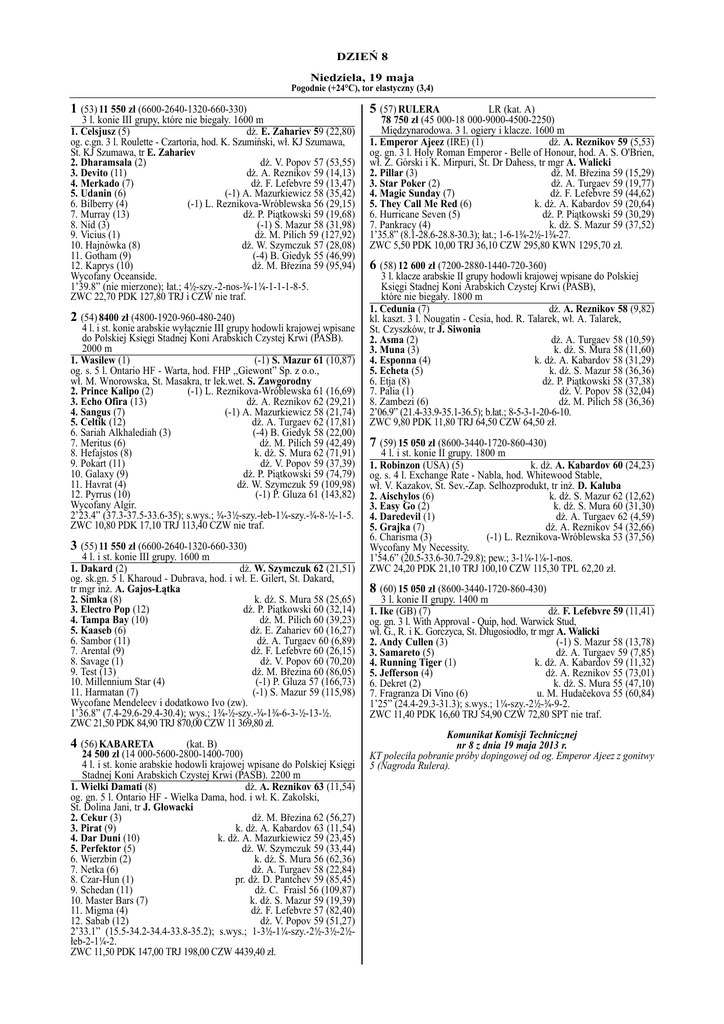 DZIEŃ 8 Niedziela, 19 maja Pogodnie (+24°C), tor elastyczny (3,4) 1 (53) 11 550 zł (6600-2640-1320-660-330) 3 l. konie III grupy, które nie biegały. 1600 m 1. Celsjusz (5) dż. E. Zahariev 59 (22,80) og. c.gn. 3 l. Roulette - Czartoria, hod. K. Szumiński, wł. KJ Szumawa, St. KJ Szumawa, tr E. Zahariev 2. Dharamsala (2) dż. V. Popov 57 (53,55) 3. Devito (11) dż. A. Reznikov 59 (14,13) 4. Merkado (7) dż. F. Lefebvre 59 (13,47) 5. Udanin (6) (-1) A. Mazurkiewicz 58 (35,42) 6. Bilberry (4) (-1) L. Reznikova-Wróblewska 56 (29,15) 7. Murray (13) dż. P. Piątkowski 59 (19,68) 8. Nid (3) (-1) S. Mazur 58 (31,98) 9. Vicius (1) dż. M. Pilich 59 (127,92) 10. Hajnówka (8) dż. W. Szymczuk 57 (28,08) 11. Gotham (9) (-4) B. Giedyk 55 (46,99) 12. Kaprys (10) dż. M. Březina 59 (95,94) Wycofany Oceanside. 1’39.8” (nie mierzone); łat.; 4½-szy.-2-nos-¾-1¼-1-1-1-8-5. ZWC 22,70 PDK 127,80 TRJ i CZW nie traf. 2 (54) 8400 zł (4800-1920-960-480-240) 4 l. i st. konie arabskie wyłącznie III grupy hodowli krajowej wpisane do Polskiej Księgi Stadnej Koni Arabskich Czystej Krwi (PASB). 2000 m 1. Wasilew (1) (-1) S. Mazur 61 (10,87) og. s. 5 l. Ontario HF - Warta, hod. FHP ,,Giewont” Sp. z o.o., wł. M. Wnorowska, St. Masakra, tr lek.wet. S. Zawgorodny 2. Prince Kalipo (2) (-1) L. Reznikova-Wróblewska 61 (16,69) 3. Echo Ofira (13) dż. A. Reznikov 62 (29,21) 4. Sangus (7) (-1) A. Mazurkiewicz 58 (21,74) 5. Celtik (12) dż. A. Turgaev 62 (17,81) 6. Sariah Alkhalediah (3) (-4) B. Giedyk 58 (22,00) 7. Meritus (6) dż. M. Pilich 59 (42,49) 8. Hefajstos (8) k. dż. S. Mura 62 (71,91) 9. Pokart (11) dż. V. Popov 59 (37,39) 10. Galaxy (9) dż. P. Piątkowski 59 (74,79) 11. Havrat (4) dż. W. Szymczuk 59 (109,98) 12. Pyrrus (10) (-1) P. Gluza 61 (143,82) Wycofany Algir. 2’23.4” (37.3-37.5-33.6-35); s.wys.; ¾-3½-szy.-łeb-1¼-szy.-¾-8-½-1-5. ZWC 10,80 PDK 17,10 TRJ 113,40 CZW nie traf. 3 (55) 11 550 zł (6600-2640-1320-660-330) 4 l. i st. konie III grupy. 1600 m 1. Dakard (2) dż. W. Szymczuk 62 (21,51) og. sk.gn. 5 l. Kharoud - Dubrava, hod. i wł. E. Gilert, St. Dakard, tr mgr inż. A. Gajos-Łątka 2. Simka (8) k. dż. S. Mura 58 (25,65) 3. Electro Pop (12) dż. P. Piątkowski 60 (32,14) 4. Tampa Bay (10) dż. M. Pilich 60 (39,23) 5. Kaaseb (6) dż. E. Zahariev 60 (16,27) 6. Sambor (11) dż. A. Turgaev 60 (6,89) 7. Arental (9) dż. F. Lefebvre 60 (26,15) 8. Savage (1) dż. V. Popov 60 (70,20) 9. Test (13) dż. M. Březina 60 (86,05) 10. Millennium Star (4) (-1) P. Gluza 57 (166,73) 11. Harmatan (7) (-1) S. Mazur 59 (115,98) Wycofane Mendeleev i dodatkowo Ivo (zw). 1’36.8” (7.4-29.6-29.4-30.4); wys.; 1¾-½-szy.-¾-1¾-6-3-½-13-½. ZWC 21,50 PDK 84,90 TRJ 870,00 CZW 11 369,80 zł. 4 (56) KABARETA (kat. B) 24 500 zł (14 000-5600-2800-1400-700) 4 l. i st. konie arabskie hodowli krajowej wpisane do Polskiej Księgi Stadnej Koni Arabskich Czystej Krwi (PASB). 2200 m 1. Wielki Damati (8) dż. A. Reznikov 63 (11,54) og. gn. 5 l. Ontario HF - Wielka Dama, hod. i wł. K. Zakolski, St. Dolina Jani, tr J. Głowacki 2. Cekur (3) dż. M. Březina 62 (56,27) 3. Pirat (9) k. dż. A. Kabardov 63 (11,54) 4. Dar Duni (10) k. dż. A. Mazurkiewicz 59 (23,45) 5. Perfektor (5) dż. W. Szymczuk 59 (33,44) 6. Wierzbin (2) k. dż. S. Mura 56 (62,36) 7. Netka (6) dż. A. Turgaev 58 (22,84) 8. Czar-Hun (1) pr. dż. D. Pantchev 59 (85,45) 9. Schedan (11) dż. C. Fraisl 56 (109,87) 10. Master Bars (7) k. dż. S. Mazur 59 (19,39) 11. Migma (4) dż. F. Lefebvre 57 (82,40) 12. Sabab (12) dż. V. Popov 59 (51,27) 2’33.1” (15.5-34.2-34.4-33.8-35.2); s.wys.; 1-3½-1¼-szy.-2½-3½-2½łeb-2-1¼-2. ZWC 11,50 PDK 147,00 TRJ 198,00 CZW 4439,40 zł. 5 (57) RULERA LR (kat. A) 78 750 zł (45 000-18 000-9000-4500-2250) Międzynarodowa. 3 l. ogiery i klacze. 1600 m 1. Emperor Ajeez (IRE) (1) dż. A. Reznikov 59 (5,53) og. gn. 3 l. Holy Roman Emperor - Belle of Honour, hod. A. S. O'Brien, wł. Z. Górski i K. Mirpuri, St. Dr Dahess, tr mgr A. Walicki 2. Pillar (3) dż. M. Březina 59 (15,29) 3. Star Poker (2) dż. A. Turgaev 59 (19,77) 4. Magic Sunday (7) dż. F. Lefebvre 59 (44,62) 5. They Call Me Red (6) k. dż. A. Kabardov 59 (20,64) 6. Hurricane Seven (5) dż. P. Piątkowski 59 (30,29) 7. Pankracy (4) k. dż. S. Mazur 59 (37,52) 1’35.8” (8.1-28.6-28.8-30.3); łat.; 1-6-1¾-2½-1¾-27. ZWC 5,50 PDK 10,00 TRJ 36,10 CZW 295,80 KWN 1295,70 zł. 6 (58) 12 600 zł (7200-2880-1440-720-360) 3 l. klacze arabskie II grupy hodowli krajowej wpisane do Polskiej Księgi Stadnej Koni Arabskich Czystej Krwi (PASB), które nie biegały. 1800 m 1. Cedunia (7) dż. A. Reznikov 58 (9,82) kl. kaszt. 3 l. Nougatin - Cesia, hod. R. Talarek, wł. A. Talarek, St. Czyszków, tr J. Siwonia 2. Asma (2) dż. A. Turgaev 58 (10,59) 3. Muna (3) k. dż. S. Mura 58 (11,60) 4. Esponna (4) k. dż. A. Kabardov 58 (31,29) 5. Echeta (5) k. dż. S. Mazur 58 (36,36) 6. Etja (8) dż. P. Piątkowski 58 (37,38) 7. Palia (1) dż. V. Popov 58 (32,04) 8. Zambezi (6) dż. M. Pilich 58 (36,36) 2’06.9” (21.4-33.9-35.1-36.5); b.łat.; 8-5-3-1-20-6-10. ZWC 9,80 PDK 11,80 TRJ 64,50 CZW 64,50 zł. 7 (59) 15 050 zł (8600-3440-1720-860-430) 4 l. i st. konie II grupy. 1800 m 1. Robinzon (USA) (5) k. dż. A. Kabardov 60 (24,23) og. s. 4 l. Exchange Rate - Nabla, hod. Whitewood Stable, wł. V. Kazakov, St. Sev.-Zap. Selhozprodukt, tr inż. D. Kałuba 2. Aischylos (6) k. dż. S. Mazur 62 (12,62) 3. Easy Go (2) k. dż. S. Mura 60 (31,30) 4. Daredevil (1) dż. A. Turgaev 62 (4,59) 5. Grajka (7) dż. A. Reznikov 54 (32,66) 6. Charisma (3) (-1) L. Reznikova-Wróblewska 53 (37,56) Wycofany My Necessity. 1’54.6” (20.5-33.6-30.7-29.8); pew.; 3-1¼-1¼-1-nos. ZWC 24,20 PDK 21,10 TRJ 100,10 CZW 115,30 TPL 62,20 zł. 8 (60) 15 050 zł (8600-3440-1720-860-430) 3 l. konie II grupy. 1400 m 1. Ike (GB) (7) dż. F. Lefebvre 59 (11,41) og. gn. 3 l. With Approval - Quip, hod. Warwick Stud, wł. G., R. i K. Gorczyca, St. Długosiodło, tr mgr A. Walicki 2. Andy Cullen (3) (-1)