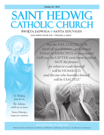 October 24 , 2010 ŚWIĘTA JADWIGA SANTA EDUVIGES 2226 NORTH HOYNE AVE. • CHICAGO, IL 60647 St. Hedwig, pray for us. Św. Jadwigo, módl się za nami. Santa Eduviges, ruega por nosotros. ARCHDIOCESE OF CHICAGO Administered by the Resurrection Fathers and Brothers. Celebrating 121 years in the Bucktown Community. 2 NOTES AND EVENTS October - Respect life Month This is truly the work of God. God cannot leave the crime unpunished: from the ground on which it has been spilt, the blood of the one murdered demands that God should render justice (cf. Gn 37:26; Is 26:21; Ez 24:7-8). From this text the Church has taken the name of the ‘sins which cry to God for justice’, and, first among them, she has included wilful murder. For the Jewish people, as for many peoples of antiquity, blood is the source of life. Indeed ‘the blood is the life’ (Dt 12:23), and life, especially human life, belongs only to God: for this reason whoever attacks human life, in some way attacks God himself. (The Gospel of Life [Evangelium Vitae], no. 9) “CATHOLICS COME HOME “ RETURNS WITH MAJOR MULTI-MEDIA EVANGELIZATION APPROACH The Archdiocese of Chicago announced today, August 12, 2010, that the evangelization initiative, Catholics Come Home Chicago, would return in December for a second year on local television stations and in parishes throughout Cook and Lake counties. After a positive response to last year's efforts, new commercials, combined with various other media, will bring the welcome message to all people, especially Catholics who have drifted from the practice of their faith. ADVERTISING SALES WEEK Attention Business Owners, Professionals and Self Employed CATECHISM CLASSES English Classes 9:15 AM - 10: 45 AM and assistance to the 11:00 AM Mass Spanish Classes 11:15 AM - 12:45 PM and assistance to the 1:00 PM Mass Adult English Classes have started. We meet every Wednesday in the convent 7:00 PM to 8:30 PM. Remember that the Mass in PART of the Class. For more information about Catechism classes, Baptisms, or Adult classes call Ana Flores at the Parish Offices from 11:00 AM - 3:00 PM Liturgical Publications, Inc. (LPi), our bulletin publisher, will have Steve Puchalski our parish representative visiting our parish within the next few weeks to service our bulletin. We would like to thank our present advertisers for renewing their ad and thereby continuing their support of our parish. For those interested in placing a new ad, this is your opportunity. Our Sunday bulletin is a primary way we use to communicate with you. Through our arrangement with the Liturgical Publications, the parish does not pay for the bulletin printing, which saves us thousands of dollars every year. Our bulletin is supported through the generosity of the advertisers—many of whom are our own parish members or members of our local community. During these difficult economic times, please support our advertisers with your patronage. Tell the business owner that you appreciate their support of our parish through their advertising in the bulletin. This is one small way we can work within our own community to weather these challenging times. A strong and vibrant parish is good for our community and a strong business community is good for our parish. Should you have any questions or concerns regarding the advertising sales week, please call Steve at (800) 950-9952, ext. 2435. SACRAMENTS RECONCILIATION: Monday-Saturday before Mass; Saturday 4:30 PM or by appointment. ANOINTING OF THE SICK: Please call to receive this sacrament of healing if a family member is ill or preparing for surgery. MARRIAGE: ARE YOU A REGISTERED PARISHIONER? Use of the offertory envelopes each week lets us know that you are an active member of our Parish. This prevents misunderstandings when someone wants to be married, have a child baptized or is asked to become a Godparent. Registration also enables us to provide letters for you for tax purposes. If you are registered and not receiving your envelopes, if any identifying information in your life has changed including, if you have moved or if you would like to become a registered parishioner, please complete registration forms found in the vestibule of the Church. We are asking all of our Parishioners to please reregister, so that we can update our records. Thank you. Please contact the parish office at least 6 months before the planned wedding date. BAPTISM: Please call the Parish Office. Baptism (English): 4th Sunday at 11:00 AM Mass. Preparation Class: 3rd Monday at 7:00 PM in the convent. Godparents must be married by the church or be living as single. PA R I S H I N F O R M AT I O N PARISH CALENDAR 3 October the Month of the Holy Rosary. CHOIR PRACTICE: Every Wednesday at 7:30 PM in the Church CORO: Español: Todos los Miercoles en el sotano del convento. Say the Rosary every day… Pray, pray a lot and offer sacrifices for sinners... I'm Our Lady of the Rosary. Only I will be able to help you. ...In the end My Immaculate Heart will triumph." Our Lady at Fatima CHILDREN OF FATIMA: Ist Saturday of the month 4 PM in the Convent Mass at 5:00 P.M. The word Rosary means "Crown of Roses". Our Lady has revealed to several people that each time they say a Hail Mary they are giving her a beautiful rose and that each complete Rosary makes her a crown of roses. The rose is the queen of flowers, and so the Rosary is the rose of all devotions and it is therefore the most important one. The Holy Rosary is considered a perfect prayer because within it lays the awesome story of our salvation. With the Rosary in fact we meditate the mysteries of joy, of sorrow and the glory of Jesus and Mary. It's a simple prayer, humble so much like Mary. It's a prayer we can all say together with Her, the Mother of God. With the Hail Mary we invite Her to pray for us. Our Lady always grants our request. She joins Her prayer to ours. Therefore it becomes ever more useful, because what Mary asks She always receives, Jesus can never say 