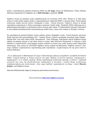 Jedna z największych polskich federacji MMA już 24 maja zawita do Bełchatowa. Ósma odsłona elitarnej organizacji FA odbędzie się w Hali Energia o godzinie 20:00. Fighters Arena na polskim rynku zadebiutowała we wrześniu 2010 roku. Wtedy to w Hali Atlas Arena w Łodzi miało miejsce jedno z najważniejszych wydarzeń MMA w naszym kraju. Przed polską widownią walkę stoczył mistrz olimpijski w judo - Paweł Nastula. Fighters Arena to druga największa organizacja w Polsce promująca mieszane sztuki walki. Pojedynki MMA odbywają się w pełnowymiarowej klatce na dystansie trzech rund po pięć minut. W poprzednich edycjach startowali w niej wybitni przedstawiciele wszechstylowej walki wręcz, znani oraz cenieni w Europie i świecie. Do największych gwiazd Fighters Arena należą: mistrz olimpijski w judo - Paweł Nastula, pierwszy Polak walczący dla amerykańskiej UFC - Tomasz Drwal, czołowy europejski zawodnik wagi ciężkiej Michał Kita, oraz były mistrz KSW, Brazylijczyk - Vitor Nobrega. Poprzednie edycje Fighters Arena odbyły się między innymi w hali Atlas Arena w Łodzi, Hali Mistrzów Włocławek, a ostatnio w Hali Polonia w Częstochowie, przyciągając tysiące widzów na arenę oraz setki tysięcy przed odbiorniki telewizyjne. Tym razem na celowniku Fighters Areny znalazł się Bełchatów. Fighters Arena 8 „Noc wagi ciężkiej" organizatorzy zapowiadają jako największy i najmocniejszy do tej pory event w historii federacji. - To co zobaczycie w Bełchatowie 25 maja w Hali Energia zaskoczy wszystkich i przejdzie do historii MMA. Czegoś takiego w Polsce jeszcze nie było. Będzie to starcie tytanów, najlepszych z najlepszych i to w wadze ciężkiej. Mamy najsilniejszą królewską dywizję w Polsce i nadszedł wreszcie ten czas, by skonfrontować najlepszych w Europie i rozdać długo oczekiwany międzynarodowy pas mistrzowski. „Noc wagi ciężkiej" zapamiętacie na długo - mówi Marcin Jesiotr, szef Fighters Arena. Starosta Bełchatowski objął tę inicjatywę patronatem honorowym. Więcej informacji: http://www.fighters-arena.pl