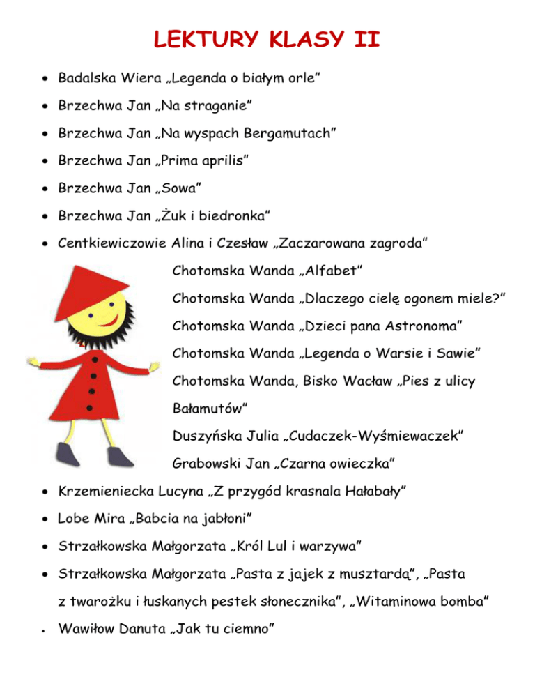 LEKTURY KLASY II Badalska Wiera „Legenda o białym orle” Brzechwa Jan „Na straganie” Brzechwa Jan „Na wyspach Bergamutach” Brzechwa Jan „Prima aprilis” Brzechwa Jan „Sowa” Brzechwa Jan „Żuk i biedronka” Centkiewiczowie Alina i Czesław „Zaczarowana zagroda” Chotomska Wanda „Alfabet” Chotomska Wanda „Dlaczego cielę ogonem miele?” Chotomska Wanda „Dzieci pana Astronoma” Chotomska Wanda „Legenda o Warsie i Sawie” Chotomska Wanda, Bisko Wacław „Pies z ulicy Bałamutów” Duszyńska Julia „Cudaczek-Wyśmiewaczek” Grabowski Jan „Czarna owieczka” Krzemieniecka Lucyna „Z przygód krasnala Hałabały” Lobe Mira „Babcia na jabłoni” Strzałkowska Małgorzata „Król Lul i warzywa” Strzałkowska Małgorzata „Pasta z jajek z musztardą”, „Pasta z twarożku i łuskanych pestek słonecznika”, „Witaminowa bomba” Wawiłow Danuta „Jak tu ciemno”