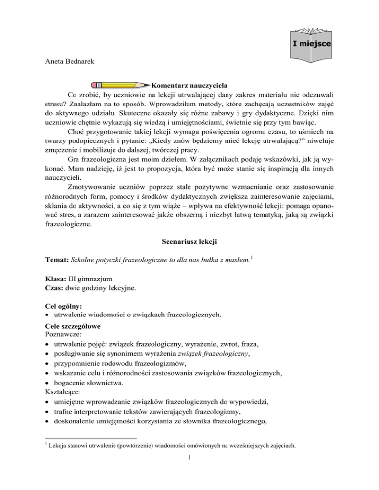 I miejsce Aneta Bednarek Komentarz nauczyciela Co zrobić, by uczniowie na lekcji utrwalającej dany zakres materiału nie odczuwali stresu? Znalazłam na to sposób. Wprowadziłam metody, które zachęcają uczestników zajęć do aktywnego udziału. Skuteczne okazały się różne zabawy i gry dydaktyczne. Dzięki nim uczniowie chętnie wykazują się wiedzą i umiejętnościami, świetnie się przy tym bawiąc. Choć przygotowanie takiej lekcji wymaga poświęcenia ogromu czasu, to uśmiech na twarzy podopiecznych i pytanie: „Kiedy znów będziemy mieć lekcję utrwalającą?” niweluje zmęczenie i mobilizuje do dalszej, twórczej pracy. Gra frazeologiczna jest moim dziełem. W załącznikach podaję wskazówki, jak ją wykonać. Mam nadzieję, iż jest to propozycja, która być może stanie się inspiracją dla innych nauczycieli. Zmotywowanie uczniów poprzez stałe pozytywne wzmacnianie oraz zastosowanie różnorodnych form, pomocy i środków dydaktycznych zwiększa zainteresowanie zajęciami, skłania do aktywności, a co się z tym wiąże – wpływa na efektywność lekcji: pomaga opanować stres, a zarazem zainteresować jakże obszerną i niezbyt łatwą tematyką, jaką są związki frazeologiczne. Scenariusz lekcji Temat: Szkolne potyczki frazeologiczne to dla nas bułka z masłem.1 Klasa: III gimnazjum Czas: dwie godziny lekcyjne. Cel ogólny: utrwalenie wiadomości o związkach frazeologicznych. Cele szczegółowe Poznawcze: utrwalenie pojęć: związek frazeologiczny, wyrażenie, zwrot, fraza, posługiwanie się synonimem wyrażenia związek frazeologiczny, przypomnienie rodowodu frazeologizmów, wskazanie celu i różnorodności zastosowania związków frazeologicznych, bogacenie słownictwa. Kształcące: umiejętne wprowadzanie związków frazeologicznych do wypowiedzi, trafne interpretowanie tekstów zawierających frazeologizmy, doskonalenie umiejętności korzystania ze słownika frazeologicznego, 1 Lekcja stanowi utrwalenie (powtórzenie) wiadomości omówionych na wcześniejszych zajęciach. 1 rozwijanie umiejętności logicznego myślenia i kojarzenia, umiejętne wykorzystywanie w praktyce zdobytej wiedzy, formułowanie wniosków. Wychowawcze: dbałość o poprawność wypowiedzi i kulturę słowa, umiejętność współpracy w zespole, docenianie możliwości (umiejętności) rówieśników, integracja zespołu klasowego, umiejętność wyrażania swojej opinii, szanowanie zdania innych osób. Metody pracy: słowna, oglądowa, eksponująca działania uczniów; metody aktywizujące – zabawy dydaktyczne: diagram, gra frazeologiczna; praca ze słownikiem (w razie potrzeby). Formy pracy: indywidualna, zespołowa, całościowa. Materiały i środki dydaktyczne: wykreślanka, koszyk z pytaniami, plansza będąca zestawieniem najważniejszych informacji o związkach frazeologicznych, plansza Frazeologizmy na wesoło (zestaw wierszyków wyjaśniających znaczenie niektórych związków frazeologicznych), plansze prezentujące różne związki frazeologiczne, gra Szkolne potyczki frazeologiczne to dla nas bułka z masłem, słownik frazeologiczny, miękka piłeczka (może być piankowa). Bibliografia: 1. Bąk J.: Słownictwo i frazeologia w ćwiczeniach. Wyd. Piątek Trzynastego, Łódź 2000. 2. Makarewicz M.: Marcykowe bajeczki (http://marcykowebajeczki.blog.pl). 3. Orłowa K., Synowiec H.: Język ojczysty. Podręcznik do kształcenia językowego dla klasy trzeciej gimnazjum. WSiP, Warszawa 2001, s. 62 – 74. 4. Turlej Z.: Frazeologia w ćwiczeniach dla klas IV – VIII. Wydawnictwo Pedagogiczne ZNP, Kielce 1995. Przebieg lekcji Wprowadzenie: 1. Zapoznanie uczniów z celami lekcji oraz zachęcenie do aktywnego udziału w zajęciach (poinformowanie, iż za poprawną odpowiedź można otrzymać plus; wcześniej ustalona liczba plusów jest równa ocenie bardzo dobrej). 2. Kto pierwszy, ten lepszy – rywalizacja polegająca na rozszyfrowaniu tematu lekcji: rozdanie kopii wykreślanki (załącznik 1), wykonanie zadania (praca indywidualna), odczytanie hasła przez ucznia, który najszybciej rozwiązał zadanie, sprawdzenie poprawności zadania wykonanego przez pozostałych uczestników (ewentualna korekta). 3. Zapisanie tematu lekcji (nauczyciel – na tablicy, uczniowie – w zeszytach): Szkolne potyczki frazeologiczne to dla nas bułka z masłem. 4. Wyszukanie i wyjaśnienie frazeologizmu ujętego w temacie, a następnie interpretacja tematu lekcji. 2 Część właściwa 1. Udostępnienie uczniom planszy Frazeologizmy na wesoło (załącznik 2). Odczytanie i analiza dwóch dowolnych utworów: wyjaśnienie frazeologizmów pojawiających się w tytułach, interpretacja tekstów (odniesienie do tytułu), podanie przykładów wypowiedzeń zawierających analizowany związek frazeologiczny. 2. Koszyk pytań – odpowiedzi na wylosowane pytania (przypomnienie najważniejszych wiadomości o związkach frazeologicznych: wyjaśnienie pojęcia związek frazeologiczny, podanie jego synonimu, rodzaje frazeologizmów (podział ze względu na ich strukturę, wyjaśnienie terminów: wyrażenie, zwrot, fraza; podanie przykładów), rodowód frazeologizmów (przykłady), wskazanie celu i różnorodności zastosowania związków frazeologicznych (wzbogacenie wypowiedzi, np. charakteryzowanie osób, wykorzystanie w opowiadaniu z elementami opisu, tworzenie opisu przeżyć wewnętrznych, w mowie potocznej…). Uwaga: W centralnej części sali można zawiesić planszę stanowiącą utrwalenie powyższych wiadomości. 3. Analiza, omówienie prac domowych. Uczniowie mieli do wyboru następujące zadania: Przygotuj planszę przedstawiającą frazeologizmy związane z jednym z podanych tematów (załącznik 5, zdjęcie nr 1): Anatomia, W świecie kolorów, O szkole, nauce i nie tylko…. Wyszukaj dwa tytuły prasowe zawierające związki frazeologiczne, wytnij je z gazety, wklej do zeszytu, a następnie wyjaśnij ich znaczenie oraz uzasadnij, dlaczego autor wprowadził dany frazeolog