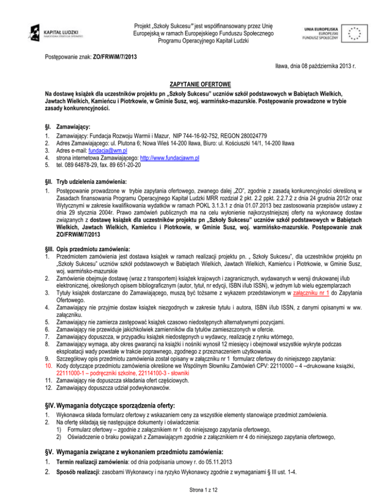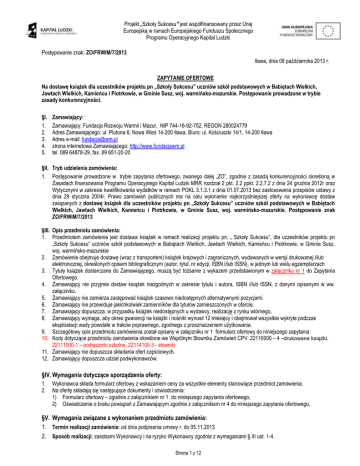 Projekt „Szkoły Sukcesu” jest współfinansowany przez Unię Europejską w ramach Europejskiego Funduszu Społecznego Programu Operacyjnego Kapitał Ludzki Postępowanie znak: ZO/FRWiM/7/2013 Iława, dnia 08 października 2013 r. ZAPYTANIE OFERTOWE Na dostawę książek dla uczestników projektu pn „Szkoły Sukcesu” uczniów szkół podstawowych w Babiętach Wielkich, Jawtach Wielkich, Kamieńcu i Piotrkowie, w Gminie Susz, woj. warmińsko-mazurskie. Postępowanie prowadzone w trybie zasady konkurencyjności. §I. 1. 2. 3. 4. 5. Zamawiający: Zamawiający: Fundacja Rozwoju Warmii i Mazur, NIP 744-16-92-752, REGON 280024779 Adres Zamawiającego: ul. Plutona 6; Nowa Wieś 14-200 Iława, Biuro: ul. Kościuszki 14/1, 14-200 Iława Adres e-mail: [email protected] strona internetowa Zamawiającego: http://www.fundacjawm.pl tel. 089 64878-29, fax. 89 651-20-20 §II. Tryb udzielenia zamówienia: 1. Postępowanie prowadzone w trybie zapytania ofertowego, zwanego dalej „ZO”, zgodnie z zasadą konkurencyjności określoną w Zasadach finansowania Programu Operacyjnego Kapitał Ludzki MRR rozdział 2 pkt. 2.2 ppkt. 2.2.7.2 z dnia 24 grudnia 2012r oraz Wytycznymi w zakresie kwalifikowania wydatków w ramach POKL 3.1.3.1 z dnia 01.07.2013 bez zastosowania przepisów ustawy z dnia 29 stycznia 2004r. Prawo zamówień publicznych ma na celu wyłonienie najkorzystniejszej oferty na wykonawcę dostaw związanych z dostawę książek dla uczestników projektu pn „Szkoły Sukcesu” uczniów szkół podstawowych w Babiętach Wielkich, Jawtach Wielkich, Kamieńcu i Piotrkowie, w Gminie Susz, woj. warmińsko-mazurskie. Postępowanie znak ZO/FRWiM/7/2013 §III. Opis przedmiotu zamówienia: 1. Przedmiotem zamówienia jest dostawa książek w ramach realizacji projektu pn. „ Szkoły Sukcesu”, dla uczestników projektu pn „Szkoły Sukcesu” uczniów szkół podstawowych w Babiętach Wielkich, Jawtach Wielkich, Kamieńcu i Piotrkowie, w Gminie Susz, woj. warmińsko-mazurskie 2. Zamówienie obejmuje dostawę (wraz z transportem) książek krajowych i zagranicznych, wydawanych w wersji drukowanej i/lub elektronicznej, określonych opisem bibliograficznym (autor, tytuł, nr edycji, ISBN i/lub ISSN), w jednym lub wielu egzemplarzach 3. Tytuły książek dostarczane do Zamawiającego, muszą być tożsame z wykazem przedstawionym w załączniku nr 1 do Zapytania Ofertowego. 4. Zamawiający nie przyjmie dostaw książek niezgodnych w zakresie tytułu i autora, ISBN i/lub ISSN, z danymi opisanymi w ww. załączniku. 5. Zamawiający nie zamierza zastępować książek czasowo niedostępnych alternatywnymi pozycjami. 6. Zamawiający nie przewiduje jakichkolwiek zamienników dla tytułów zamieszczonych w ofercie. 7. Zamawiający dopuszcza, w przypadku książek niedostępnych u wydawcy, realizację z rynku wtórnego, 8. Zamawiający wymaga, aby okres gwarancji na książki i nośniki wynosił 12 miesięcy i obejmował wszystkie wykryte podczas eksploatacji wady powstałe w trakcie poprawnego, zgodnego z przeznaczeniem użytkowania. 9. Szczegółowy opis przedmiotu zamówienia został opisany w załączniku nr 1 formularz ofertowy do niniejszego zapytania: 10. Kody dotyczące przedmiotu zamówienia określone we Wspólnym Słowniku Zamówień CPV: 22110000 – 4 –drukowane książki, 22111000-1 – podręczniki szkolne, 22114100-3 - słowniki 11. Zamawiający nie dopuszcza składania ofert częściowych. 12. Zamawiający dopuszcza udział podwykonawców. §IV. Wymagania dotyczące sporządzenia oferty: 1. 2. Wykonawca składa formularz ofertowy z wskazaniem ceny za wszystkie elementy stanowiące przedmiot zamówienia. Na ofertę składają się następujące dokumenty i oświadczenia: 1) Formularz ofertowy – zgodnie z załącznikiem nr 1 do niniejszego zapytania ofertowego, 2) Oświadczenie o braku powiązań z Zamawiającym zgodnie z załącznikiem nr 4 do niniejszego zapytania ofertowego, §V. Wymagania związane z wykonaniem przedmiotu zamówienia: 1. Termin realizacji zamówienia: od dnia podpisania umowy r. do 05.11.2013 2. Sposób realizacji: zasobami Wykonawcy i na ryzyko Wykonawcy zgodnie z wymaganiami § III ust. 1-4. Strona 1 z 12 Projekt „Szkoły Sukcesu” jest współfinansowany przez Unię Europejską w ramach Europejskiego Funduszu Społecznego Programu Operacyjnego Kapitał Ludzki 3. Miejsce realizacji: Przedmiot zamówienia będzie dostarczony do: 4. 1) Szkoła Podstawowa im. Ziemi Suskiej, Babięty Wielkie 31, 14-240 Susz 2) Szkoła Podstawowa w Piotrkowie, Piotrkowo 45, 14-240 Susz 3) Szkoła Podstawowa w Jawtach Wielkich, Jawty Wielkie 6, 14-240 Susz 4) Szkoła Podstawowa w Kamieńcu, Kamieniec, 14-240 Susz Sposób obliczenia ceny: 1) Wykonawca określi cenę na wszystkie elementy przedmiotu zamówienia niezbędne do zrealizowania zamówienia. Zamawiający nie dopuszcza składania ofert częściowych. 2) Zaproponowana i ustalona w ofercie cena jest ceną ryczałtową (zawierającą obowiązujący podatek VAT i nie zmienną do zakończenia realizacji dostaw) zgodnie z ustawą z dnia 23 kwietnia 1964 roku Kodeks cywilny (Dz. U.64.16.93 z późn. zm.) ten rodzaj wynagrodzenia określa w art. 632 kc 3) W związku z sytuacją określoną w ust. 4 pkt 2) cena musi zawierać wszelkie koszty niezbędne do zrealizowania zamówienia tym m.in. koszty transportu, zabezpieczenia na czas transportu itp.. 4) Wykonawca musi uwzględnić wszystkie podatki, cła i inne koszty, które będą opłacane przez Wykonawcę w ramach umowy, powinny być doliczone do stawek, cen i ceny ostatecznej ustalonej przez wykonawcę w ofercie. 5) Należy przewidzieć cały przebieg dostaw, a wszystkie utrudnienia wynikające z warunków realizacji Wykonawca winien uwzględnić w zaproponowanej cenie. 6) Zamawiający nie przewiduje waloryzacji wynagrodzenia (cen jednostkowych) przez okres realizacji zamówienia. 7) Wykonawcy otrzyma wynagrodzenie tylko za zrealizowane (wykorzystane) dostawy. 8) W przypadku osób f