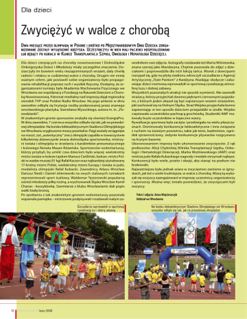 $LADZIECI :WYCIÇYÃWWALCEZCHOROB DWA MIESIĄCE PRZED OLIMPIADĄ W PEKINIE I KRÓTKO PO MIĘDZYNARODOWYM DNIU DZIECKA ZORGANIZOWANE ZOSTAŁY WYJĄTKOWE IGRZYSKA. UCZESTNICZYLI W NICH MALI PACJENCI HOSPITALIZOWANI LUB BĘDĄCY PO KURACJI W KLINICE TRANSPLANTACJI SZPIKU, ONKOLOGII I HEMATOLOGII DZIECIĘCEJ. Dla dzieci cierpiących na choroby nowotworowe I Dolnośląskie Onkoigrzyska Dzieci i Młodzieży miały szczególne znaczenie. Dostarczyły im bowiem wielu niezapomnianych wrażeń, dały chwilę radości i relaksu w codziennej walce z chorobą. Drugim nie mniej ważnym celem, jaki postawili sobie organizatorzy było propagowanie rehabilitacji poprzez ruch i wysiłek fizyczny. Dodajmy, że organizatorami turnieju była Akademia Wychowania Fizycznego we Wrocławiu we współpracy z Fundacją na Ratunek Dzieciom z Chorobą Nowotworową. Patronat medialny nad imprezą objął regionalny ośrodek TVP oraz Polskie Radio Wrocław. Na jego antenie w dniu zawodów odbyła się licytacja rzeźby podarowanej przez znanego wrocławskiego plastyka, Stanisława Wysockiego, autora m. in. „Powodzianki”. W znakomitym gronie sponsorów znalazła się również EnergiaPro. W dniu zawodów, 7 czerwca wszystko odbyło się tak, jak na prawdziwej olimpiadzie. Na boisku lekkoatletycznym Stadionu Olimpijskiego we Wrocławiu wygłoszono mowy powitalne. Flagi zostały wciągnięte na maszt, zaś „autentyczny” znicz olimpijski zapaliła w towarzystwie kilkuletniej dziewczynki znana dolnośląska sportsmenka, mistrzyni świata i olimpijska w strzelaniu z karabinków pneumatycznego i kulowego Renata Mauer-Różańska. Sportowców-wolontariuszy, którzy przybyli, by umilić czas dzieciom było więcej: wielokrotny mistrz świata w boksie tajskim Mariusz Cieśliński, bokser, mistrz Polski w wadze muszej (51 kg) Rafał Kaczor oraz najbardziej utytułowany 17-krotny mistrz Polski, wielokrotny mistrz Europy i świata w judo, medalista olimpijski Rafał Kubacki. Zawodnicy Atlasu Wrocław Dariusz Śledź i Daniel Jeleniewski na swych stalowych rumakach reprezentowali sport żużlowy, Waldemar Tęsiorowski popularną wśród młodzieży piłkę nożną, a wychowanek Śląska Wrocław Kamil Chanas - koszykówkę. Szermierze z klubu Wrocławianin dali popis walki białą bronią. Po spotkaniu z tak znakomitym gronem wolontariuszy pozostała wspaniała pamiątka – mistrzowie podpisywali i rozdawali małym za- wodnikom swe zdjęcia. Autografy rozdawała też Marta Wiśniewska, znana szerzej jako Mandaryna. Chętnie pozowała do zdjęć z dzieciakami i poprowadziła dla nich lekcję tańca. Worek z dowcipami rozsypał się, gdy na płytę stadionu wkroczyli szczudlarze z Agencji Artystycznej „Teatr Pantom” z Kwidzyna. Rozdając słodycze i zabawiając dzieci rozmową wprowadzili w sportową rywalizację atmosferę luzu i dobrej zabawy. Wszystkich pozostałych atrakcji nie sposób wymienić. Nie zawiedli strażacy, którzy przyjechali dwoma pięknymi czerwonymi pojazdami, z których jeden okazał się być najstarszym wozem strażackim, jaki zachował się na Dolnym Śląsku. Straż Miejska przyjechała konno zapewniając w ten sposób dzieciom przejażdżki w siodle. Wojsko częstowało uczestników pachnącą grochówką. Studentki AWF malowały buzie uczestników w bajeczne wzory. Rywalizacja sportowa była zacięta i przebiegała na wielu płaszczyznach. Dominowały konkurencje lekkoatletyczne i inne związane z ruchem na świeżym powietrzu, takie jak tenis, badminton, ogródek sprawnościowy. Jedynie konkurencje pływackie rozgrywano na krytym basenie. Ukoronowaniem imprezy było uhonorowanie zwycięzców. Z rąk profesorów: Alicji Chybickiej (Klinika Transplantacji Szpiku, Onkologii i Hematologii Dziecięcej), Marka Woźniewskiego (AWF) oraz mistrza judo Rafała Kubackiego nagrody i medale otrzymali najlepsi. Konkurencji było wiele, przeto i okazji, aby stanąć na podium nie brakowało. Najważniejsza była jednak wiara w zwycięstwo zarówno w igrzyskach, jak też o wiele trudniejsze, w walce z chorobą. Wiarą tą wykazali się wszyscy zaangażowani w imprezę: uczestnicy, organizatorzy i sponsorzy. Można więc śmiało powiedzieć, że zwycięzcami byli wszyscy. 3ZCZUDLARZEWPROWADZILIWSPORTOW RYWALIZACJÇLUZIDOBRZABAWÇ .ABOISKULEKKOATLETYCZNYM3TADIONU/LIMPIJSKIEGOWE7ROCAWIU WSZYSTKOODBYOSIÇTAKJAKNAPRAWDZIWEJOLIMPIADZIE .!3:!%.%2')!LIPIEC Tekst i zdjęcia: Anna Wojcieszczyk Oddział we Wrocławiu