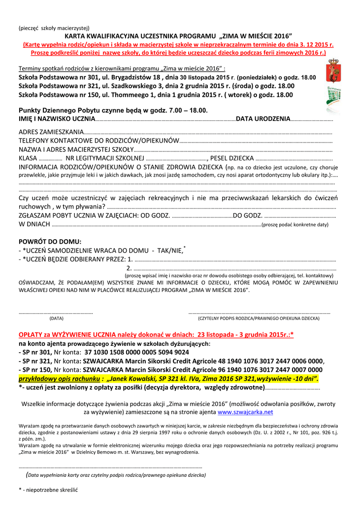 (pieczęć szkoły macierzystej) KARTA KWALIFIKACYJNA UCZESTNIKA PROGRAMU „ZIMA W MIEŚCIE 2016” (Kartę wypełnia rodzic/opiekun i składa w macierzystej szkole w nieprzekraczalnym terminie do dnia 3. 12 2015 r. Proszę podkreślić poniżej nazwę szkoły, do której będzie uczęszczać dziecko podczas ferii zimowych 2016 r.) Terminy spotkań rodziców z kierownikami programu „Zima w mieście 2016” : Szkoła Podstawowa nr 301, ul. Brygadzistów 18 , dnia 30 listopada 2015 r. (poniedziałek) o godz. 18.00 Szkoła Podstawowa nr 321, ul. Szadkowskiego 3, dnia 2 grudnia 2015 r. (środa) o godz. 18.00 Szkoła Podstawowa nr 150, ul. Thommeego 1, dnia 1 grudnia 2015 r. ( wtorek) o godz. 18.00 Punkty Dziennego Pobytu czynne będą w godz. 7.00 – 18.00. IMIĘ I NAZWISKO UCZNIA…………………………………………………………………………………………DATA URODZENIA…………………………. ADRES ZAMIESZKANIA……………………………………………………………………………………………………………..………………………………………………. TELEFONY KONTAKTOWE DO RODZICÓW/OPIEKUNÓW…………………………………………..……………………………………………………. NAZWA I ADRES MACIERZYSTEJ SZKOŁY………………………………………………………………….………………………………………………………….. KLASA ……..……… NR LEGITYMACJI SZKOLNEJ ………………………….…………., PESEL DZIECKA ……………………………………………….. INFORMACJA RODZICÓW/OPIEKUNÓW O STANIE ZDROWIA DZIECKA (np. na co dziecko jest uczulone, czy choruje przewlekle, jakie przyjmuje leki i w jakich dawkach, jak znosi jazdę samochodem, czy nosi aparat ortodontyczny lub okulary itp.):…. ……………………………………………………………………………………………………………………………………………………….…………………..……………………………. …………………………………………………………………………………………………………………………………………………………………………………………………………… Czy uczeń może uczestniczyć w zajęciach rekreacyjnych i nie ma przeciwwskazań lekarskich do ćwiczeń ruchowych , w tym pływania? ………………………………………………………………………………………………………………………………………..……….. ZGŁASZAM POBYT UCZNIA W ZAJĘCIACH: OD GODZ. …………….……………………….DO GODZ. …………….……………………………… W DNIACH …………………………………………………………………………….……………………………………………………….(proszę podać konkretne daty) POWRÓT DO DOMU: - *UCZEŃ SAMODZIELNIE WRACA DO DOMU - TAK/NIE,* - *UCZEŃ BĘDZIE ODBIERANY PRZEZ: 1. ………………………………………………………………………………………………..……………………………… 2. …………..……………………………………………………………………………………………………………………. (proszę wpisać imię i nazwisko oraz nr dowodu osobistego osoby odbierającej, tel. kontaktowy) OŚWIADCZAM, ŻE PODAŁAM(EM) WSZYSTKIE ZNANE MI INFORMACJE O DZIECKU, KTÓRE MOGĄ POMÓC W ZAPEWNIENIU WŁAŚCIWEJ OPIEKI NAD NIM W PLACÓWCE REALIZUJĄCEJ PROGRAM „ZIMA W MIEŚCIE 2016”. ……………………………………………… ………………………………………….……………………………………………… (DATA) (CZYTELNY PODPIS RODZICA/PRAWNEGO OPIEKUNA DZIECKA) OPŁATY za WYŻYWIENIE UCZNIA należy dokonać w dniach: 23 listopada - 3 grudnia 2015r.:* na konto ajenta prowadzącego żywienie w szkołach dyżurujących: - SP nr 301, Nr konta: 37 1030 1508 0000 0005 5094 9024 - SP nr 321, Nr konta: SZWAJCARKA Marcin Sikorski Credit Agricole 48 1940 1076 3017 2447 0006 0000, - SP nr 150, Nr konta: SZWAJCARKA Marcin Sikorski Credit Agricole 96 1940 1076 3017 2447 0007 0000 przykładowy opis rachunku : „Janek Kowalski, SP 321 kl. IVa, Zima 2016 SP 321,wyżywienie -10 dni”. *- uczeń jest zwolniony z opłaty za posiłki (decyzja dyrektora, względy zdrowotne)…………………………………. Wszelkie informacje dotyczące żywienia podczas akcji „Zima w mieście 2016” (możliwość odwołania posiłków, zwroty za wyżywienie) zamieszczone są na stronie ajenta www.szwajcarka.net Wyrażam zgodę na przetwarzanie danych osobowych zawartych w niniejszej karcie, w zakresie niezbędnym dla bezpieczeństwa i ochrony zdrowia dziecka, zgodnie z postanowieniami ustawy z dnia 29 sierpnia 1997 roku o ochronie danych osobowych (Dz. U. z 2002 r., Nr 101, poz. 926 t.j. z późn. zm.). Wyrażam zgodę na utrwalanie w formie elektronicznej wizerunku mojego dziecka oraz jego rozpowszechniania na potrzeby realizacji programu „Zima w mieście 2016” w Dzielnicy Bemowo m. st. Warszawy, bez wynagrodzenia. ……..……………………………….……….…………………………………………………………………… (Data wypełniania karty oraz czytelny podpis rodzica/prawnego opiekuna dziecka) * - niepotrzebne skreślić