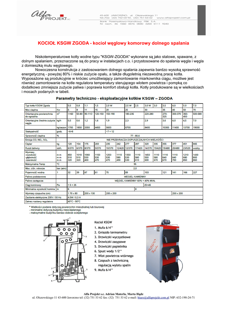 KOCIOŁ KSGW ZGODA - kocioł węglowy komorowy dolnego spalania Niskotemperaturowe kotły wodne typu "KSGW-ZGODA" wykonane są jako stalowe, spawane, z dolnym spalaniem, przeznaczone są do pracy w instalacjach c.o. i przystosowane do spalania węgla i węgla z domieszką mułu węglowego. Nowoczesna konstrukcja z zastosowaniem dolnego spalania zapewnia bardzo wysoką sprawność energetyczną - powyżej 80% i niskie zużycie opału, a także długoletnią niezawodną pracę kotła. Wyposażone są produkcyjnie w króciec umożliwiający zamontowanie miarkownika ciągu, możliwe jest również zamontowanie na kotle regulatora temperatury sterującego wlotem powietrza i pompką co dodatkowo zmniejsza zużycie paliwa i poprawia komfort obsługi kotła. Kotły produkowane są w wielkościach i mocach podanych w tabeli. Alfa Projekt s.c. Adrian Materla, Marta Hądz ul. Olszewskiego 11 43-600 Jaworzno tel: (32) 751 53 62 fax: (32) 751 53 62 e-mail: [email protected] NIP: 632-190-24-71