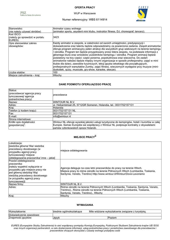 OFERTA PRACY WUP w Warszawie Numer referencyjny: WBS 6114914 Stanowisko: (nie należy używać skrótów) Kod ISCO: (należy go sprawdzić w portalu EURES) Opis stanowiska/ zakres obowiązków: Liczba etatów: Miejsce zatrudnienia – kraj: Animator czasu wolnego (animator sportu, asystent mini klubu, instruktor fitness, DJ, choreograf, tancerz). 3423 Każdy animator w zespole, w zależności od swoich umiejętności, predyspozycji i doświadczenia oraz talentu będzie odpowiedzialny za powierzone zadania. Zespół animatorów oferuje program animacyjny pełen atrakcji dla wszystkich grup wiekowych na terenie kempingu / ośrodka. Program ten będzie przygotowany przez lidera zespołu, na podstawie informacji z głównego biura oraz wniosków uczestników kempingu / ośrodka. Program animacji będzie podzielony na trzy części: część poranna, popołudniowa oraz wieczorna. Do zadań animatorów należeć będzie między innymi organizacja w sposób profesjonalny: zajęć w mini klubie dla dzieci, zawodów łuczniczych, lekcji języka włoskiego dla początkujących, profesjonalnych warsztatów Zumby, zajęć fitness, wieczornych występów przy muzyce (minidyskoteki, quizy, musicale, gry-show, karaoke, skecze). 100 Włochy DANE PODMIOTU OFERUJĄCEGO PRACĘ Status: (pracodawca/ agencja pracy tymczasowej/ agencja pośrednictwa pracy) Nazwa: Adres: Kraj: Telefon (z kodem kraju): Fax: E-mail: Strona internetowa: Krótki opis działalności gospodarczeji: pracodawca WINTOUR NL B.V. ul. Heikantstraat 25, 5712GR Someren, Holandia, tel.: 0031702157131 Holandia 0031702157131 NL 0031702157131 [email protected] Wintour NL oferuje wysokiej jakości usługi turystyczne do kempingów, hoteli i kurortów w całej Europie. Samac Eurojobs we współpracy z Wintour NL podpisuje kontrakty z obywatelami państw członkowskich spoza Holandii. MIEJSCE PRACYii Lokalizacja: [siedziba główna/ filia/ siedziba pracodawcy docelowego (w przypadku agencji pracy tymczasowej)/ miejsce oddelegowania pracownika/ inne – jakie] Powód oddelegowania pracownika: [należy wypełnić wyłącznie w przypadku gdy miejsce pracy nie jest główną siedzibą/ filią/ siedzibą pracodawcy docelowego (w przypadku agencji pracy tymczasowej)] Nazwa firmy: Adres: Kraj: miejsce oddelegowania Agencja deleguje na czas letni pracowników do pracy na terenie Włoch. Miejsce pracy to różne ośrodki na terenie Północnych Włoch (Lombardia, Toskania, Sardynia, Veneto, Trentino) http://www.wintour.it/Wintour/Dove-Lavoriamo WINTOUR NL B.V. Różne ośrodki na terenie Północnych Włoch (Lombardia, Toskania, Sardynia, Veneto, Trentino)., Różne ośrodki na terenie Północnych Włoch (Lombardia, Toskania, Sardynia, Veneto, Trentino)., Włochy Włochy WYMAGANIA Wykształcenie: Doświadczenie zawodowe: Znajomość języków: średnie ogólnokształcące Język Mile widziane wykształcenie związane z turystyką. Poziom EURES (Europejskie Służby Zatrudnienia) to sieć współpracy pomiędzy Komisją Europejską, Publicznymi Służbami Zatrudnienia krajów UE/ EOG oraz innych organizacji partnerskich, w celu dostarczania informacji, usług pośrednictwa pracy i poradnictwa zawodowego dla pracodawców i pracowników chcących skorzystać z zasady wolnego przepływu osób 1. angielski 1. dobry w mowie dobry w piśmie 2. podstawowy w mowie podstawowy w piśmie 3. podstawowy w mowie podstawowy w piśmie 2. niemiecki 3. włoski Uprawnienia/ dyplomy/ dokumenty (np. prawo jazdy): Inne istotne wymagania: instruktor fitness Mile widziane doświadczenie w turystyce, ale nie konieczne. Wszelkie dyplomy mile widziane. W przypadku instruktora fitness oraz instruktora sportowego wymagane uprawnienia/dyplomy. Kandydaci powinni znać język angielski w stopniu co najmniej dobrym (B1-B2) oraz dodatkowo język niemiecki lub włoski w stopniu podstawowym/średniozaawansowanym (A1-A2). WYNAGRODZENIE I WARUNKI ZATRUDNIENIA Wysokość pensji brutto: Wysokość pensji netto: Waluta, w jakiej wypłacana jest pensja: Rodzaj stawki wynagrodzenia: (godzinowa/ tygodniowa/ miesięczna/ roczna/ inna) Premie: Dodatkowe świadczenia (zakwaterowanie, wyżywienie, koszty związane ze zmianą miejsca zamieszkania, koszty podróży itp.): Nazwa firmy, z którą zostanie podpisana umowa: Rodzaj umowy: (umowa o pracę, umowa zlecenia, wolontariat, praktyka zawodowa/ staż, praca zdalna, agencja pracy tymczasowej, inne): Wymiar czasu pracy (praca na pełen etat/ część etatu): Czas trwania umowy: (nieokreślony/ określony) 600,00 Liczba godzin tygodniowo: Zmiany i praca w dni wolne: Data rozpoczęcia: Inne informacje: 40,00 2015-05-01 Data rozpoczęcia pracy w zależności od kandydata. Praca od Maja do Października 2015r. Pracodawca wymaga dostępności przez min. 2 miesiące. Euro Czasowy ze stawką miesięczną wyżywienie na koszt pracodawcy, zakwaterowanie na koszt pracodawcy, pracodawca pokrywa koszty przyjazdu do Polski, Pracodawca zapewnia: zakwaterowanie, 3 posiłki dziennie, 1 dzień wolny tygodniowo, zwrot kosztów podróży na koniec kontraktu w wysokości 100 Euro. WINTOUR NL B.V. umowa z agencją - dotyczy pracy tymczasowej część etatu Data wygaśnięcia umowy (w przypadku umowy na czas określony): określony 2015-10-01 Wynagrodzenie od: 600-1350 euro brutto miesięcznie SPOSÓB SKŁADANIA WNIOSKU Wymagane dokumenty (list motywacyjny, CV itp.): Język, w którym muszą być sporządzone przedkładane dokumenty: Do kogo należy wysłać dokumenty: (do pracodawcy/ doradcy EURES) Gdzie należy wysłać dokumenty: (adres, adres e-mail, nr faksu z kodem kraju itp.) Dane teleadresowe doradcy EURES lub przedstawiciela pracodawcy: (nazwisko, adres, telefon, fax, e-mail itp.) CV wraz ze zdjęciem angielski włoski do agencji Należy wypełnić formularz aplikacyjny na stronie pracodawcy: http://hrd.wintour.it/Register.aspx Należy wypełnić formularz aplikacyjny na stronie pracodawcy: http://hrd.wintour.it/Register.aspx DODATKOWE INFORMACJE Rozmowy rekrutacyjne 