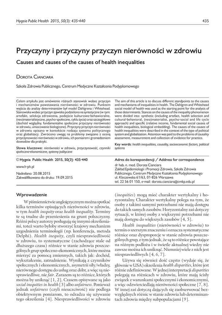 Cianciara Hygeia Public D. Health Przyczyny 2015, i przyczyny 50(3): 435-440 przyczyn nierówności w zdrowiu 435 Przyczyny i przyczyny przyczyn nierówności w zdrowiu Causes and causes of the causes of health inequalities Dorota Cianciara Szkoła Zdrowia Publicznego, Centrum Medyczne Kształcenia Podyplomowego Celem artykułu jest omówienie różnych stanowisk wobec przyczyn i mechanizmów powstawania nierówności w zdrowiu. Punktem wyjścia do analizy determinantów był model Dahlgrena i Whitehead. Stanowiska wobec przyczyn zjawiska podzielono na syntetyczne (w tym: artefakt, selekcja zdrowotna, podejście kulturowo-behawioralne, (neo)materialistyczne, psycho-społeczne, cyklu życia) oraz szczegółowe (dochód względny, fundamentalne społeczne przyczyny nierówności w zdrowiu, umocowanie biologiczne). Przyczyny przyczyn nierówności w zdrowiu opisano w kontekście rodzaju systemu politycznego oraz globalizacji. Zwrócono uwagę na problemy związane z oceną przyczynowości nierówności w zdrowiu, ich pomiarem i gromadzeniem dowodów dla praktyki. Słowa kluczowe: nierówności w zdrowiu, przyczynowość, czynniki społeczno-ekonomiczne, systemy polityczne The aim of this article is to discuss different standpoints to the causes and mechanisms of inequalities in health. The Dahlgren and Whitehead social model of health was used as the starting point for the analysis of those determinants. Stances on the causes of the inequality phenomenon were divided into: synthetic (including artefact, health selection and cultural-behavioral, (neo)materialist, psycho-social and life cycle approach) and specific (relative income, fundamental social causes of health inequalities, biological embedding). The causes of the causes of health inequalities were described in the context of the type of political system and globalization. Attention was paid to the problems of causality assessment, measurement and collection of evidence for practice. Key words: health inequalities, causality, socioeconomic factors, political systems © Hygeia Public Health 2015, 50(3): 435-440 Adres do korespondencji / Address for correspondence www.h-ph.pl dr hab. n. med. Dorota Cianciara Zakład Epidemiologii i Promocji Zdrowia, Szkoła Zdrowia Publicznego, Centrum Medyczne Kształcenia Podyplomowego ul. Kleczewska 61/63, 01-826 Warszawa tel. 22 56 01 150, e-mail: [email protected] Nadesłano: 20.08.2015 Zakwalifikowano do druku: 19.09.2015 Wprowadzenie W piśmiennictwie anglojęzycznym można spotkać kilka terminów opisujących nierówności w zdrowiu, w tym health inequity oraz health inequality. Terminy te są trudne do przeniesienia na grunt polszczyzny. Różni polscy autorzy posługują się innymi określeniami, toteż warto byłoby stworzyć krajowy mechanizm uzgodnienia terminologii (np. konferencja, metoda Delphi). Health inequity, czyli niesprawiedliwość w zdrowiu, to systematyczne (zachodzące stale od dłuższego czasu) różnice w stanie zdrowia poszczególnych grup społeczno-ekonomicznych, które można mierzyć za pomocą zmiennych, takich jak: dochód, wykształcenie, zatrudnienie. Wynikają z czynników społecznych i ekonomicznych, asymetrii siły/władzy, nierównego dostępu do usług oraz dóbr, a więc są niesprawiedliwe, nie fair. Zarazem są to różnice, których można by uniknąć [1, 2]. Czasem opisywane są jako social inequities in health [3] albo unfairness. Ponieważ jednak unfairness (czyli nieuczciwość) nie podlega obiektywnym pomiarom, to odradza się używanie tego określenia [4]. Niesprawiedliwości w zdrowiu (inequities) mogą mieć charakter wertykalny i horyzontalny. Charakter wertykalny polega na tym, że osoby z takimi samymi potrzebami nie mają dostępu do takich samych zasobów. Horyzontalny zaś dotyczy sytuacji, w której osoby z większymi potrzebami nie mają dostępu do większych zasobów [4, 5]. Health inequalities (nierówności w zdrowiu) to termin o szerszym znaczeniu i oznacza systematyczne różnice oraz dysproporcje w stanie zdrowia poszczególnych grup, z tym jednak, że są to różnice powstające na różnym podłożu i w świetle aktualnej wiedzy nie zawsze można ich uniknąć. Niemniej wiele z nich jest niesprawiedliwych [4, 6, 7]. Używa się również dość często (wydaje się, że głównie w USA) określenia health disparities, które jest różnie zdefiniowane. W jednej interpretacji disparities polegają na różnicach w zdrowiu, które mają ścisły związek z warunkami społecznymi i ekonomicznymi, a więc odzwierciedlają nierówności społeczne [7, 8]. W innej zaś dotyczą dających się zaobserwować bezwzględnych różnic w stanie zdrowia lub determinantach zdrowia między subpopulacjami [9]. Hygeia Public Health 2015, 50(3): 435-440 436 Należy podkreślić, że wiele języków nie oddaje tych niuansów, a liczni autorzy z obszarów anglojęzycznych podkreślają, że terminy te używane są zamiennie. Obecnie w piśmiennictwie najczęściej spotyka się health inequalities. Termin health inequities ma wyraźny podkład moralny. W niniejszym opracowaniu posługiwano się terminem „nierówności w zdrowiu”, przez który rozumiano systematyczne różnice w stanie zdrowia poszczególnych grup społecznych powstające na podłożu czynników społecznych i ekonomicznych. Celem tego artykułu jest przedstawienie różnych stanowisk wobec przyczyn i mechanizmów powstawania nierówności w zdrowiu. Determinanty nierówności w zdrowiu Zrozumienie istoty nierówności w zdrowiu wymaga odejścia od tzw. modelu Lalonde’a. Patrząc retrospekcyjnie, model zaprezentowany w raporcie Lalonde’a odegrał istotną rolę w rozumieniu logiki tzw. pola zdrowia (health field) [10]. W raporcie wyróżniono cztery elementy owego pola, tj.: czynniki biologiczne (human biology), środowisko bytowania (environment), styl życia (life style) oraz organizację opieki zdrowotnej (health care organization). Stwierdzono, że dotychczasowe wysiłk