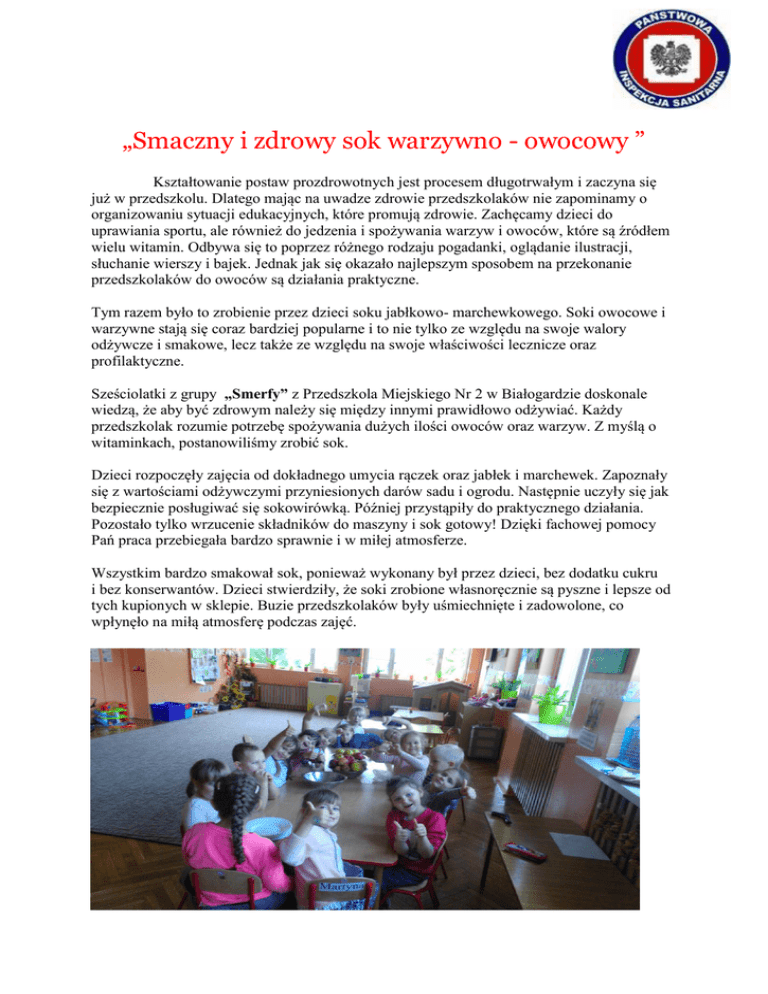 „Smaczny i zdrowy sok warzywno - owocowy ” Kształtowanie postaw prozdrowotnych jest procesem długotrwałym i zaczyna się już w przedszkolu. Dlatego mając na uwadze zdrowie przedszkolaków nie zapominamy o organizowaniu sytuacji edukacyjnych, które promują zdrowie. Zachęcamy dzieci do uprawiania sportu, ale również do jedzenia i spożywania warzyw i owoców, które są źródłem wielu witamin. Odbywa się to poprzez różnego rodzaju pogadanki, oglądanie ilustracji, słuchanie wierszy i bajek. Jednak jak się okazało najlepszym sposobem na przekonanie przedszkolaków do owoców są działania praktyczne. Tym razem było to zrobienie przez dzieci soku jabłkowo- marchewkowego. Soki owocowe i warzywne stają się coraz bardziej popularne i to nie tylko ze względu na swoje walory odżywcze i smakowe, lecz także ze względu na swoje właściwości lecznicze oraz profilaktyczne. Sześciolatki z grupy „Smerfy” z Przedszkola Miejskiego Nr 2 w Białogardzie doskonale wiedzą, że aby być zdrowym należy się między innymi prawidłowo odżywiać. Każdy przedszkolak rozumie potrzebę spożywania dużych ilości owoców oraz warzyw. Z myślą o witaminkach, postanowiliśmy zrobić sok. Dzieci rozpoczęły zajęcia od dokładnego umycia rączek oraz jabłek i marchewek. Zapoznały się z wartościami odżywczymi przyniesionych darów sadu i ogrodu. Następnie uczyły się jak bezpiecznie posługiwać się sokowirówką. Później przystąpiły do praktycznego działania. Pozostało tylko wrzucenie składników do maszyny i sok gotowy! Dzięki fachowej pomocy Pań praca przebiegała bardzo sprawnie i w miłej atmosferze. Wszystkim bardzo smakował sok, ponieważ wykonany był przez dzieci, bez dodatku cukru i bez konserwantów. Dzieci stwierdziły, że soki zrobione własnoręcznie są pyszne i lepsze od tych kupionych w sklepie. Buzie przedszkolaków były uśmiechnięte i zadowolone, co wpłynęło na miłą atmosferę podczas zajęć.