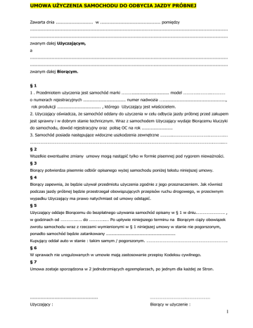 UMOWA UŻYCZENIA SAMOCHODU DO ODBYCIA JAZDY PRÓBNEJ Zawarta dnia ............................. w ............................................... pomiędzy .......................................................................................................................................................... .......................................................................................................................................................... zwanym dalej Użyczającym, a .......................................................................................................................................................... .......................................................................................................................................................... zwanym dalej Biorącym. §1 1 . Przedmiotem użyczenia jest samochód marki ………............................. model ………….………..………… o numerach rejestracyjnych ................................. numer nadwozia …................................................., rok produkcji .................................. , którego Użyczający jest właścicielem. 2. Użyczający oświadcza, że samochód oddany do użyczenia w celu odbycia jazdy próbnej przed zakupem jest sprawny i w dobrym stanie technicznym. Wraz z samochodem Użyczający wydaje Biorącemu kluczyki do samochodu, dowód rejestracyjny oraz polisę OC na rok ........................ 3. Samochód posiada następujące widoczne uszkodzenia zewnętrzne ………..………………………….………….… ……………………………………………………………………………………………………………….………………………….……...… §2 Wszelkie ewentualne zmiany umowy mogą nastąpić tylko w formie pisemnej pod rygorem nieważności. §3 Biorący potwierdza pisemnie odbiór opisanego wyżej samochodu poniżej tekstu niniejszej umowy. §4 Biorący zapewnia, że będzie używał przedmiotu użyczenia zgodnie z jego przeznaczeniem. Jak również podczas jazdy próbnej będzie przestrzegał obowiązujących przepisów ruchu drogowego, w przeciwnym wypadku Użyczający ma prawo natychmiast od umowy odstąpić. §5 Użyczający oddaje Biorącemu do bezpłatnego używania samochód opisany w § 1 w dniu……………………. , w godzinach od …………..…. do …………..… Po upływie niniejszego terminu na Biorącym ciąży obowiązek zwrotu samochodu wraz z rzeczami wymienionymi w § 1 niniejszej umowy w stanie nie pogorszonym, ponadto samochód będzie zatankowany ...................................................... Kupujący oddał auto w stanie : takim samym / pogorszonym. ……………………………………………………………. §6 W sprawach nie uregulowanych w umowie mają zastosowanie przepisy Kodeksu cywilnego. §7 Umowa zostaje sporządzona w 2 jednobrzmiących egzemplarzach, po jednym dla każdej ze Stron. ..................................................... ………………………….………………… Użyczający : Biorący w użyczenie : 1