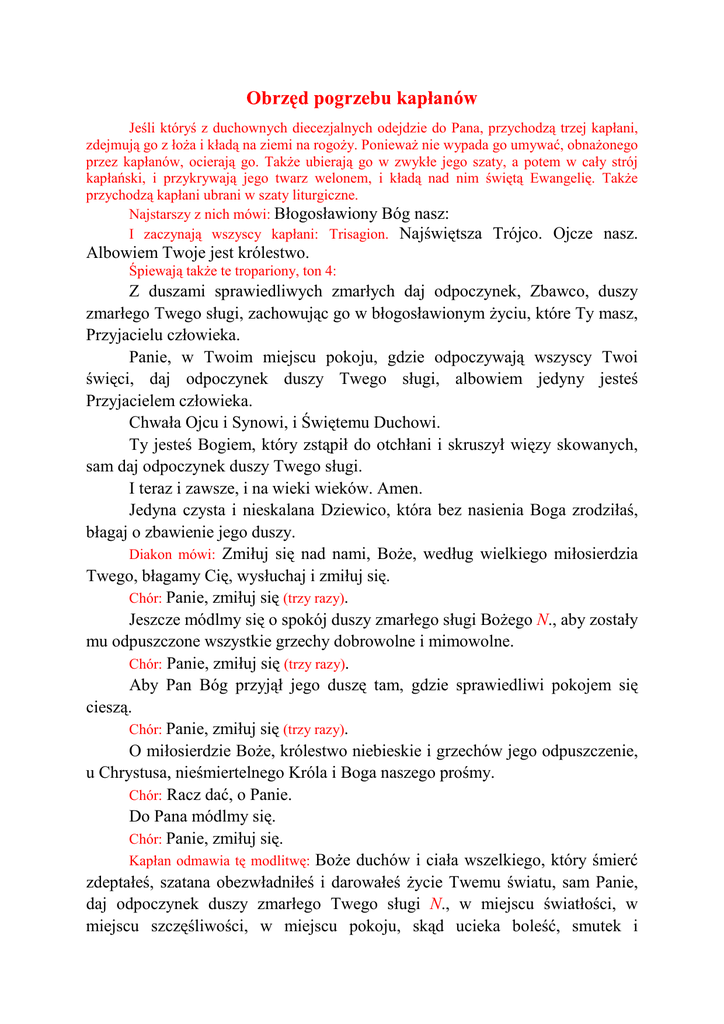 Jeśli któryś z duchownych diecezjalnych odejdzie do Pana, przychodzą trzej kapłani, zdejmują go z łoża i kładą na ziemi na rogoży. Ponieważ nie wypada go umywać, obnażonego przez kapłanów, ocierają go. Także ubierają go w zwykłe jego szaty, a potem w cały strój kapłański, i przykrywają jego twarz welonem, i kładą nad nim świętą Ewangelię. Także przychodzą kapłani ubrani w szaty liturgiczne. Najstarszy z nich mówi: Błogosławiony Bóg nasz: I zaczynają wszyscy kapłani: Trisagion. Najświętsza Trójco. Ojcze nasz. Albowiem Twoje jest królestwo. Śpiewają także te tropariony, ton 4: Z duszami sprawiedliwych zmarłych daj odpoczynek, Zbawco, duszy zmarłego Twego sługi, zachowując go w błogosławionym życiu, które Ty masz, Przyjacielu człowieka. Panie, w Twoim miejscu pokoju, gdzie odpoczywają wszyscy Twoi święci, daj odpoczynek duszy Twego sługi, albowiem jedyny jesteś Przyjacielem człowieka. Chwała Ojcu i Synowi, i Świętemu Duchowi. Ty jesteś Bogiem, który zstąpił do otchłani i skruszył więzy skowanych, sam daj odpoczynek duszy Twego sługi. I teraz i zawsze, i na wieki wieków. Amen. Jedyna czysta i nieskalana Dziewico, która bez nasienia Boga zrodziłaś, błagaj o zbawienie jego duszy. Diakon mówi: Zmiłuj się nad nami, Boże, według wielkiego miłosierdzia Twego, błagamy Cię, wysłuchaj i zmiłuj się. Chór: Panie, zmiłuj się (trzy razy). Jeszcze módlmy się o spokój duszy zmarłego sługi Bożego N., aby zostały mu odpuszczone wszystkie grzechy dobrowolne i mimowolne. Chór: Panie, zmiłuj się (trzy razy). Aby Pan Bóg przyjął jego duszę tam, gdzie sprawiedliwi pokojem się cieszą. Chór: Panie, zmiłuj się (trzy razy). O miłosierdzie Boże, królestwo niebieskie i grzechów jego odpuszczenie, u Chrystusa, nieśmiertelnego Króla i Boga naszego prośmy. Chór: Racz dać, o Panie. Do Pana módlmy się. Chór: Panie, zmiłuj się. Kapłan odmawia tę modlitwę: Boże duchów i ciała wszelkiego, który śmierć zdeptałeś, szatana obezwładniłeś i darowałeś życie Twemu światu, sam Panie, daj odpoczynek duszy zmarłego Twego sługi N., w miejscu światłości, w miejscu szczęśliwości, w miejscu pokoju, skąd ucieka boleść, smutek i westchnienie. Przebacz mu, jako dobry i Przyjaciel człowieka Bóg, wszelki grzech popełniony przez niego słowem, uczynkiem i myślą, gdyż nie ma człowieka, któryby żył i nie zgrzeszył. Ty bowiem jedyny jesteś bez grzechu, sprawiedliwość Twoja jest sprawiedliwością na wieki i słowo Twoje jest prawdą. Donośnie: Albowiem Ty jesteś zmartwychwstaniem i życiem, i pokojem zmarłego Twego sługi N., Chryste Boże nasz, i Tobie chwałę oddajemy z Ojcem Twoim niemającym początku i z Najświętszym i Dobrym, i Życiodajnym Twoim Duchem, teraz i zawsze, i na wieki wieków. Chór: Amen. Kapłani biorą ciało zmarłego i przynoszą do narteksu świątyni, i kładą na nim świętą Ewangelię, jak już powiedziano, i świeczniki ze świecami ustawiają w formie krzyża. I zaczyna kanonarcha: Nieskalani w drodze. Alleluja. Śpiewa się pierwszą stację nieskalanych, według tonu 6. Na końcu każdego stichosu śpiewamy: Alleluja. Błogosławieni nieskalani – patrz s. . Po pierwszej stacji diakon mówi małą ektenię – patrz s. . Następnie zaczynamy drugą stację według tonu 5. Na końcu każdego stichosu mówimy: Zmiłuj się nad sługą Twoim. Kanonarcha zaczyna: Przykazania Twoje. Zmiłuj się nad sługą Twoim. Znowu chór: Ręce Twoje stworzyły mnie – patrz s. . Po drugiej stacji diakon mówi małą ektenię – patrz s. . Chór zaczyna trzecią stację, według tonu 3. Kanonarcha: Imię Twoje. Alleluja. Chór śpiewa: Wejrzyj na mnie i zmiłuj się nade mną – patrz s. . Po trzeciej stacji i po nieskalanych tropariony: Błogosławiony jesteś, Panie – patrz s. . Diakon mówi małą ektenię – patrz s. . Także katyzma, ton 5: Zbawicielu nasz, daj Twemu słudze odpoczynek ze sprawiedliwymi i umieść go w Twoich przybytkach, jak i jest napisane, nie zważając jako dobry, na jego grzechy dobrowolne i mimowolne, wszystkie popełnione świadomie i nieświadomie, Przyjacielu człowieka. Chwała Ojcu i Synowi, i Świętemu Duchowi, i teraz i zawsze, i na wieki wieków. Amen. Chryste Boże, który z Dziewicy zajaśniałeś światu, i przez Nią uczyniłeś nas synami światłości, zmiłuj się nad nami. Także anabatmi, ton 6: Antyfona pierwsza: Na niebo oczy moje podnoszą ku Tobie, Słowo, zlituj się nade mną, abym żył dla Ciebie. Zmiłuj się nade mną uniżonym, urządzając dobrze Twoje naczynia, Słowo. Chwała Ojcu i Synowi, i Świętemu Duchowi. Święty Duch jest przyczyną wszelkiego zbawczego działania, jeśli On na kogoś tchnie, szybko zabierze od ziemskich trudów, przywróci, urządzi na wysokościach. I teraz, i zawsze, i na wieki wieków. Amen. Powtarzamy to samo. Także prokimenon, ton 6: Błogosławiona droga, którą dzisiaj idziesz,* gdyż przygotowano tobie miejsce odpoczynku. Stichos: Zwróciła się dusza moja do pokoju Twego, albowiem Pan dobro uczynił Tobie. I List świętego Pawła Apostoła do Tesaloniczan (perykopa 270, 4, 13-17) Bracia, nie chcemy, byście byli w niepewności co do tych, którzy zasnęli, abyście się nie smucili, jak inni, którzy nie mają nadziei. Albowiem jak wierzymy, że Jezus umarł i zmartwychwstał, tak też wierzymy, że Bóg przez Jezusa przywiedzie z nim tych, którzy zasnęli. A to wam mówimy na podstawie słowa Pana, że my, który pozostaniemy przy życiu aż do przyjścia Pana, nie wyprzedzimy tych, którzy zasnęli. Gdyż sam Pan na dany rozkaz, na głos archanioła i trąby Bożej zstąpi z nieba, a wtedy najpierw powstaną ci, którzy umarli w Chrystusie, potem my, którzy pozostaniemy przy życiu, razem z nimi porwani będziemy na obłokach w powietrze, na spotkanie Pana, i tak zawsze będziemy z Panem. Alleluja, ton 8 (Psalm 64 i 101): Błogosławiony, którego wybr