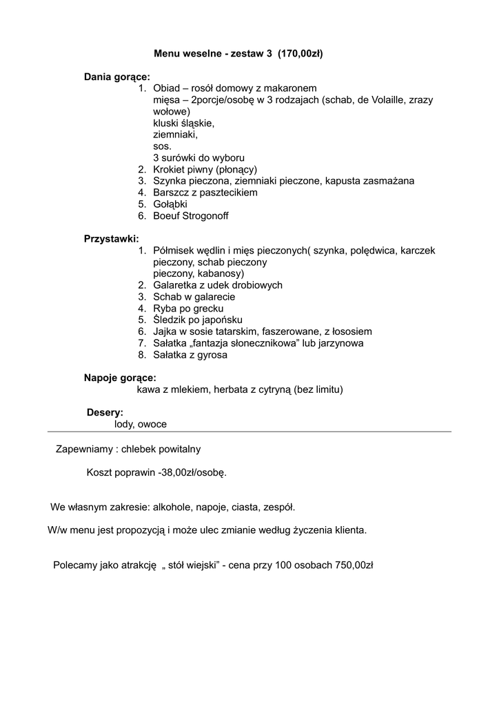 Menu weselne - zestaw 3 (170,00zł) Dania gorące: 1. Obiad – rosół domowy z makaronem mięsa – 2porcje/osobę w 3 rodzajach (schab, de Volaille, zrazy wołowe) kluski śląskie, ziemniaki, sos. 3 surówki do wyboru 2. Krokiet piwny (płonący) 3. Szynka pieczona, ziemniaki pieczone, kapusta zasmażana 4. Barszcz z pasztecikiem 5. Gołąbki 6. Boeuf Strogonoff Przystawki: 1. Półmisek wędlin i mięs pieczonych( szynka, polędwica, karczek pieczony, schab pieczony pieczony, kabanosy) 2. Galaretka z udek drobiowych 3. Schab w galarecie 4. Ryba po grecku 5. Śledzik po japońsku 6. Jajka w sosie tatarskim, faszerowane, z łososiem 7. Sałatka „fantazja słonecznikowa” lub jarzynowa 8. Sałatka z gyrosa Napoje gorące: kawa z mlekiem, herbata z cytryną (bez limitu) Desery: lody, owoce Zapewniamy : chlebek powitalny Koszt poprawin -38,00zł/osobę. We własnym zakresie: alkohole, napoje, ciasta, zespół. W/w menu jest propozycją i może ulec zmianie według życzenia klienta. Polecamy jako atrakcję „ stół wiejski” - cena przy 100 osobach 750,00zł