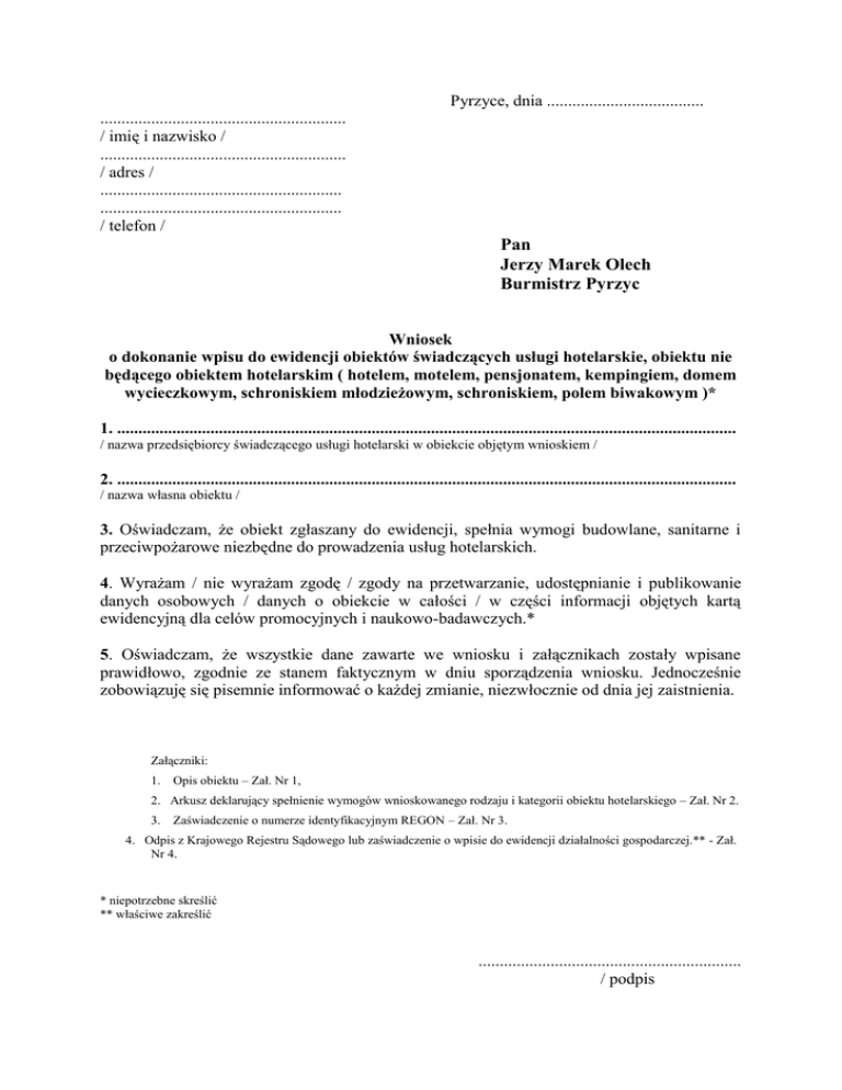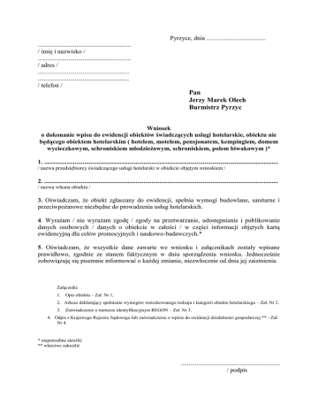 Pyrzyce, dnia ..................................... .......................................................... / imię i nazwisko / .......................................................... / adres / ......................................................... ......................................................... / telefon / Pan Jerzy Marek Olech Burmistrz Pyrzyc Wniosek o dokonanie wpisu do ewidencji obiektów świadczących usługi hotelarskie, obiektu nie będącego obiektem hotelarskim ( hotelem, motelem, pensjonatem, kempingiem, domem wycieczkowym, schroniskiem młodzieżowym, schroniskiem, polem biwakowym )* 1. .................................................................................................................................................. / nazwa przedsiębiorcy świadczącego usługi hotelarski w obiekcie objętym wnioskiem / 2. .................................................................................................................................................. / nazwa własna obiektu / 3. Oświadczam, że obiekt zgłaszany do ewidencji, spełnia wymogi budowlane, sanitarne i przeciwpożarowe niezbędne do prowadzenia usług hotelarskich. 4. Wyrażam / nie wyrażam zgodę / zgody na przetwarzanie, udostępnianie i publikowanie danych osobowych / danych o obiekcie w całości / w części informacji objętych kartą ewidencyjną dla celów promocyjnych i naukowo-badawczych.* 5. Oświadczam, że wszystkie dane zawarte we wniosku i załącznikach zostały wpisane prawidłowo, zgodnie ze stanem faktycznym w dniu sporządzenia wniosku. Jednocześnie zobowiązuję się pisemnie informować o każdej zmianie, niezwłocznie od dnia jej zaistnienia. Załączniki: 1. Opis obiektu – Zał. Nr 1, 2. Arkusz deklarujący spełnienie wymogów wnioskowanego rodzaju i kategorii obiektu hotelarskiego – Zał. Nr 2. 3. Zaświadczenie o numerze identyfikacyjnym REGON – Zał. Nr 3. 4. Odpis z Krajowego Rejestru Sądowego lub zaświadczenie o wpisie do ewidencji działalności gospodarczej.** - Zał. Nr 4. * niepotrzebne skreślić ** właściwe zakreślić .............................................................. / podpis Zał. Nr 1 – opis obiektu (rodzaj lub typ, kategoria – wpisuje organ ewidencyjny) 1. ________________________________________________________________________ (nazwa własna obiektu) ________________________________________________________________________ (adres, telefon, fax, e-mail, strona www) 2. Położenie obiektu: Powiat: _______________________, gmina. ______________________, Komunikacja PKP _______________ metrów ____, PKS _______________ m _____, (miejscowość) (nazwa dworca) komunikacja miejska ___________, przystanek ____________ m _____, (rodzaj, nr) Najbliższe jezioro: ______________ , m______ , ____________________ , m____, (nazwa) (nazwa) Najbliższa plaża nadmorska, molo- odległość_______________________, Las: _______________________, m ______ Obiekty godne zwiedzenia, inne atrakcje,odległość:__________________________________ 3. Pokoje i miejsca noclegowe: Wyszczególnienie pokoje ogółem 0 Ogółem w tym w pokojach jednoosobowych w tym w pokojach dwuosobowych w tym w pokojach trzy i więcej osób w tym w domkach turystycznych miejsca noclegowe w tym z własną łazienką i WC 2 1 ogółem całoroczne sezonowe 3 4 5 01 02 03 04 05 4. Wyposażenie w urządzenia sportowo rekreacyjne: Rodzaje urządzeń Rodzaje urządzeń x - tak - nie 0 Siłownia Basen kryty Kort tenisowy Tenis stołowy Boisko do siatkówki lub koszykówki Sauna, solarium Wypożyczalnia sprzętu pływającego 1 01 02 03 04 05 06 07 0 Bilard Możliwość jazdy konnej Wypożyczalnia rowerów Mini golf Ścieżka zdrowia Pokój zabaw dla dzieci Mini golf 5. Placówki gastronomiczne: Rodzaje placówek gastronomicznych 1 Restauracje 01 Kawiarnie, bary 02 Stołówki 03 Punkty gastronomiczne 04 Organizacja dyskotek, dansingów** 05 /*/ - tak/nie 1 08 09 10 11 12 13 14 6. Wyposażenie w inne urządzenia: Własne/* 0 x - tak - nie x - tak - nie Obce/* 2 Sale konferencyjne 01 Parking 02 Parking strzeżony 03 Obiekt dostępny dla osób niepełnosprawnych ruchowo Inne: 04 05 Zał. Nr 2 – arkusz deklaracyjny (rodzaj lub typ, kategoria – wpisuje organ ewidencyjny) 1.________________________________________________________________________ (nazwa własna obiektu) ________________________________________________________________________ (adres, telefon, fax, e-mail, strona www) 2. Deklaruję spełnienie przez ww. obiekt następujących wymogów: Lp Wymagania . 1 1 2. 3. 4. 5. 6. 7. 8. 9. 2 I. Dla wynajmowania miejsc na ustawienie namiotów i przyczep samochodowych Teren obozowiska wyrównany, suchy, ukształtowany w sposób zapewniający odprowadzanie wód opadowych i uprzątnięty z przedmiotów mogących zagrażać bezpieczeństwu. Punkt poboru wody do picia 1) i potrzeb gospodarczych. Miejsce wylewania nieczystości płynnych odpowiednio zabezpieczone i oznakowane. Pojemnik na śmieci i odpady stałe, regularnie opróżniany. Ustęp utrzymywany w czystości. II. Dla wynajmowania miejsc w namiotach, przyczepach mieszkalnych, domkach turystycznych i obiektach prowizorycznych. Stanowiska dla namiotów i przyczep mieszkalnych oraz dojścia do stanowisk utwardzone Oświetlanie dojść do stanowisk i obiektów higieniczno-sanitarnych Półka lub stelaż na rzeczy osobiste Oddzielne łóżka lub łóżka polowe dla każdego korzystającego z namiotu, w odległości nie mniejszej niż 30 cm pomiędzy łóżkami. III. Dla wynajmowania miejsc i świadczenia usług w budynkach stałych. 10. Ogrzewanie – w całym obiekcie w miesiącach X-IV, temperatura minimum 18˚C 11. 12. 13. Instalacja sanitarna: zimna woda przez całą dobę i dostęp do ciepłej wody 2) Maksymalna liczba osób przypadających na jeden węzeł higieniczno-sanitarny – 15 Wyposażenie podstawowe w.h.s.: 1) natrysk lub wanna 2) umywalka z blatem lub półką i wieszakiem na ręcznik 3) WC 4) lustro z