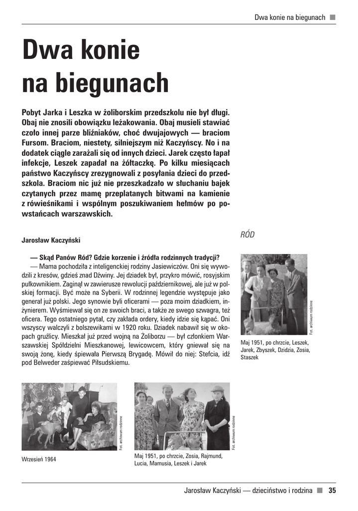Dwa konie na biegunach Dwa konie na biegunach Pobyt Jarka i Leszka w żoliborskim przedszkolu nie był długi. Obaj nie znosili obowiązku leżakowania. Obaj musieli stawiać czoło innej parze bliźniaków, choć dwujajowych — braciom Fursom. Braciom, niestety, silniejszym niż Kaczyńscy. No i na dodatek ciągle zarażali się od innych dzieci. Jarek często łapał infekcje, Leszek zapadał na żółtaczkę. Po kilku miesiącach państwo Kaczyńscy zrezygnowali z posyłania dzieci do przedszkola. Braciom nic już nie przeszkadzało w słuchaniu bajek czytanych przez mamę przeplatanych bitwami na kamienie z rówieśnikami i wspólnym poszukiwaniem hełmów po powstańcach warszawskich. RÓD Jarosław Kaczyński Maj 1951, po chrzcie, Leszek, Jarek, Zbyszek, Dzidzia, Zosia, Staszek Fot. archiwum rodzinne Fot. archiwum rodzinne Wrzesień 1964 Fot. archiwum rodzinne — Skąd Panów Ród? Gdzie korzenie i źródła rodzinnych tradycji? — Mama pochodziła z inteligenckiej rodziny Jasiewiczów. Oni się wywodzili z kresów, gdzieś znad Dźwiny. Jej dziadek był, przykro mówić, rosyjskim pułkownikiem. Zaginął w zawierusze rewolucji październikowej, ale już w polskiej formacji. Być może na Syberii. W rodzinnej legendzie występuje jako generał już polski. Jego synowie byli oficerami — poza moim dziadkiem, inżynierem. Wyśmiewał się on ze swoich braci, a także ze swego szwagra, też oficera. Tego ostatniego pytał, czy zakłada ordery, kiedy idzie się kąpać. Oni wszyscy walczyli z bolszewikami w 1920 roku. Dziadek nabawił się w okopach gruźlicy. Mieszkał już przed wojną na Żoliborzu — był członkiem Warszawskiej Spółdzielni Mieszkanowej, lewicowcem, który gniewał się na swoją żonę, kiedy śpiewała Pierwszą Brygadę. Mówił do niej: Stefcia, idź pod Belweder zaśpiewać Piłsudskiemu. Maj 1951, po chrzcie, Zosia, Rajmund, Lucia, Mamusia, Leszek i Jarek Jarosław Kaczyński — dzieciństwo i rodzina 35 BRATEK Fot. archiwum rodzinne BABCIA STEFCIA MAMA Fot. archiwum rodzinne Lato 1957, Ciechocinek, Leszek z babcią Fot. archiwum rodzinne Maj 1958, pierwsza Komunia św., Jarek, mama Rajmunda, Leszek Luty 1950, babcia, Jarek, Leszek, Henia 36 Lato 1950, babcia, Jarek Jarosław Kaczyński — dzieciństwo i rodzina Fot. archiwum rodzinne Babcia, Jarek — Czyli jest coś z prawdy w tym, że Kaczyńscy to żoliborska, lewicowa inteligencja? — Nie Kaczyńscy, bo to rodzina mamy, ale coś w tym jest. To część mojej rodzinnej tradycji. Dziadek Jasiewicz w latach 30. miał własną firmę, coraz lepiej mu się powodziło. Ani do swojego najbliższego współpracownika, ani do zięcia, mojego taty, nie chciał mówić per „ty”. Przed wojną mieszkał w tym samym domu, co później Kuroń. Po wojnie mieli też na Żoliborzu małe mieszkanko, które dostali od WSM. Ja tego dziadka niestety nie pamiętam — my urodziliśmy się w 1949, on umarł w 1951. — A babcia? — Babcia Stefcia — z rodziny Szydłowskich. Jej bracia byli inżynierami-rolnikami, nie mieszkali w Warszawie. Rodzina z dużymi tradycjami — powstanie listopadowe, styczniowe... Moja mama podczas wojny mieszkała trochę w Warszawie, trochę w Starachowicach u rodziny swojej mamy. Była w konspiracji od 14. roku życia. W Szarych Szeregach miała pseudonim Bratek, brała udział jako sanitariuszka w akcji Burza. Po wojnie poszła na polonistykę. — Miała rodzeństwo? — Przyrodni brat, syn babci z pierwszego małżeństwa, chciał się przedrzeć w 1939 roku na Zachód, dalej walczyć. Wpadł w ręce Sowietów, został ranny w głowę. Dostał się do łagru i tam umarł, podobno w stanie kompletnej amnezji. Bardzo długo po wojnie pamiętam nadzieję mamy, że on wciąż żyje. Poza tym mama ma siostrę. Moja ciocia była w Narodowych Siłach Zbrojnych. Nie myślcie panowie, że z powodu jakichś wyborów ideowych. Zdecydowały znajomości wśród chłopaków. Mieszkały z moją mamą w jednym pokoju, spały w jednym łóżku, a jedna nie wiedziała o konspiracyjnej działalności drugiej. Ciotka żyje do dziś, na Saskiej Kępie. Jest plastyczką. — A mama jest polonistką. — Tak, z wczesnego dzieciństwa pamiętam, jak chodziła do pracy na Uniwersytet. Była bardzo młodą matką. Świeżo po studiach. Potem pracowała w Instytucie Badań Literackich, potem w szkole, wreszcie znów wróci- Fot. archiwum rodzinne DZIADEK JASIEWICZ SZYDŁOWSCY Fot. archiwum rodzinne Rozdział III 1950 Jarosław Kaczyński — dzieciństwo i rodzina 37 Fot. archiwum rodzinne ła do IBL. Studiowała z Janem Józefem Lipskim, pracowała z nim w jednym pokoju i to dzięki niemu trafiłem do KOR. DZIADEK KACZYŃSKI — To rodzina ze strony mamy. A skąd wywodził się tata? BABCIA FRANIA — Dziadek Kaczyński był urzędnikiem kolejowym awansującym przed PRADZIADEK ŚWIĄTKOWSKI samą wojną na kierownicze stanowisko brzeskiej dyrekcji kolei. Przedtem był ZAGINIONY ŚWIAT przez wiele lat naczelnikiem ekspedycji węzła kolejowego w Baranowiczach. OJCIEC W 1918 roku napadł z jednym kolegą na niemiecki pociąg, sterroryzował załogę i zabrał broń. Jego za to, inaczej niż drugiego dziadka, pamiętam bradzo TATA dobrze. Zabierał mnie i brata na spacer na Dworzec Gdański, gdzie pracował podczas wojny. — Mówi Pan, że w 1939 roku miał zostać szefem węzła w Brześciu. Nie został? — Przyszli Sowieci. Rosjanin, który objął funkcję dziadka, powiedział mu po kilku miesiącach: Aleksandrze Pietrowiczu uchaditie. Dziadek jak wszyscy moi dziadkowie i babcie kończył rosyjską szkołę i świetnie posługiwał się tym językiem. Babcia ze strony ojca, Frania, chyba nawet lepiej mówiła, a już na pewno pisała po rosyjsku niż po polsku. Uciekli przez zieloną granicę przed wysyłką na Syberię. Tacy jak mój dziadek, wysoki urzędnik kolejowy, byli zsyłani w pierwszej kolejności. Na szczęście zachowali trochę majątku. Bab- Wrzesień 1949, Leszek i Jarek z mamą cia Fra