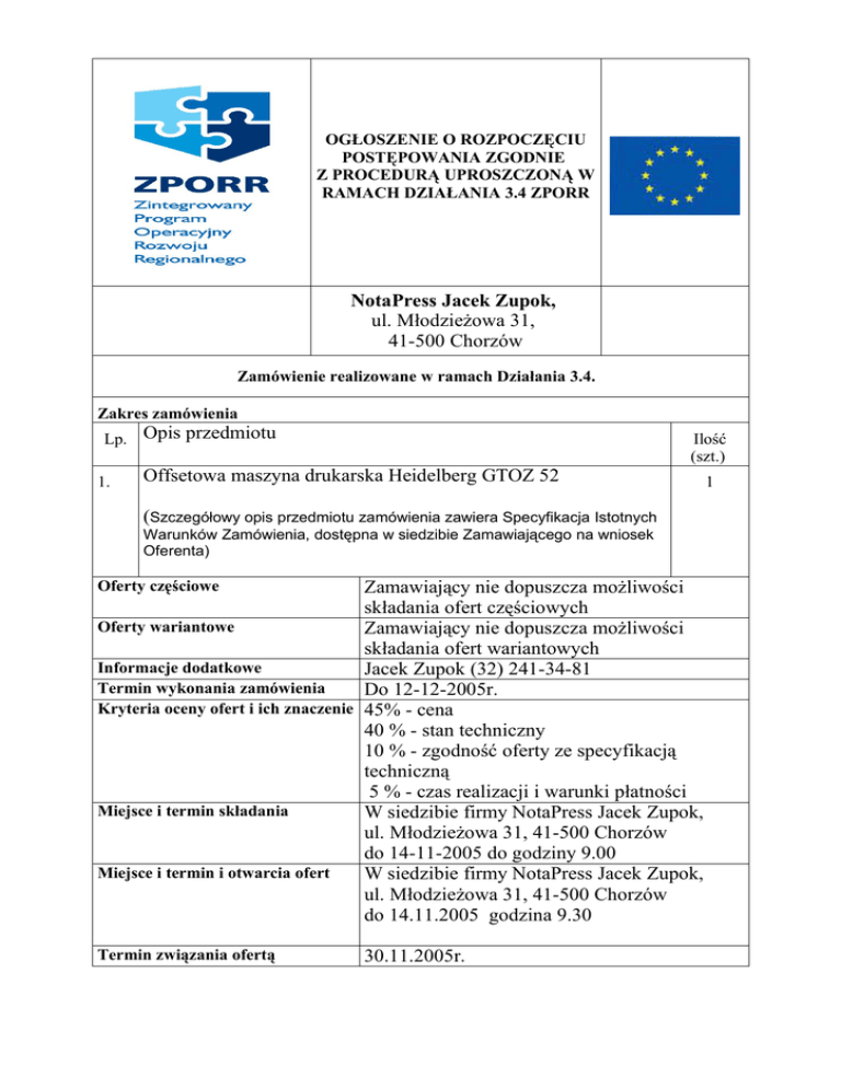 OGŁOSZENIE O ROZPOCZĘCIU POSTĘPOWANIA ZGODNIE Z PROCEDURĄ UPROSZCZONĄ W RAMACH DZIAŁANIA 3.4 ZPORR NotaPress Jacek Zupok, ul. Młodzieżowa 31, 41-500 Chorzów Zamówienie realizowane w ramach Działania 3.4. Zakres zamówienia Lp. Opis przedmiotu 1. Ilość (szt.) Offsetowa maszyna drukarska Heidelberg GTOZ 52 (Szczegółowy opis przedmiotu zamówienia zawiera Specyfikacja Istotnych Warunków Zamówienia, dostępna w siedzibie Zamawiającego na wniosek Oferenta) Zamawiający nie dopuszcza możliwości składania ofert częściowych Oferty wariantowe Zamawiający nie dopuszcza możliwości składania ofert wariantowych Informacje dodatkowe Jacek Zupok (32) 241-34-81 Termin wykonania zamówienia Do 12-12-2005r. Kryteria oceny ofert i ich znaczenie 45% - cena 40 % - stan techniczny 10 % - zgodność oferty ze specyfikacją techniczną 5 % - czas realizacji i warunki płatności Miejsce i termin składania W siedzibie firmy NotaPress Jacek Zupok, ul. Młodzieżowa 31, 41-500 Chorzów do 14-11-2005 do godziny 9.00 Miejsce i termin i otwarcia ofert W siedzibie firmy NotaPress Jacek Zupok, ul. Młodzieżowa 31, 41-500 Chorzów do 14.11.2005 godzina 9.30 Oferty częściowe Termin związania ofertą 30.11.2005r. 1