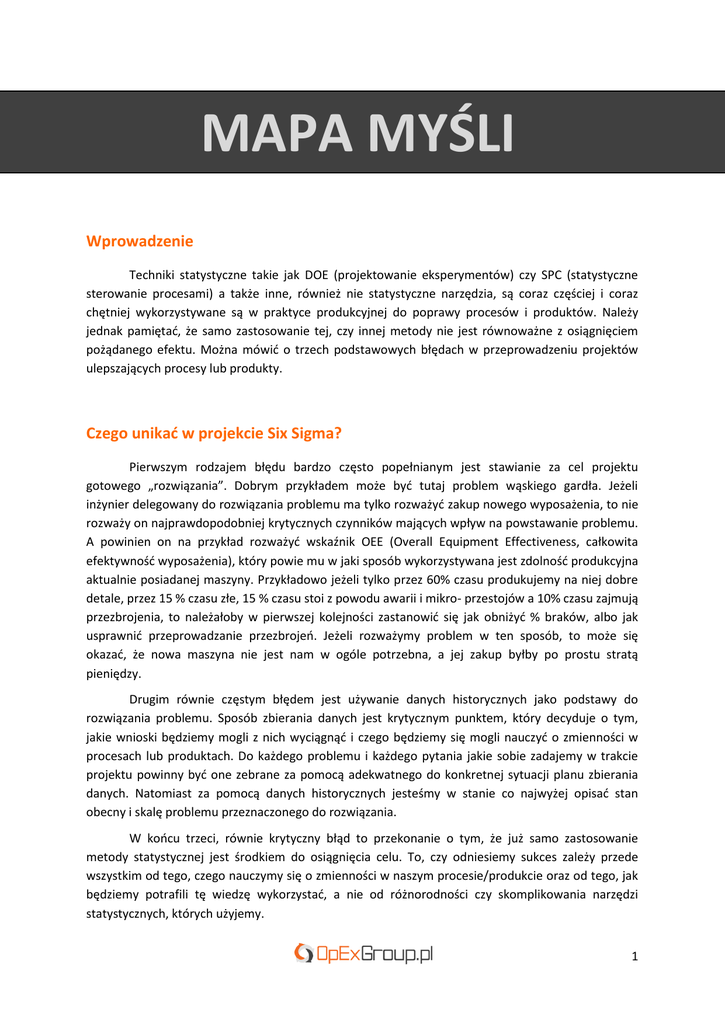 MAPA MYŚLI Wprowadzenie Techniki statystyczne takie jak DOE (projektowanie eksperymentów) czy SPC (statystyczne sterowanie procesami) a także inne, również nie statystyczne narzędzia, są coraz częściej i coraz chętniej wykorzystywane są w praktyce produkcyjnej do poprawy procesów i produktów. Należy jednak pamiętać, że samo zastosowanie tej, czy innej metody nie jest równoważne z osiągnięciem pożądanego efektu. Można mówić o trzech podstawowych błędach w przeprowadzeniu projektów ulepszających procesy lub produkty. Czego unikać w projekcie Six Sigma? Pierwszym rodzajem błędu bardzo często popełnianym jest stawianie za cel projektu gotowego „rozwiązania”. Dobrym przykładem może być tutaj problem wąskiego gardła. Jeżeli inżynier delegowany do rozwiązania problemu ma tylko rozważyć zakup nowego wyposażenia, to nie rozważy on najprawdopodobniej krytycznych czynników mających wpływ na powstawanie problemu. A powinien on na przykład rozważyć wskaźnik OEE (Overall Equipment Effectiveness, całkowita efektywność wyposażenia), który powie mu w jaki sposób wykorzystywana jest zdolność produkcyjna aktualnie posiadanej maszyny. Przykładowo jeżeli tylko przez 60% czasu produkujemy na niej dobre detale, przez 15 % czasu złe, 15 % czasu stoi z powodu awarii i mikro- przestojów a 10% czasu zajmują przezbrojenia, to należałoby w pierwszej kolejności zastanowić się jak obniżyć % braków, albo jak usprawnić przeprowadzanie przezbrojeń. Jeżeli rozważymy problem w ten sposób, to może się okazać, że nowa maszyna nie jest nam w ogóle potrzebna, a jej zakup byłby po prostu stratą pieniędzy. Drugim równie częstym błędem jest używanie danych historycznych jako podstawy do rozwiązania problemu. Sposób zbierania danych jest krytycznym punktem, który decyduje o tym, jakie wnioski będziemy mogli z nich wyciągnąć i czego będziemy się mogli nauczyć o zmienności w procesach lub produktach. Do każdego problemu i każdego pytania jakie sobie zadajemy w trakcie projektu powinny być one zebrane za pomocą adekwatnego do konkretnej sytuacji planu zbierania danych. Natomiast za pomocą danych historycznych jesteśmy w stanie co najwyżej opisać stan obecny i skalę problemu przeznaczonego do rozwiązania. W końcu trzeci, równie krytyczny błąd to przekonanie o tym, że już samo zastosowanie metody statystycznej jest środkiem do osiągnięcia celu. To, czy odniesiemy sukces zależy przede wszystkim od tego, czego nauczymy się o zmienności w naszym procesie/produkcie oraz od tego, jak będziemy potrafili tę wiedzę wykorzystać, a nie od różnorodności czy skomplikowania narzędzi statystycznych, których użyjemy. 1 Nieodzownym aspektem każdego projektu 6 sigma jest krytyczne myślenie, które pozwala nam na nowe spojrzenie na problem. Pytania & teorie & podejrzenia Projekt, czyli problem do rozwiązania & istniejąca wiedza Sugestie & pomysły Doświadczenie & wiedza techniczna Narzędzia statystyczne & zbieranie danych & weryfikacja wyników Nowa wiedza Nowe pytania Nowe teorie Rys.1. Schemat krytycznego podejścia do rozwiązywania problemów Rys. 1 ma celu pokazanie, w jaki sposób nasza aktualna wiedza, podejrzenia, czy pomysły powinny powodować stawianie co raz to nowych pytań, co wymusza na nas zastosowanie odpowiednich narzędzi adekwatnych do informacji, które chcemy uzyskać. Na podstawie zebranych danych uzupełniamy naszą wiedzę, potwierdzamy lub odrzucamy podejrzenia, a następnie zadajemy kolejne pytania. Na końcu tej drogi znajduje się odpowiedź na główne pytanie: co jest przyczyna problemu, który chcemy rozwiązać? Mapa Myśli Mapa myśli jest doskonałym narzędziem do dokumentowania procesu krytycznego myślenia i sekwencyjnego procesu uczenia. Za jej pomocą dokumentujemy: Już posiadaną wiedzę, Pytania początkowe i teorie do sprawdzenia bazujące na posiadanej wiedzy, Plany zbierania danych użytych w celu potwierdzenia lub odrzucenia kolejnych hipotez, Zebrane dane, Nowo zdobytą wiedzę, Nowe teorie i pytania, które nasuwają się na podstawie zebranych danych. Mapa myśli mogłaby być śmiało określona jako przewodnik w procesie krytycznego myślenia oraz w planowaniu i zbieraniu danych. Dzięki starannemu zaplanowaniu potrzeb (zadawane pytania) możemy w taki sposób zaplanować zbieranie danych aby przy jak najmniejszych nakładach zdobyć potrzebne informacje (plany próbkowania, planowanie eksperymentów). 2 SYSTEMATYCZNE ZDOBYWANIE WIEDZY, ZBIERANIE I ANALIZOWANIE DANYCH QUESTIONS & THEORIES Mapa Myśli Mapa Procesu/ Produktu FMEA, diagram przyczynowoskutkowy Badanie Składników Zmienności, plany próbkowania Karty Kontrolne Planowanie Eksperyment -ów (DOE) ODPOWIEDZI I NOWE PYTANIA I NOWE TEORIE Rys. 2. Ewolucyjny charakter mapy myśli Jak pokazano na rys. 1 „mapa myśli” jest żyjącym dokumentem, który nie jako wymusza na nas sekwencyjne zdobywanie wiedzy o procesie/produkcie, poprzez planowe, logiczne i systematyczne podejmowanie kolejnych akcji przy jednoczesnym respektowaniu głównego celu pracy w projekcie. W związku z tym możemy mówić o wielu korzyściach płynących z użycia tego narzędzia. Przede wszystkim nie będą podejmowane żadne akcje nie wnoszące nowych informacji dotyczących rozpatrywanego problemu. Mapa pozwala także pamiętać o wszystkich aspektach rozpatrywanego problemu. W razie nie potwierdzenia teorii, która została uznana za najbardziej prawdopodobną łatwo można wrócić do innych, które często bywają po prostu zapomniane. Najlepsze rozwiązanie wybrane jest po jego uprzednim rozpatrzeniu na tle wielu innych potencjalnych rozwiązań. Mapa myśli jest również doskonałym narzędziem komunikacyjnym. Możemy się z niej dowiedzieć wszystkiego nie tylko o podjętych działaniach ale także o taktyce i przyjętej strategii rozwiązania problemu. Na poziomie zespołu powołanego do danego projektu pozwoli ona o
