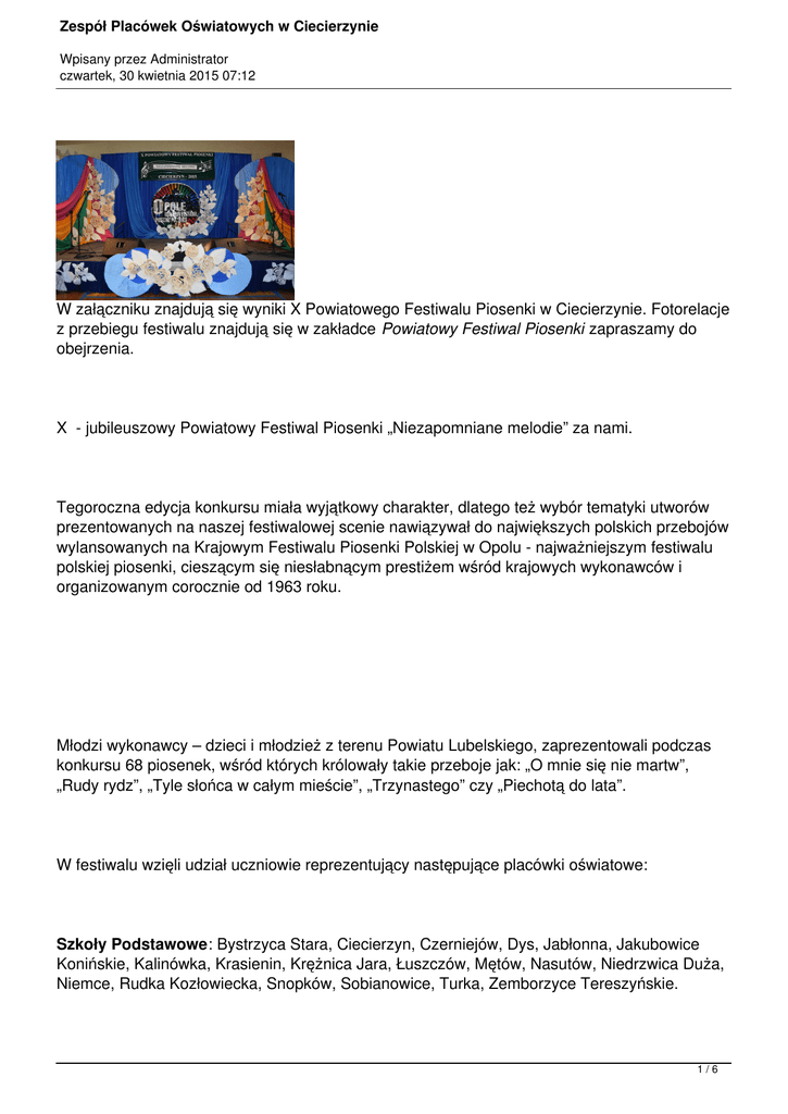 Zespół Placówek Oświatowych w Ciecierzynie Wpisany przez Administrator czwartek, 30 kwietnia 2015 07:12 W załączniku znajdują się wyniki X Powiatowego Festiwalu Piosenki w Ciecierzynie. Fotorelacje z przebiegu festiwalu znajdują się w zakładce Powiatowy Festiwal Piosenki zapraszamy do obejrzenia. X - jubileuszowy Powiatowy Festiwal Piosenki „Niezapomniane melodie” za nami. Tegoroczna edycja konkursu miała wyjątkowy charakter, dlatego też wybór tematyki utworów prezentowanych na naszej festiwalowej scenie nawiązywał do największych polskich przebojów wylansowanych na Krajowym Festiwalu Piosenki Polskiej w Opolu - najważniejszym festiwalu polskiej piosenki, cieszącym się niesłabnącym prestiżem wśród krajowych wykonawców i organizowanym corocznie od 1963 roku. Młodzi wykonawcy – dzieci i młodzież z terenu Powiatu Lubelskiego, zaprezentowali podczas konkursu 68 piosenek, wśród których królowały takie przeboje jak: „O mnie się nie martw”, „Rudy rydz”, „Tyle słońca w całym mieście”, „Trzynastego” czy „Piechotą do lata”. W festiwalu wzięli udział uczniowie reprezentujący następujące placówki oświatowe: Szkoły Podstawowe: Bystrzyca Stara, Ciecierzyn, Czerniejów, Dys, Jabłonna, Jakubowice Konińskie, Kalinówka, Krasienin, Krężnica Jara, Łuszczów, Mętów, Nasutów, Niedrzwica Duża, Niemce, Rudka Kozłowiecka, Snopków, Sobianowice, Turka, Zemborzyce Tereszyńskie. 1/6 Zespół Placówek Oświatowych w Ciecierzynie Wpisany przez Administrator czwartek, 30 kwietnia 2015 07:12 Gimnazja: Bystrzyca Stara, Ciecierzyn, Garbów, Jabłonna, Kalinówka, Krasienin, Krężnica Jara, Krzczonów, Mętów, Niemce, Tarnawka. Szkoły Ponadgimnazjalne: Niemce Przedszkola: Przedszkole w Ciecierzynie, w Niemcach. W sumie na festiwalu wystąpiło 140 uczniów z 19 szkół podstawowych, 11 gimnazjów, 1 szkoły ponadgimnazjalnej i 2 przedszkoli, przygotowanych przez 36 nauczycieli. Honorowy patronat nad festiwalem sprawowali: dr inż. Henryk Smolarz – Poseł na Sejm RP Sławomir Sosnowski – Marszałek Województwa Lubelskiego Krzysztof Babisz - Lubelski Kurator Oświaty Paweł Pikula - Starosta Lubelski Krzysztof Urbaś - Wójt Gminy Niemce Rangę festiwalu podniosła obecność gości honorowych – Posła na Sejm RP dr inż. Henryka Smolarza, p. Magdaleny Urbaś – Dyrektor Departamentu Kontroli i Audytu Wewnętrznego w 2/6 Zespół Placówek Oświatowych w Ciecierzynie Wpisany przez Administrator czwartek, 30 kwietnia 2015 07:12 Urzędzie Marszałkowskim, przedstawicieli Starostwa Powiatowego w Lublinie w osobach: p. Dariusza Gajo – Członka Zarządu Powiatu Lubelskiego, Radnych Powiatowych: p. Agnieszki Woźniak – Urban, p. Zbigniewa Bernata; p. Krzysztofa Urbasia - Wójta Gminy Niemce, p. Iwony Pulińskiej - zastępcy Wójta Gminy Niemce, p. Sławomira Mroczka - Przewodniczącego Rady Gminy, Radnych Gminy Niemce: p. Grażyny Gliwki, p. Ewy Pitury, p. Janusza Prokopiuka, p. Piotra Pankowskiego, p. Anny Studzińskiej - dyrektor GOASz w Niemcach, p. Romana Urbasia – sołtysa Sołectwa Ciecierzyn, a także dyrektorów szkół i przedszkoli oraz osób indywidualnych – sponsorów: p. Andrzeja Gieroby, p. Jacka Dmowskiego, p. Piotra Wójcika. Odczytane zostały również listy gratulacyjne od p. Tadeusza Sławeckiego – Sekretarza Stanu w MEN, p. Krzysztofa Babisza – Lubelskiego Kuratora Oświaty i p. Sławomira Sosnowskiego – Marszałka Województwa Lubelskiego. Szczęście, wzruszenie, duma, trema, łzy radości… emocjom nie było końca (bo i sam konkurs trwał do późnych godzin wieczornychJ). Gorące słowa podziękowania popłynęły w stronę p. Ani Studzińskiej inicjatorki, pomysłodawczyni i dobrego ducha przedsięwzięcia pod nazwą „Powiatowy Festiwal Piosenki „Niezapomniane melodie”. Dziękowano wszystkim, którzy pomagają przy organizacji i przygotowaniu festiwalu. Wśród nich znaleźli się: - dr inż. Henryk Smolarz - Poseł na Sejm RP - p. Paweł Pikula - Starosta Lubelski - p. Krzysztof Urbaś – Wójt Gminy Niemce - Urząd Marszałkowski w Lublinie 3/6 Zespół Placówek Oświatowych w Ciecierzynie Wpisany przez Administrator czwartek, 30 kwietnia 2015 07:12 - Lubelski Kurator Oświaty - p. Eugeniusz Woźniak – właściciel Zakładów Przetwórstwa Mięsnego „Ryjek’ w Nasutowie - p. Tomasz Błaszczyk – właściciel firmy "Błaszczyk" w Elizówce - p. Piotr Pankowski - p. Bożena i Janusz Prokopiukowie - p. Anna i Andrzej Studzińscy - p. Andrzej Gieroba - p. Piotr Wójcik - Akademia Równowagi Wokalnej - p. Maria i Jacek Dmowscy – właściciele Centrum Rozwoju i Edukacji „Champion” - p. Krzysztof Dadej – właściciel sklepu muzycznego „E- music” - p. Michał Dudziak – właściciel Gospodarstwa P.H.U. w Ludwinowie 4/6 Zespół Placówek Oświatowych w Ciecierzynie Wpisany przez Administrator czwartek, 30 kwietnia 2015 07:12 - p. Roman Urbaś – sołtys wsi Ciecierzyn - p. Grzegorz Tymczak – właściciel firmy „TYMWAR” - p. Małgorzata Kwiatkowska – właścicielka firmy „FREDOM” - p. Adam Postrzech – właściciel Hurtowni opakowań - rodzice uczniów ZPO w Ciecierzynie Ciepłe słowa podziękowania skierowano również do komisji konkursowej w składzie: p. Krzysztof Kramek, p. Bożena Stępień, p. Jacek Szpunar, która miała nie lada orzech do zgryzienia dokonując oceny i wyboru „najlepszych z najlepszych”. Laureaci X Powiatowego Festiwalu Piosenki „Niezapomniane melodie” otrzymali mnóstwo cennych nagród, w tym Nagrody Specjalne Posła na Sejm RP Henryka Smolarza, Starosty Lubelskiego Pawła Pikuli i Wójta Gminy Niemce Krzysztofa Urbasia. Zdobywcy pierwszych miejsc dodatkowo otrzymali pamiątkowe puchary, a wybrani soliści lekcje w Akademii Równowagi Wokalnej. Niezwykle sympatycznym akcentem uroczystości były występy laureatek poprzednich edycji naszego festiwalu – Natalii Pieńkowskiej z Krężnicy Jarej oraz Bernadety Zgierskiej i