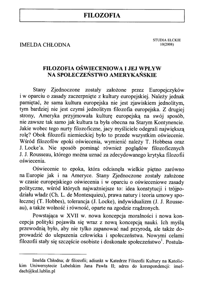 FILOZOFIA IMELDA CHŁoDNA STUDIA EŁCKIE 10(2008) FILoZoFIA oŚwIECENIowA I JEJ wPŁYw NA sPoŁECZEŃsTwo AMEnyxłŃsrrn Stany Zjednoczone zostaĘ założonę przęZ Europejczyków i w oparciu o zasady zaczerpnięte z kultury europejskiej. Należy jednak pamiętać, że sama kultura europejska nie jest zjawiskiem jednolitym, tym bardziej nie jest czymśjednolitym filozofia europejska. Z drugiej strony, Ameryka przyjmowała kulturę europejską na swój sposób, nie zawszę tak samo jak kultura ta była obecna na Starym Kontynencie. Jakie wobec tego nurty filozoftczne,jacy myślicieleodegrali największą rolę? obok filozofii niemieckiej było to przede wszystkim oświecenie. Wśród filozofow epoki oświecenia, wymienić na|eŻy T. Hobbesa oraz J. Locke'a. Nie sposób pominąć również poglądów ftlozoftcznych J. J. Rousseau, którego moŻnavznac zazdecydowanego krytyka filozofii oświecenia. oświecenię to epoka, która odcisnęła wielkie piętno zarówno na Europie jak i na Ameryce. Stany Zjednoczone zostaĘ założone w czasie europejskiego oświecenia i w oparciu o oświeceniowe zasady polttyczne, wśród których najważniejsze to: idea konstytucji i trojpodziałuwładz (Ch. L' de Montesquieu), prawa natury i teoria umowy społecznej (T. Hobbes), tolerancja (J. Locke), indywidualizm (J. J. Rousseau), a także wolnośći równość, oparte na zgodzie rządzonych' Powstająca w XVII w. nowa koncepcja moralności i nowa koncepcja polityki pojawiła się wraz z nową koncepcją nauki. Ich myślą przewodnią było, aby nie tylko zapanowaó nad przyrodą ale takżę doprowadzić do ulepszenia człowieka i społeczeństwa' Nowymi celami filozofii staĘ się szczęście osobiste i doskonałe społeczeństwol. PostulaImelda Chłodna; dr filozofii; adiunkt w Katędrze Filozofii Kulfury na Katolic- kim Uniwersytecie Lubelskim Jana Pawła II; adres do [email protected] korespondencji: imel- IMELDACrłłopxł ty te znalazł swą realizację właśniew epoce oświecenia, które było śmiaĘmprzedsięwzięcierą stawiającym sobie za cel tak przebudować życie polityczne i umysłowe, aby znalazło się w całościpod nadzorem filozofii i nauki. U początków tego projektu za najważniejszą uchodziła wolnośó myślenia, ponieważ rozum uważano za najwyŻszą zwładz i niezbędny warunek zapewniający dobro społeczeństwa. Mając na uwadze dobrobyt ibezpieczeństwo propagowano w epoce oświęcenia ideał człowieka racjonalnego i gospodarnego' zdolnego ocenió, co jest dla niego korzystne. oświecenie traktowało rozurą odwołujący się do doświadczenia, zjednej strony jako narzędzie pozrnnia iźródło wiedzy o świecie, społeczeństwie i człowieku, z drugiej _ jako instrument krytyki i sceptycznego osądu dotychczasowej wiedzy, umoŻliwiający wyzwolenie ludzkościzę stanu ignorancji, spod władzy przesądów, autorytetów religijnych, intelektualnych i politycznych. Rozum został podniesiony do rangi przewodnika w wychowaniu młodych pokoleń. W Ameryce oświecenie rczpoczęło się w 1690 r. i trwało do roku 1730' Był to czas, kiedy fllozofia zaczęła być praktykowana nie tylko na obszarze purlańskiej Nowej Anglii, ale takżę w Filadelfii, Williamsburgu i Nowyrn Jorku; rozu,ijana była w XVII w. w rejonie Bostonu, a z czasemprzedostawała się na obszary lepiej ronvinięte pod względem ekonomicznym i bardziej ztóŻnicowanę pod względem religijnym. Jej rozwój najlepiej uwidaczniał się w powstających w tym czasie szkołachwyższych- w 1636 r. założonyzostał Harvard College, a u schyłku wieku powstĄ dwie nowe szkoĘ - Connecticut i Williamsburg College. Do czasów rewolucji (1775-1783) na obszarue kolonii funkcjonowało dziewięó szkół wyższych. odtąd filozofią zajmowali się już nie tylko purytanie, ale objęła ona swym zasięgiem wiele różnych społeczności na znacznym obszarze kolonii brytyjskich'. W sferze życia zarówno intelektualnego' społecznego, jak i religijnego amerykańskich kolonii zauwaŻalnebyĘ wyruźne róznice pomiędzy XVII-wie c znp purytanizmem a XVlll-wiecznym okresem o świecenia. ByĘ one widoczne m.in. w podejmowaniu dotychczas nie poruszanych teńatów ftlrozoftcznych czy odrzucaniu powszechnie uznawanych auto- I 2 Zob' P. Jaroszyński,Naukawkulturze, Radom 2002,s.280. R. Kęnnedy, Philosophy from Puritanism to Enlightenment, w: Encyclopedia of Americąn Cultural ąnd Intellectual History, ed. M. Kupiec Cayton, P. Williams, Nęw York 2001, s. 87-96. 30 Fu-ozorn oŚwmcentowł... rytetów, przede wszystkim autorytetu Pisma św.W życiu intelektualnym przestała dominować nauka oparta na objawieniu. Amerykańskie Towarzystwo Filozoficzne przyjęło jak główną zasadę, ż tematy dotyczące religii nie mogąbyć przedmiotem podejmowanych przez nie dyskusji. W programach uniwersyteckich nadal podstawową funkcję pehriły logika, filozofia moralna i teologia, jednak charakterystyczną cechą amerykańskiego oświecenia był fakt, iż coraz mocniejszy nacisk kładziono na filozofię naturalną. Myślicielami, których poglądy musiał znac każdy ówczesny student byli Jobn Locke i Isaac Newton. Najbar_ dzĘ popularnym wówczas podręcznikiem logiki było dzieło Isaaca Wattsa pt. Logic: or the Right Use of Reason (1724), stanowiące pochwałę dzięła Locke'a _ Essay Concerning Humąn Understanding (16e0). Innym źródłemfilozofii nauczanej w ówczesnych szkołach wyzszych były uniwerslety szkockie, skąd przywędrowĄ m.in. poglądy takich myślicieli, jak: Francis Hutchinson, Thomas Ręid, David Humę czy Adam smith. Głównym tematem podejmowanym przez filozofow szkockich był common Sense (zdrowy rozsądek). Filozofia ta opowiadała się za demokratycznym indywidualizmem w polityce oraz indywidualnym doświadczeniem i intuicją w dziedznie religii. Na gruncie logiki i etyki podkreślałazdolnośćludzi do życia ronlmowego i prawego, co uzalężniałajednak od uzywania przez nich zdrowego rozsądku. Jeden ze szkocki