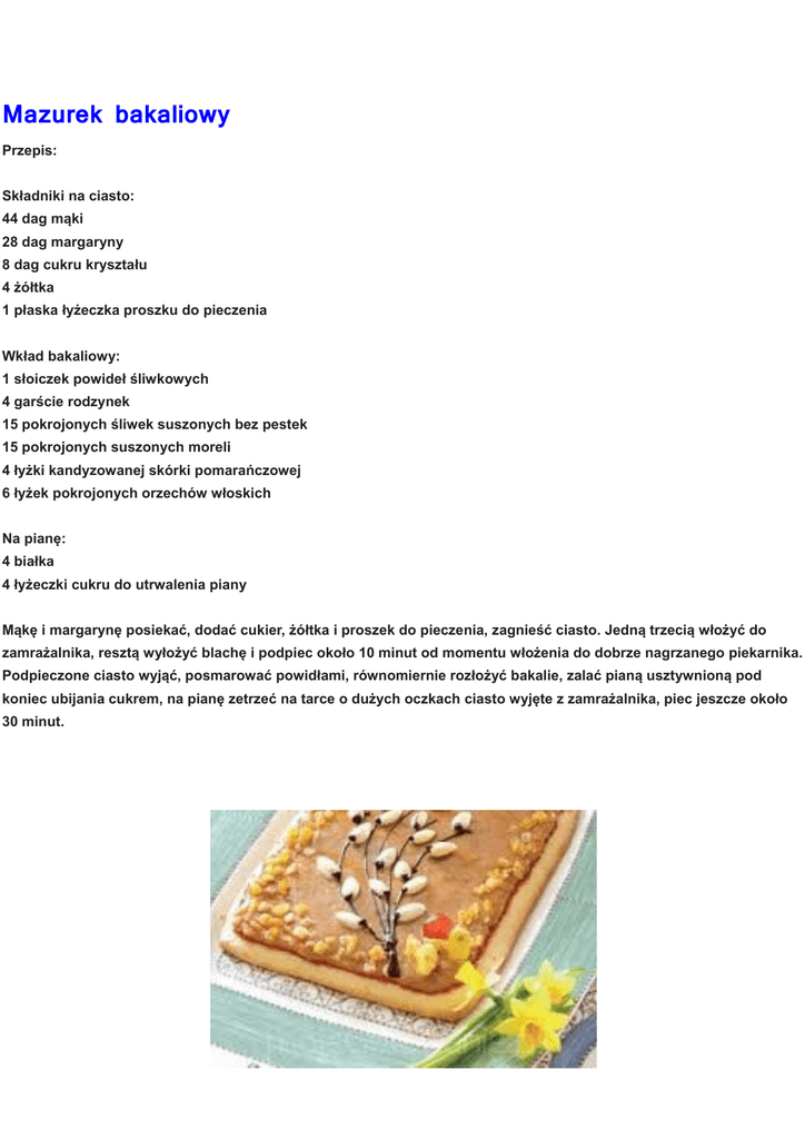 Mazurek bakaliowy Przepis: Składniki na ciasto: 44 dag mąki 28 dag margaryny 8 dag cukru kryształu 4 żółtka 1 płaska łyżeczka proszku do pieczenia Wkład bakaliowy: 1 słoiczek powideł śliwkowych 4 garście rodzynek 15 pokrojonych śliwek suszonych bez pestek 15 pokrojonych suszonych moreli 4 łyżki kandyzowanej skórki pomarańczowej 6 łyżek pokrojonych orzechów włoskich Na pianę: 4 białka 4 łyżeczki cukru do utrwalenia piany Mąkę i margarynę posiekać, dodać cukier, żółtka i proszek do pieczenia, zagnieść ciasto. Jedną trzecią włożyć do zamrażalnika, resztą wyłożyć blachę i podpiec około 10 minut od momentu włożenia do dobrze nagrzanego piekarnika. Podpieczone ciasto wyjąć, posmarować powidłami, równomiernie rozłożyć bakalie, zalać pianą usztywnioną pod koniec ubijania cukrem, na pianę zetrzeć na tarce o dużych oczkach ciasto wyjęte z zamrażalnika, piec jeszcze około 30 minut. Przepis na babkę drożdżową Przygotuj: 700 g mąki, 60 g świeżych drożdży, 1 i 1/3 szklanki cukru (około 180 g), 100 g roztopionego masła, 6 żółtek, 0,5 litra letniego mleka, 0,5 łyżeczki soli, 200 g rodzynek, 150-200 g skórki pomarańczowej, Można dodać parę kropel cytrynowego aromatu, ale ja nigdy nie dodaję. Do połowy letniego mleka wsyp połowę ilości cukru, wkrusz drożdże. Wymieszaj i odstawi do wyrośnięcia. Do dużej misy wsyp przesianą mąkę, dodaj rozczyn, resztę cukru, mleko, żółtka, sól oraz bakalie. Wymieszaj, aż ciasto będzie odchodziło od rąk, wtedy dodaj letnie roztopione masło, ponownie wymieszaj. Odstawi w ciepłe miejsce, aż ciasto podwoi swoją objętość. Po czym lekko wymieszaj i włóż do wysmarowanej tłuszczem formy (3 litrowej z kominkiem). Odstawi ponownie, aż ciasto powiększy się do wysokości 3/4 formy. Piecz około 40-45 minut w temperaturze 175 stopni. Sprawdź na końcu, czy patyczek włożony do ciasta jest suchy, tj. czy ciasto jest dobrze upieczone. Domowy zakwas na żurek z receptury dziadka Składniki Składniki: 1 l przegotowanej i ciepłej wody 1 szklanka mąki żytniej z otrębami (jeśli mamy mąkę bez otrębów możemy dodać płatki owsiane) 2 - 3 ząbki czosnku (lekko rozgniecione, nie więcej) kilka liści laurowych kilka ziaren ziela angielskiego piętka chleba na zakwasie Sposób przygotowania Wykonanie: Do słoika wysypujemy mąkę, (ewentualnie płatki) zalewamy ciepłą wodą i dokładnie mieszamy (najlepiej drewnianą trzepaczką). Dodajemy przyprawy i czosnek oraz piętkę chleba. Zakwas przykrywamy lnianą ściereczką albo gazą. Musi do niego dochodzić powietrze, więc nie zakręcamy szczelnie wieczkiem. Odstawiamy go na parę dni w ciepłe miejsce. Musi się zakisić. Od 3 do 5 dni w zależności jaką mamy temperaturę w mieszkaniu? Po ukiszeniu wlewamy żurek do przygotowywanej zupy i zostawiamy odrobinę zakwasu w słoiku, który chowamy do lodówki. Gdy będziemy ponownie zakwas kisić wystarczy dodać 5 czubatych łyżek mąki żytniej i dolać kolejny 1 litr ciepłej wody i odstawić na parę dni w ciepłe miejsce. Taki zaczyn może nam starczyć na kilka miesięcy :) U mnie w lodówce zawsze są resztki zakwasu i tylko czekają na ponowne użycie Rady Domowy zakwas na żurek to sfermentowana mąka żytnia z wodą i odrobiną przypraw. Są w niej bakterie kwasu mlekowego. Jakiej mąki użyć ? Dziś w telewizji usłyszałam, że do barszczu białego używa się mąki pszennej a do żurku mąki żytniej. Więc niech tak będzie. Ma to być żurek więc wybrałam mąkę żytnią. Im wyższa liczba mąki tym lepiej. Więc mąka typu 2000 Inne dodatki: - piętka chleba na zakwasie. Taki chlebek przyczynia się do walorów smakowych i i przyspieszenia proces fermentacji - zioła (liście laurowe i ziela angielskie) jedynie dla walorów smakowych - czosnek ( także dla walorów smakowych, bo teoretycznie czosnek ma właściwości bakteriobójcze i dzięki niemu proces fermentacji się nam wydłuży, ale nie wyobrażam sobie zakwasu bez jego aromatu) Przechowywanie zakwasu: Zakwas odstawiamy w ciepłe miejsce na kilka dni. Musi zacząć pachnieć kwasem. Ale może nam, też spleśnieć, więc zamieszajmy go od czasu do czasu i wąchajmy go :) Żeby nam nie spleśniał pamiętajmy o dobrze wygotowanym słoiku. Słoik przykrywamy lnianą ściereczką albo gazą. Po ukiszeniu wlewamy zakwas do przygotowywanej zupy i zostawiamy odrobinę zakwasu w słoiku, który chowamy do lodówki. Gdy będziemy ponownie zakwas kisić wystarczy dodać 5 czubatych łyżek mąki żytniej i dolać kolejny 1 litr ciepłej wody i odstawić na parę dni w ciepłe miejsce. Taki zaczyn może nam starczyć na kilka miesięcy .U mnie w lodówce zawsze są resztki zakwasu i tylko czekają na ponowne użycie. Ćwikła z chrzanem Składniki: 1-1,5 kg buraków, 10-15 dag chrzanu, 2 łyżki octu 3% lub kwasek cytrynowy, 1 dag kminku (niekoniecznie, zależy od smaku), sól, cukier do smaku Wykonanie: Wyszorowane i dobrze opłukane buraki zalać gorącą wodą, ugotować do miękkości, zetrzeć na tarce i tu uwaga: Można zetrzeć na drobnych otworach lub dużych. Buraczki starte na małych otworach będą rzadkie i wytworzą więcej soku. Te drugie będą w wiórkach. Zrób więc jak wolisz – jednakowo smakują, różnią się tylko konsystencją. Chrzan oczyścić, umyć oskrobać, zetrzeć na tarce (na takim samych oczkach jak buraki). Dodać opłukany kminek, przyprawić do smaku solą, cukrem, kwaskiem. Jeżeli chcemy, by ćwikła dłyżej zachowała ostrość i smak wlewamy 1/4 litra wody przegotowanej, włożyć ciasno do słoi, szczelnie zamknąć, przechowywać w chłodnym miejscu. Wielkanocny barszcz czerwony Składniki: 1 kg buraków skórka razowego chleba „mięsna” kość od wędzonej szynki lub wędzone kości pęczek włoszczyzny czosnek sól, cukier, natka pietruszki chrzan tarty ,śmietana ,jajka Wykonanie: Większość przygotowań barszczu to kiszenie buraków, czyli