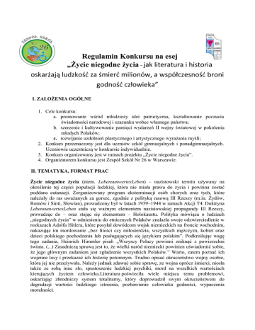 Regulamin Konkursu na esej „Życie niegodne życia – jak literatura i historia oskarżają ludzkość za śmierć milionów, a współczesność broni godność człowieka” I. ZAŁOŻENIA OGÓLNE 1. Cele konkursu: a. promowanie wśród młodzieży idei patriotyzmu, kształtowanie poczucia świadomości narodowej i szacunku wobec własnego państwa; b. szerzenie i kultywowanie pamięci wydarzeń II wojny światowej w pokoleniu młodych Polaków; c. rozwijanie uzdolnień plastycznego i artystycznego wyrażania myśli; 2. Konkurs przeznaczony jest dla uczniów szkół gimnazjalnych i ponadgimnazjalnych. Uczniowie uczestniczą w konkursie indywidualnie. 3. Konkurs organizowany jest w ramach projektu „Życie niegodne życia”. 4. Organizatorem konkursu jest Zespół Szkół Nr 26 w Warszawie. II. TEMATYKA, FORMAT PRAC Życie niegodne życia (niem. LebensunwertesLeben) – nazistowski termin używany na określenie tej części populacji ludzkiej, która nie miała prawa do życia i powinna zostać poddana eutanazji. Zorganizowany program eksterminacji osób chorych oraz tych, które należały do ras uważanych za gorsze, zgodnie z polityką rasową III Rzeszy (m.in. Żydów, Romów i Sinti, Słowian), prowadzony był w latach 1939–1944 w ramach Akcji T4. Doktryna LebensunwertesLeben stała się ważnym elementem nazistowskiej propagandy III Rzeszy, prowadząc do – oraz stając się elementem – Holokaustu. Polityka mówiąca o ludziach „niegodnych życia” w odniesieniu do etnicznych Polaków znalazła swoje odzwierciedlenie w rozkazach Adolfa Hitlera, które posyłał dowódcom wojsk niemieckich na froncie wschodnim, nakazując im mordowanie „bez litości czy miłosierdzia, wszystkich mężczyzn, kobiet oraz dzieci polskiego pochodzenia lub posługujących się językiem polskim”. Podkreślając wagę tego zadania, Heinrich Himmler pisał: „Wszyscy Polacy powinni zniknąć z powierzchni świata. (...) Zasadniczą sprawą jest to, że wielki naród niemiecki powinien uświadomić sobie, że jego głównym zadaniem jest zgładzenie wszystkich Polaków.” Warto, zatem poznać ich wojenne losy i przekazać ich historię potomnym. Trudno opisać okrucieństwo wojny osobie, która jej nie przeżywała. Należy jednak zdawać sobie sprawę, ze wojna oprócz śmierci, niosła także ze sobą inne zło, spustoszenie ludzkiej psychiki, mord na wszelkich wartościach kierujących życiem człowieka.Literatura poświeciła wiele miejsca temu problemowi, oskarżając zbrodniczy system totalitarny, który doprowadził swym okrucieństwem do degradacji wartości ludzkiego istnienia, pozbawienie człowieka godności, wypaczenia moralności. 1. Praca powinna być przygotowana przez uczestników konkursu indywidualnie z zachowaniem wszelkich praw autorskich 2. Jedna osoba może zgłosić do konkursu jeden esej 3. Prace muszą spełniać następujące warunki: a) Każdy uczestnik konkursu może zgłosić jedną pracę (esej) nigdzie wcześniej niepublikowaną i nienagradzaną w innych konkursach. b) Esej nadesłany na konkurs musi stanowić od początku do końca oryginalną twórczość osoby biorącej udział w konkursie i nie może w żadnej swej części stanowić plagiatu, być kopią lub fragmentem jakichkolwiek innych utworów. 4. Ocenie podlega praca pisemna nadesłana w podanym terminie, napisana w języku polskim lub angielskim. 5. Praca pisemna zgłoszona na konkurs nie może przekraczać objętości 12 000 znaków (bez spacji, przypisów dolnych i końcowych). Czcionka Times New Roman, rozmiar 12, interlinia 1,5 wiersza. Akceptowany format pracy to .doclub .pdf. III. PRZEBIEG KONKURSU I TERMINY 1. Dyrektorzy szkół zainteresowanych udziałem w konkursie informują uczniów o jego Regulaminie. 2. Każda szkoła może wytypować do konkursu dowolną liczbę prac. 3. W terminie do 01 kwietnia 2014 r. prace należy przesłać lub dostarczyć osobiście do Zespołu Szkół Nr 26, ul. Urbanistów 3, 02-397 Warszawa. W przypadku wysyłki pocztą o uznaniu pracy decyduje data stempla pocztowego (osobą odpowiedzialną jest Pani Halina Grabowska). 4. Do pracy pisemnej musi zostać dołączona informacja zawierająca następujące dane: a) b) c) d) e) imię i nazwisko autora pracy; adres korespondencyjny; adres e-mail; telefon kontaktowy; adres szkoły, w której uczy się uczestnik konkursu. 5. Dyrektor Zespołu Szkół Nr 26 w Warszawie powołuje niezależną Komisję Konkursową, która przeprowadza formalną kwalifikacją prac (zgodność z regulaminem), a następnie dokonuje ich oceny uwzględniając następujące kryteria: a) zgodność pracy z tematem wiodącym konkursu b) staranność i wykonanie c) oryginalność 6. Decyzje Komisji Konkursowej są ostateczne. 7. Informacja o wynikach konkursu zostanie przesłana na podany w metryczce adres poczty elektronicznej w terminie do 01 maja 2014 r. oraz zamieszczona na stronie internetowej Zespołu Szkół Nr 26 w Warszawie. Uroczystość wręczenia nagród odbędzie się w 05 czerwca 2014 r. w Warszawie. IV. KRYTERIA OCENY PRAC KONKURSOWYCH 1. W celu oceny prac konkursowych Organizator powoła Komisję oceniającą, która przyzna: od 1 do 10 punktów za zgodność z ideą, celami i tematem konkursu; od 1 do 10 punktów za oryginalne podejście do tematu i walory literackie; od 1 do 5 punktów za przejrzystą strukturę pracy, spójność, estetykę oraz poprawność językową. IV. INFORMACJE O SPOSOBIE WYKORZYSTANIA LUB ZWROTU PRAC KONKURSOWYCH Udział w konkursie jest jednoznaczny z udzieleniem przez autorów prac prawa do nieodpłatnego ich wykorzystania przez Organizatorów konkursu, w każdej formie z użyciem wszelkich środków technicznych Prace nadesłane na konkurs przechodzą na własność Zespołu Szkół Nr 26 w Warszawie. Udział w konkursie jest jednoznaczny z akceptacją regulaminu konkursu. V. NAGRODY 1. Zdobywcy 3 pierwszych miejsc uzyskują tytuł laureata i otrzymują nagrody rzeczowe ufundowane przez Organiz