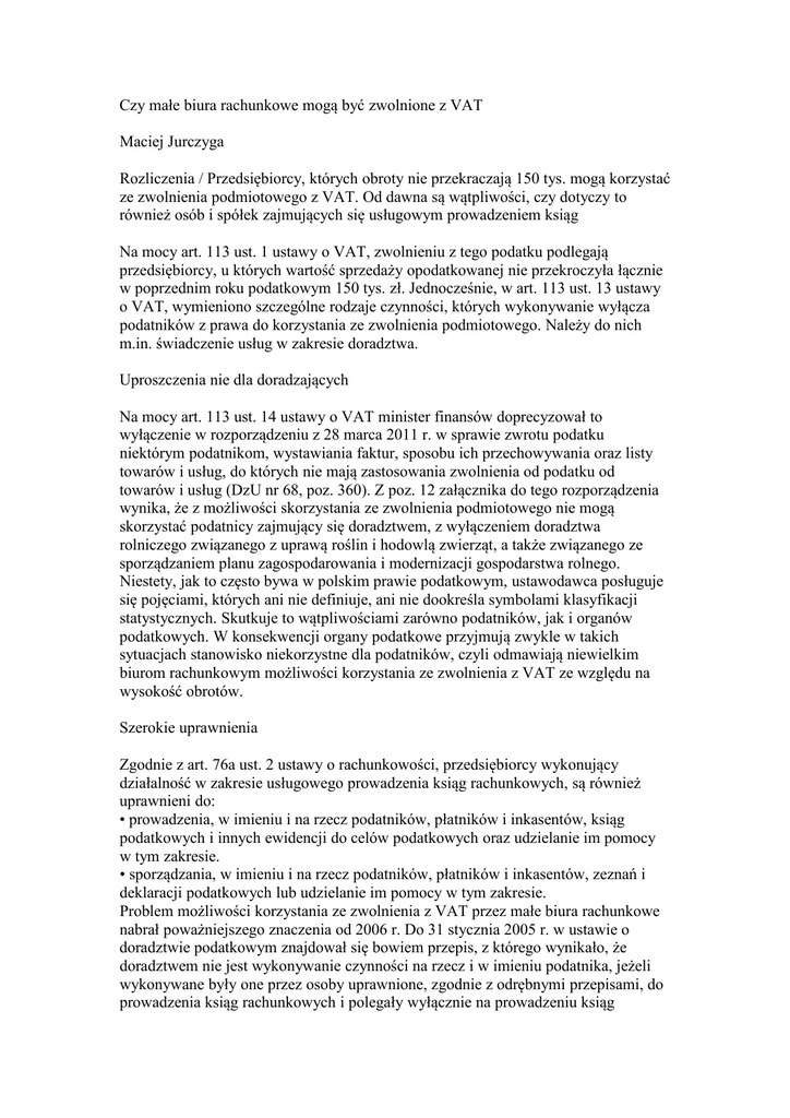 Czy małe biura rachunkowe mogą być zwolnione z VAT Maciej Jurczyga Rozliczenia / Przedsiębiorcy, których obroty nie przekraczają 150 tys. mogą korzystać ze zwolnienia podmiotowego z VAT. Od dawna są wątpliwości, czy dotyczy to również osób i spółek zajmujących się usługowym prowadzeniem ksiąg Na mocy art. 113 ust. 1 ustawy o VAT, zwolnieniu z tego podatku podlegają przedsiębiorcy, u których wartość sprzedaży opodatkowanej nie przekroczyła łącznie w poprzednim roku podatkowym 150 tys. zł. Jednocześnie, w art. 113 ust. 13 ustawy o VAT, wymieniono szczególne rodzaje czynności, których wykonywanie wyłącza podatników z prawa do korzystania ze zwolnienia podmiotowego. Należy do nich m.in. świadczenie usług w zakresie doradztwa. Uproszczenia nie dla doradzających Na mocy art. 113 ust. 14 ustawy o VAT minister finansów doprecyzował to wyłączenie w rozporządzeniu z 28 marca 2011 r. w sprawie zwrotu podatku niektórym podatnikom, wystawiania faktur, sposobu ich przechowywania oraz listy towarów i usług, do których nie mają zastosowania zwolnienia od podatku od towarów i usług (DzU nr 68, poz. 360). Z poz. 12 załącznika do tego rozporządzenia wynika, że z możliwości skorzystania ze zwolnienia podmiotowego nie mogą skorzystać podatnicy zajmujący się doradztwem, z wyłączeniem doradztwa rolniczego związanego z uprawą roślin i hodowlą zwierząt, a także związanego ze sporządzaniem planu zagospodarowania i modernizacji gospodarstwa rolnego. Niestety, jak to często bywa w polskim prawie podatkowym, ustawodawca posługuje się pojęciami, których ani nie definiuje, ani nie dookreśla symbolami klasyfikacji statystycznych. Skutkuje to wątpliwościami zarówno podatników, jak i organów podatkowych. W konsekwencji organy podatkowe przyjmują zwykle w takich sytuacjach stanowisko niekorzystne dla podatników, czyli odmawiają niewielkim biurom rachunkowym możliwości korzystania ze zwolnienia z VAT ze względu na wysokość obrotów. Szerokie uprawnienia Zgodnie z art. 76a ust. 2 ustawy o rachunkowości, przedsiębiorcy wykonujący działalność w zakresie usługowego prowadzenia ksiąg rachunkowych, są również uprawnieni do: • prowadzenia, w imieniu i na rzecz podatników, płatników i inkasentów, ksiąg podatkowych i innych ewidencji do celów podatkowych oraz udzielanie im pomocy w tym zakresie. • sporządzania, w imieniu i na rzecz podatników, płatników i inkasentów, zeznań i deklaracji podatkowych lub udzielanie im pomocy w tym zakresie. Problem możliwości korzystania ze zwolnienia z VAT przez małe biura rachunkowe nabrał poważniejszego znaczenia od 2006 r. Do 31 stycznia 2005 r. w ustawie o doradztwie podatkowym znajdował się bowiem przepis, z którego wynikało, że doradztwem nie jest wykonywanie czynności na rzecz i w imieniu podatnika, jeżeli wykonywane były one przez osoby uprawnione, zgodnie z odrębnymi przepisami, do prowadzenia ksiąg rachunkowych i polegały wyłącznie na prowadzeniu ksiąg rachunkowych bądź innych ksiąg i ewidencji do celów podatkowych oraz sporządzaniu zeznań i deklaracji na podstawie danych wynikających z tych ksiąg. Po usunięciu tego przepisu organy podatkowe doszły do wniosku, że wskazane czynności są od tego momentu czynnościami doradztwa podatkowego i wykluczają możliwość korzystania ze zwolnienia podmiotowego w VAT. Takie stanowisko wynikało z tego, że organy podatkowe poszukując prawnego zdefiniowania pojęcia „doradztwo” odwołały się do ustawy z 5 lipca 1996 r. o doradztwie podatkowym (j.t. DzU z 2011 r. nr 41, poz. 213, ze zm.). Zgodnie z art. 2 ust. 1 tej ustawy czynności doradztwa podatkowego obejmują: 1) udzielanie podatnikom, płatnikom i inkasentom, na ich zlecenie lub na ich rzecz, porad, opinii i wyjaśnień z zakresu ich obowiązków podatkowych i celnych oraz w sprawach egzekucji administracyjnej związanej z tymi obowiązkami, 2) prowadzenie, w imieniu i na rzecz podatników, płatników i inkasentów, ksiąg podatkowych i innych ewidencji do celów podatkowych oraz udzielanie im pomocy w tym zakresie, 3) sporządzanie, w imieniu i na rzecz podatników, płatników i inkasentów, zeznań i deklaracji podatkowych lub udzielanie im pomocy w tym zakresie, 4) reprezentowanie podatników, płatników i inkasentów w postępowaniu przed organami administracji publicznej i w zakresie sądowej kontroli decyzji, postanowień i innych aktów administracyjnych w sprawach wymienionych w pkt 1. Zawodowe wykonywanie tych czynności, co do zasady, zastrzeżone jest wyłącznie dla doradców podatkowych. Jednak podmiotami uprawnionymi do zawodowego wykonywania tych czynności są także adwokaci i radcowie prawni oraz biegli rewidenci (z wyłączeniem czynności, o których mowa w pkt 4). Natomiast czynności wymienione w pkt 2 i 3 mogą również wykonywać osoby posiadające certyfikat księgowy. Sąd po stronie podatników Ostatecznie zwyciężyła jednak inna wykładnia przepisów. Po wielu sporach (patrz tekst "Jak zmieniało się stanowisko fiskusa" organy skarbowe uznały, że skoro PKWiU różnicuje usługi w zakresie księgowości od usług doradztwa podatkowego, to małe biura biura rachunkowe mogą być zwolnione podmiotowo z VAT. Zgodziły się też, że ustawa o doradztwie podatkowym nie może przesądzać o konsekwencjach prawno-podatkowych w VAT. Za taką interpretacją przepisów opowiedział się też Wojewódzki Sąd Administracyjny w Gdańsku w wyroku z 28 marca 2012 r. (I SA/Gd 175/12, orzeczenie nieprawomocne). RAMKA (DO TEKSTU 1 LUB 2) Niezbędny jest certyfikat Zgodnie z art. 76a ust. 3 i 4 ustawy z 29 września 1994 r. o rachunkowości (t. j. Dz. U. z 2009 r. nr 152, poz. 1223, ze zm.), działalność w zakresie usługowego prowadzenia ksiąg rachunkowych mogą wykonywać osoby fizyczne posiadające certyfikat księgowy oraz inne podmioty, pod warunkiem, że czynności z tego zakresu będą wykonywane przez osoby posi