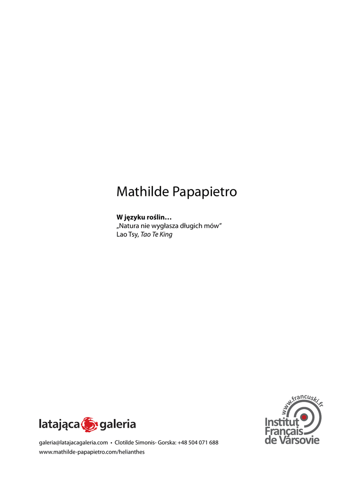 Mathilde Papapietro W języku roślin… „Natura nie wygłasza długich mów” Lao Tsy, Tao Te King [email protected] • Clotilde Simonis- Gorska: +48 504 071 688 www.mathilde-papapietro.com/helianthes W języku roślin… „Natura nie wygłasza długich mów.” Lao Tsy, Tao Te King Sztuka Mathilde Papapietro od samego początku była związana z roślinami. Tak, jak jej życie w domu na pustkowiu w prowansalskim Drome. Organiczny, symbiotyczny związek z naturą. Ogród, łąka, zarośla… Potem, w Polsce, poszukiwanie podobnej energii przyrody. Fotografowanie ogródków działkowych. Rośliny są u Mathilde tematem, inspiracją, motywem. Najczęściej są to te pospolite: trzciny, trawy, żarnowce, w ostatnim cyklu – płatki słonecznika. Graficzne. Z wyraźnym rysunkiem. Naturalizm. Linie łodyg, żyłkowania płatków, unerwienia liści… Rośliny były także tworzywem jej prac – jak igły w cyklu „Zasięg znaków”. Choć rośliny nie są one bezpośrednią materią jej prac, nie wprowadza żywych roślin w przestrzeń swojej sztuki, to zawsze są one u jej początku. Mathilde dokonuje interwencji, drobnych, choć czasem „bolesnych”: skręca źdźbła żarnowców, zapętla łodygi trzcin, naznacza je farbą, jak krwistą czerwienią, zgina i rozdziera płatki słoneczników, łączy je szypułkami… To, co naturalne poddaje dyktatowi gestu, by definiować formę artystyczną. By uzyskać czytelny zapis. Elegancję i kaligraficzny charakter. Z roślinnych fragmentów Mathilde Papapietro układa uniwersalny język natury. Zapisuje zmienną, nietrwałą mowę. Utrwala ją poprzez artystyczne działanie: śladem farby na łodygach trzciny, rysunkiem na kamieniu litograficznym, wycinaniem w zimnym, ostrym szkle, w chłodnym marmurze. Tej ulotnej, szepczącej mowie próbuje nadać trwały kształt – poprzez fotografię lub grafikę, lub łącząc te dwie techniki, jak w przypadku cyklu digigrafii, w której wykonane są „Helianthes”. Lub układając instalacje – z grawerowanych w płytach z marmuru z zarysami traw, czy jak teraz – z tafli luster z wyciętymi nich kształtami płatków słonecznika. Pismo i znak mają genealogię roślinną, wiele alfabetów bezpośrednio nawiązuje do kształtu roślin, jak alfabet runiczny. U Mathilde Papapietro ten kaligraficzny trop był zawsze obecny. Pismo to zapis języka. Sztuka Mathilde rozgrywa się także w tej przestrzeni, mówi o „gramatyce traw”, o morfologii łodyg, teraz – o składni płatków. Jej sztuka jest układaniem języka z wątków natury i zapisywaniem go. Kali-grafia. Grafika. Foto-grafia. Znaki. Elementy. Układy. Cykle. Serie. Jednak nie jest to chłodna kombinatoryka. W tym roślinnym języku zawiera się też pierwiastek kobiecy – subtelność, płynność, efemeryczność i tajemnica. Sztuka Mathilde posługuje się nie tylko językiem obrazów, realizuje się też w przestrzeni słów, wydobywając związki, analogie, asocjacje słowne. Językowy ślad zawierają także tytuły cykli Mathilde. W tytule jednego z jej cykli - „Ideogramy” (1991) – przedstawiającego „pismo traw”, po francusku usłyszeć można echo słowa graminées, które oznacza rośliny trawiaste. Także nazwa obecnej serii grafik – „Helianthes” – jest twórczością obrębie języka. „Helianthe” to słowo stworzone przez Mathilde. Wieloznaczne. Odwołuje się od łacińskiej nazwy słonecznika - heliantus, do etymologicznego źródłosłowu, nie zamyka jednak w przestrzeni botaniki. Otwiera na krąg solarnych odniesień. Prace z ostatniego cyklu Mathilde Papapietro przedstawiają płatki słonecznika. To kwiat słońca, energii, także w tym dosłownym znaczeniu –słonecznik jest przecież rośliną jadalną. To kwiat kojarzony z Południem Europy, z którego pochodzi Mathilde. Żółty kolor płatków to też odniesienie do chińskiej filozofii przypisującej tej barwie pozytywną energię ziemi. To kolor radości, harmonii i wewnętrznej równowagi. W „Żółcieniach” pociąga nas i zadziwia naturalizm ich przedstawienia, osiągnięty dzięki fotografowaniu z zastosowaniem dużej głębi ostrości, powiększeniu motywu do ponadnaturalnych rozmiarów, oczyszczeniu ze zbędnych szczegółów. Fascynująca jest intensywność i żywość koloru, wyrazistość szczegółów, wyraźnie widzimy żyłkowania płatków, meszek pokrywający ich szypułki, linie zgięć płatków oraz wrażenie przestrzenności i trójwymiarowości przedstawienia. Lecz jednocześnie naturalizm powoduje, że usłonecznione płatki stają się jakością wizualną „samą w sobie”. Im bardziej się im przyglądamy, tym oczywistość tego, co przedstawione znika. Zapominamy o słonecznikach, pojawiają się inne skojarzenia: podobieństwo do skrzydeł ptaków w locie, delikatnych tkanin, jesiennych liści, znaków pisma i zapisu nut. „Muzyczność” jest także istotną jakością prac Mathilde Papapietro. Muzyczność rozumiana jako porządek wszystkich elementów kompozycji, jako rytm, wzajemne dostrojenie, niczym harmoniczne porozumienie instrumentów w orkiestrze. Podkreślenie wartości kompozycji ma zapewne źródło w muzycznym wykształceniu artystki. Mathilde jest absolwentką Konserwatorium Muzycznego w Valence. Pierwsze „Żółcienie”, które powstały w 2008 roku, były spokojne, statyczne, jakby znieruchomiałe i delikatniejsze. Kolejne grafiki z cyklu są coraz bardziej dynamiczne, jakby rozwibrowane, emanują silną energią. Takie wrażenie wywołuje zarówno sposób ułożenia płatków, swobodnie rozrzuconych, ale także kompozycja wydobywająca wewnętrzne napięcia: motyw ciasno wypełnia niemal całą płaszczyznę lub przeciwnie – „unosi” się w przestrzeni. „Żółcienie” mają coś z tańca, z płynności ruchów tai chi, z lotu klucza ptaków. Mają „lekkość wiatru”, jak wrażliwie napisał o wcześniejszych pracach Mathilde Papapietro Michel Hardy. W przypadku „H