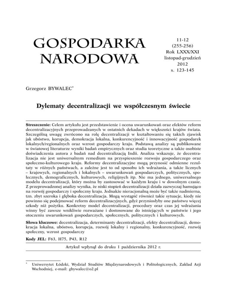 GOSPODARKA NARODOWA 11-12 (255-256) Rok LXXX/XXI listopad-grudzień 2012 s. 123-145 Grzegorz BYWALEC* Dylematy decentralizacji we współczesnym świecie Streszczenie: Celem artykułu jest przedstawienie i ocena uwarunkowań oraz efektów reform decentralizacyjnych przeprowadzanych w ostatnich dekadach w większości krajów świata. Szczególną uwagę zwrócono na rolę decentralizacji w kształtowaniu się takich zjawisk jak ubóstwo, korupcja, demokracja lokalna, konkurencyjność i innowacyjność gospodarek lokalnych/regionalnych oraz wzrost gospodarczy kraju. Podstawą analizy są publikowane w światowej literaturze wyniki badań empirycznych oraz studia teoretyczne a także osobiste doświadczenia autora z badań nad decentralizacją Indii. Analiza wskazuje, że decentralizacja nie jest uniwersalnym remedium na przyspieszenie rozwoju gospodarczego oraz społeczno-kulturowego kraju. Reformy decentralizacyjne mogą przynosić odmienne rezultaty w różnych państwach, a zależne jest to od sposobu ich wdrażania, a także licznych – krajowych, regionalnych i lokalnych – uwarunkowań gospodarczych, politycznych, społecznych, demograficznych, kulturowych, religijnych itp. Nie ma jednego, uniwersalnego modelu decentralizacji, który można by zastosować w każdym kraju i w dowolnym czasie. Z przeprowadzonej analizy wynika, że niski stopień decentralizacji działa zazwyczaj hamująco na rozwój gospodarczy i społeczny kraju. Jednakże nieracjonalną może być także nadmierna, tzn. zbyt szeroka i głęboka decentralizacja. Mogą wystąpić również takie sytuacje, kiedy nie powinno się podejmować reform decentralizacyjnych, gdyż przyniosłyby one państwu więcej szkody niż pożytku. Konkretny model decentralizacji, procedury oraz czas jej wdrażania winny być zawsze wnikliwie rozważane i dostosowane do istniejących w państwie i jego otoczeniu uwarunkowań gospodarczych, społecznych, politycznych i kulturowych. Słowa kluczowe: decentralizacja, determinanty decentralizacji, efekty decentralizacji, demokracja lokalna, ubóstwo, korupcja, rozwój lokalny i regionalny, konkurencyjność, rozwój społeczny, wzrost gospodarczy Kody JEL: F63, H75, P43, R12 Artykuł wpłynął do druku 1 października 2012 r. * Uniwersytet Łódzki, Wydział Studiów Międzynarodowych i Politologicznych, Zakład Azji Wschodniej, e-mail: [email protected] 124 GOSPODARKA NARODOWA Nr 11-12/2012 Wprowadzenie W ostatnich dekadach XX wieku i na początku bieżącego stulecia obserwuje się nasilenie reform ustrojowych w większości krajów świata. Polegają one – poza wyjątkami – na demokratyzacji i liberalizacji życia politycznego oraz gospodarczego. Jednym z najważniejszych, a często kluczowym, elementem tych reform jest decentralizacja. W polskiej literaturze ekonomicznej problematyka decentralizacji jest słabo reprezentowana. Większość publikacji, które ukazały się w ostatnich latach dotyczy decentralizacji w naszym kraju, czyli spraw związanych z reaktywowaniem po 1989 roku samorządu terytorialnego. Odczuwa się natomiast znaczny niedostatek prac o decentralizacji w jej szerszym kontekście i to zarówno studiów teoretycznych jak i prac opartych na badaniach empirycznych. To rozszerzone podejście do decentralizacji rozumieć należy: • jako badanie zachodzących obecnie procesów decentralizacyjnych w wymiarze światowym, bo obejmującym większość krajów, ze szczególnym uwzględnieniem licznej grupy państw rozwijających się, które niedawno rozpoczęły reformy decentralizacyjne; • jako badanie decentralizacji w całej jej złożoności, tzn. z uwzględnieniem szerokiej gamy uwarunkowań, czyli czynników ekonomicznych, społecznopolitycznych oraz kulturowych. Niniejszy artykuł jest próbą zmniejszenia tej luki. Przedstawiono w nim główne problemy decentralizacji, jej uwarunkowania oraz rolę w życiu gospodarczym i społeczno-politycznym współczesnych państw, ze szczególnym uwzględnieniem licznej grupy krajów rozwijających się i wdrażających w ostatnich dekadach reformy decentralizacyjne1. Decentralizacja – ustalenia definicyjne W ogólnym ujęciu, decentralizację rozumie się jako przekazywanie zadań i kompetencji państwa w dół – do jednostek terytorialnych niższego szczebla [Borodo, 2000, s. 17]. Natomiast dokładniej rzecz ujmując wyróżnia się zazwyczaj trzy formy (rodzaje) decentralizacji [Crawford, Hartman, 2008, s. 9], [Manor, 1999, s. 5], [Schneider, 2003]: • dewolucję (decentralizację demokratyczną) oznaczającą transfer władztwa (kompetencji) od rządu centralnego do niezależnych i demokratycznie wybranych władz niższego szczebla (czyli samorządów terytorialnych – regionalnych i/lub lokalnych), • dekoncentrację (decentralizację administracyjną) rozumianą jako przekazywanie władzy i środków od rządu centralnego do regionalnych i lokalnych jego oddziałów (agend), 1 Autor dziękuje Recenzentom za przekazane uwagi i wskazówki, które przyczyniły się do poprawy treści i formy artykułu. Grzegorz Bywalec, Dylematy decentralizacji we współczesnym świecie 125 • decentralizację fiskalną czyli przekazywanie władztwa fiskalnego oraz środków finansowych jednostkom zdekoncentrowanym oraz samorządom terytorialnym. Dewolucja jest najwyższą formą decentralizacji. Mówimy o niej wówczas, gdy władza centralna nadaje demokratycznie wyłonionym władzom terytorialnym (regionom, gminom) określoną dozę autonomii na swym obszarze wyrażającą się w uprawnieniach do tworzenia prawa, jego egzekucji i kontroli w określonych dziedzinach życia społecznego oraz gospodarczego. Władze wykonawcze tych jednostek są odpowiedzialne za realizację zadań przed swoimi (regionalnymi, lokalnymi) organami ustawodawczymi pochodzącymi z demokratycznych wyborów. W ramach decentralizacji administracyjnej można wyodrębnić [Schneider, 2003] dwie jej odmiany: dekoncentrację i delegację. Dekoncentracja o