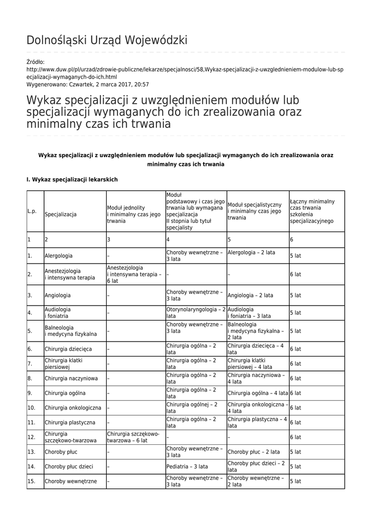 Dolnośląski Urząd Wojewódzki Źródło: http://www.duw.pl/pl/urzad/zdrowie-publiczne/lekarze/specjalnosci/58,Wykaz-specjalizacji-z-uwzglednieniem-modulow-lub-sp ecjalizacji-wymaganych-do-ich.html Wygenerowano: Czwartek, 2 marca 2017, 20:57 Wykaz specjalizacji z uwzględnieniem modułów lub specjalizacji wymaganych do ich zrealizowania oraz minimalny czas ich trwania Wykaz specjalizacji z uwzględnieniem modułów lub specjalizacji wymaganych do ich zrealizowania oraz minimalny czas ich trwania I. Wykaz specjalizacji lekarskich Moduł podstawowy i czas jego Moduł specjalistyczny trwania lub wymagana i minimalny czas jego specjalizacja trwania II stopnia lub tytuł specjalisty Łączny minimalny czas trwania szkolenia specjalizacyjnego 6 Specjalizacja Moduł jednolity i minimalny czas jego trwania 1 2 3 4 1. Alergologia – Choroby wewnętrzne – Alergologia – 2 lata 3 lata 2. Anestezjologia i intensywna terapia Anestezjologia i intensywna terapia – – 6 lat 3. Angiologia – 4. Audiologia i foniatria – 5. Balneologia i medycyna fizykalna – 6. Chirurgia dziecięca – 7. Chirurgia klatki piersiowej – 8. Chirurgia naczyniowa – 9. Chirurgia ogólna – 10. Chirurgia onkologiczna – 11. Chirurgia plastyczna – 12. Chirurgia szczękowo-twarzowa Chirurgia szczękowotwarzowa – 6 lat 13. Choroby płuc – 14. Choroby płuc dzieci – 15. Choroby wewnętrzne – L.p. 5 – Choroby wewnętrzne – Angiologia – 2 lata 3 lata Otorynolaryngologia – 2 lata Choroby wewnętrzne – 3 lata Chirurgia ogólna – 2 lata Chirurgia ogólna – 2 lata Chirurgia ogólna – 2 lata Chirurgia ogólna – 2 lata Chirurgia ogólnej – 2 lata Chirurgia ogólna – 2 lata – Audiologia i foniatria – 3 lata Balneologia i medycyna fizykalna – 2 lata Chirurgia dziecięca – 4 lata Chirurgia klatki piersiowej – 4 lata Chirurgia naczyniowa – 4 lata 5 lat 6 lat 5 lat 5 lat 5 lat 6 lat 6 lat 6 lat Chirurgia ogólna – 4 lata 6 lat Chirurgia onkologiczna – 6 lat 4 lata Chirurgia plastyczna – 4 6 lat lata – 6 lat Choroby wewnętrzne – Choroby płuc – 2 lata 5 lat 3 lata Choroby płuc dzieci – 2 Pediatria – 3 lata 5 lat lata Choroby wewnętrzne – Choroby wewnętrzne – 5 lat 3 lata 2 lata 16. Choroby zakaźne 17. Dermatologia i wenerologia Choroby zakaźne – 5 lat Dermatologia i wenerologia – 5 lat 18. Diabetologia – Choroby wewnętrzne – Diabetologia – 2 lata 3 lata 5 lat 19. Diagnostyka laboratoryjna Diagnostyka laboratoryjna – 5 lat – 5 lat 20. Endokrynologia – Choroby wewnętrzne – Endokrynologia – 2 lata 5 lat 3 lata – Specjalizacja II stopnia lub tytuł specjalisty w dziedzinie położnictwa i ginekologii – 5 lat Endokrynologia ginekologiczna i rozrodczość – 2 lata Pediatria – 3 lata Endokrynologia i diabetologia dziecięca 5 lat – 2 lata – – 5 lat – – 5 lat – 21. Endokrynologia ginekologiczna i rozrodczość 22. Endokrynologia – i diabetologia dziecięca 23. Epidemiologia Epidemiologia – 4 lata – – 4 lata 24. Farmakologia kliniczna Farmakologia kliniczna – – 4 lata – 4 lata 25. Gastroenterologia – Choroby wewnętrzne – Gastroenterologia – 3 3 lata lata 26. Gastroenterologia dziecięca – Pediatria – 3 lata 27. Genetyka kliniczna 28. Geriatria 29. Ginekologia onkologiczna 30. Hematologia 31. Hipertensjologia Genetyka kliniczna – 4 – lata Choroby wewnętrzne – – 3 lata Specjalizacja II stopnia lub tytuł specjalisty – w dziedzinie położnictwa i ginekologii – 5 lat Choroby wewnętrzne – – 3 lata Specjalizacja II stopnia lub tytuł specjalisty w dziedzinie chorób – wewnętrznych, kardiologii, kardiologii dziecięcej, nefrologii, nefrologii dziecięcej lub pediatrii – 5 lat 7 lat 6 lat Gastroenterologia dziecięca – 3 lata 6 lat – 4 lata Geriatria – 2 lata 5 lat Ginekologia onkologiczna – 2 lata 7 lat Hematologia – 3 lata 6 lat Hipertensjologia – 2 lata 7 lat Choroby wewnętrzne – 3 lata 32. 33. Immunologia kliniczna Immunologia kliniczna – 5 lat 2 lata – Specjalizacja II stopnia lub tytuł specjalisty w dziedzinie chirurgii dziecięcej, chirurgii klatki piersiowej, chirurgii naczyniowej, chirurgii ogólnej, chirurgii onkologicznej, chorób płuc, chorób płuc dzieci, chorób wewnętrznych, Intensywna terapia – 2 chorób zakaźnych, lata kardiologii, kardiologii dziecięcej, nefrologii, nefrologii dziecięcej, neonatologii, neurochirurgii, neurologii, neurologii dziecięcej, pediatrii lub toksykologii klinicznej – 5–6 lat 7–8 lat – 6 lat Intensywna terapia – Kardiochirurgia Kardiochirurgia – 6 lat 35. Kardiologia – 36. Kardiologia dziecięca – 37. Medycyna lotnicza – 38. Medycyna morska i tropikalna – 39. Medycyna nuklearna Medycyna nuklearna – – 5 lat 40. Medycyna paliatywna – 41. Medycyna pracy – 42. Medycyna ratunkowa 43. Medycyna rodzinna 34. – Choroby wewnętrzne – Kardiologia – 3 lata 3 lata Kardiologia dziecięca – Pediatria – 3 lata 2 lata Choroby wewnętrzne – Medycyna lotnicza – 2 3 lata lata Choroby wewnętrzne – Medycyna morska 3 lata i tropikalna – 2 lata – 6 lat 5 lat 5 lat 5 lat 5 lat Choroby wewnętrzne – Medycyna paliatywna – 5 lat 3 lata 2 lata Choroby wewnętrzne – Medycyna pracy – 2 lata 5 lat 3 lata Medycyna ratunkowa – – – 5 lat 5 lat Medycyna rodzinna – 4 – – 4 lata lata Medycyna sądowa – 5 – lat Medycyna sportowa – – 5 lat Mikrobiologia lekarska – – 4 lata Choroby wewnętrzne – – 3 lata 44. Medycyna sądowa 45. Medycyna sportowa 46. Mikrobiologia lekarska 47. Nefrologia 48. Nefrologia dziecięca – Pediatria – 3 lata 49. 50. 51. Neonatologia Neurochirurgia Neurologia Pediatria – 3 lata – – 52. Neurologia dziecięca – Neurochirurgia – 6 lat Neurologia – 5 lat Neurologia dziecięca – 5 lat Nefrologia dziecięca – 2 lata Neonatologia – 2 lata – – – – 53. Neuropatologia – Patomorfologia – 3 lata Neuropatologia – 2 lata 5 lat