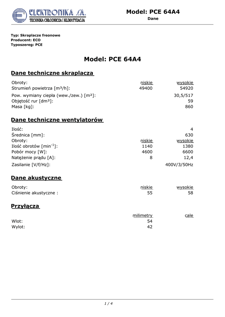 Model: PCE 64A4 Dane Typ: Skraplacze freonowe Producent: ECO Typoszereg: PCE Model: PCE 64A4 Dane techniczne skraplacza Obroty: Strumień powietrza [m³/h]: niskie 49400 Pow. wymiany ciepła (wew./zew.) [m²]: Objętość rur [dm³]: Masa [kg]: wysokie 54920 30,5/517 59 860 Dane techniczne wentylatorów Ilość: Średnica [mm]: Obroty: Ilość obrotów [min-1]: Pobór mocy [W]: Natężenie prądu [A]: niskie 1140 4600 8 Zasilanie [V/f/Hz]: 4 630 wysokie 1380 6600 12,4 400V/3/50Hz Dane akustyczne Obroty: Ciśnienie akustyczne : niskie 55 wysokie 58 milimetry 54 42 cale Przyłącza Wlot: Wylot: 1/4 Model: PCE 64A4 Wydajność R404A/R507 Wydajność chłodnicza [kW] (wysokie obroty) TD \ ta 8 10 12 14 16 18 20 15 110.55 138.18 165.82 193.45 221.09 248.73 276.36 20 109.35 136.68 164.02 191.36 218.69 246.03 273.37 25 107.74 134.67 161.61 188.54 215.48 242.41 269.35 30 105.90 132.37 158.85 185.32 211.80 238.27 264.75 35 104.01 130.01 156.01 182.02 208.02 234.02 260.02 40 102.25 127.81 153.37 178.93 204.50 230.06 255.62 45 100.79 125.99 151.19 176.39 201.59 226.78 251.98 50 99.83 124.78 149.74 174.69 199.65 224.61 249.56 40 95.16 118.95 142.74 166.53 190.32 214.11 237.90 45 93.81 117.26 140.71 164.16 187.61 211.07 234.52 50 92.91 116.13 139.36 162.59 185.81 209.04 232.27 Wydajność chłodnicza [kW] (niskie obroty) TD \ ta 8 10 12 14 16 18 20 15 102.88 128.61 154.33 180.05 205.77 231.49 257.21 20 101.77 127.21 152.65 178.10 203.54 228.98 254.42 25 100.27 125.34 150.41 175.48 200.54 225.61 250.68 30 98.56 123.20 147.84 172.48 197.12 221.76 246.40 35 96.80 121.00 145.20 169.40 193.60 217.80 242.00 Warunki robocze: wysokość - 0 m n.p.m, lamele aluminiowe TD - Różnica między temperaturą skraplania a temperaturą otoczenia [K] ta - Temperatura otoczenia [ºC] 2/4 Model: PCE 64A4 Wymiary A B C D 3230 2000 1820 1970 mm mm mm mm 3/4 Model: PCE 64A4 Zdjęcie 4/4