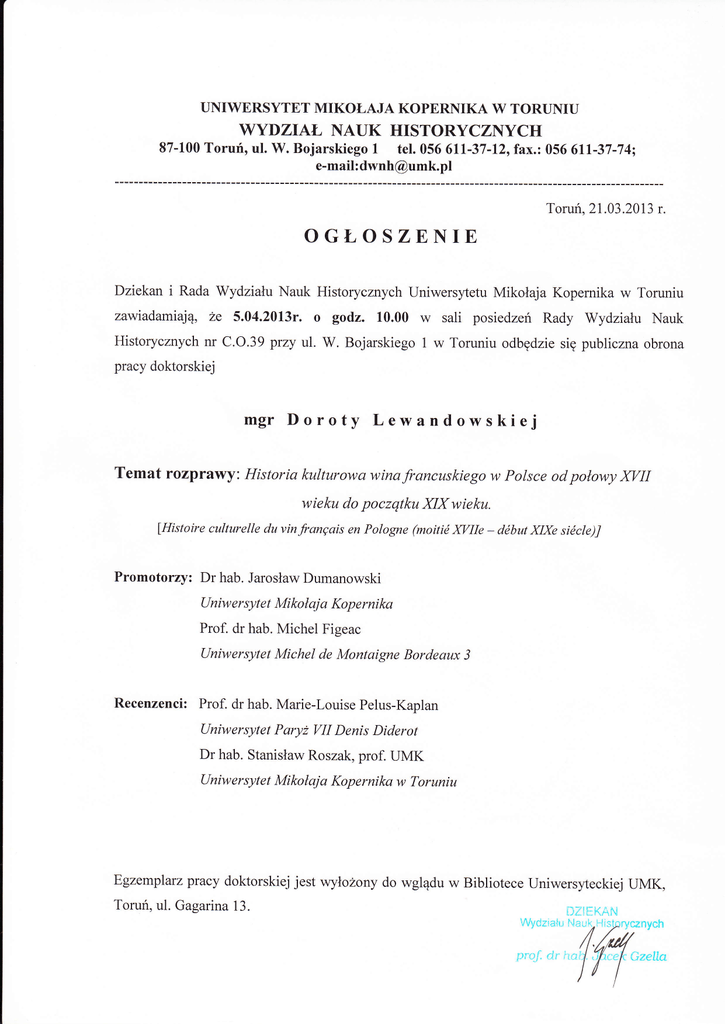 OGŁOSZENIE - Wydział Nauk Historycznych UMK