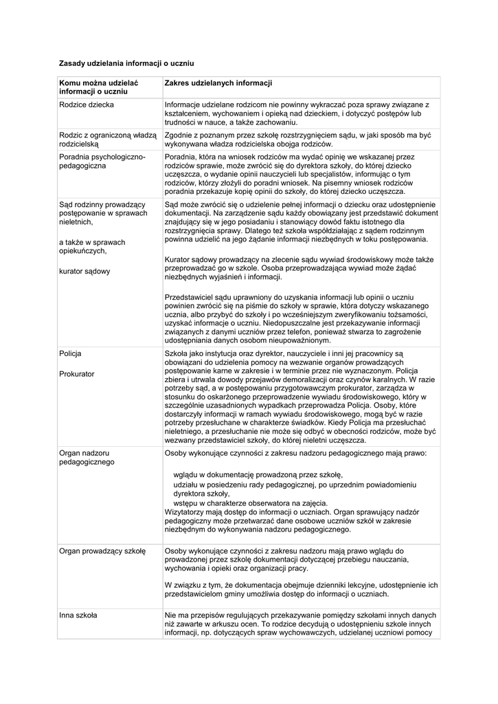 Zasady udzielania informacji o uczniu Komu można udzielać informacji o uczniu Zakres udzielanych informacji Rodzice dziecka Informacje udzielane rodzicom nie powinny wykraczać poza sprawy związane z kształceniem, wychowaniem i opieką nad dzieckiem, i dotyczyć postępów lub trudności w nauce, a także zachowaniu. Rodzic z ograniczoną władzą rodzicielską Zgodnie z poznanym przez szkołę rozstrzygnięciem sądu, w jaki sposób ma być wykonywana władza rodzicielska obojga rodziców. Poradnia psychologicznopedagogiczna Poradnia, która na wniosek rodziców ma wydać opinię we wskazanej przez rodziców sprawie, może zwrócić się do dyrektora szkoły, do której dziecko uczęszcza, o wydanie opinii nauczycieli lub specjalistów, informując o tym rodziców, którzy złożyli do poradni wniosek. Na pisemny wniosek rodziców poradnia przekazuje kopię opinii do szkoły, do której dziecko uczęszcza. Sąd rodzinny prowadzący postępowanie w sprawach nieletnich, Sąd może zwrócić się o udzielenie pełnej informacji o dziecku oraz udostępnienie dokumentacji. Na zarządzenie sądu każdy obowiązany jest przedstawić dokument znajdujący się w jego posiadaniu i stanowiący dowód faktu istotnego dla rozstrzygnięcia sprawy. Dlatego też szkoła współdziałając z sądem rodzinnym powinna udzielić na jego żądanie informacji niezbędnych w toku postępowania. a także w sprawach opiekuńczych, kurator sądowy Kurator sądowy prowadzący na zlecenie sądu wywiad środowiskowy może także przeprowadzać go w szkole. Osoba przeprowadzająca wywiad może żądać niezbędnych wyjaśnień i informacji. Przedstawiciel sądu uprawniony do uzyskania informacji lub opinii o uczniu powinien zwrócić się na piśmie do szkoły w sprawie, która dotyczy wskazanego ucznia, albo przybyć do szkoły i po wcześniejszym zweryfikowaniu tożsamości, uzyskać informacje o uczniu. Niedopuszczalne jest przekazywanie informacji związanych z danymi uczniów przez telefon, ponieważ stwarza to zagrożenie udostępniania danych osobom nieupoważnionym. Policja Prokurator Organ nadzoru pedagogicznego Szkoła jako instytucja oraz dyrektor, nauczyciele i inni jej pracownicy są obowiązani do udzielenia pomocy na wezwanie organów prowadzących postępowanie karne w zakresie i w terminie przez nie wyznaczonym. Policja zbiera i utrwala dowody przejawów demoralizacji oraz czynów karalnych. W razie potrzeby sąd, a w postępowaniu przygotowawczym prokurator, zarządza w stosunku do oskarżonego przeprowadzenie wywiadu środowiskowego, który w szczególnie uzasadnionych wypadkach przeprowadza Policja. Osoby, które dostarczyły informacji w ramach wywiadu środowiskowego, mogą być w razie potrzeby przesłuchane w charakterze świadków. Kiedy Policja ma przesłuchać nieletniego, a przesłuchanie nie może się odbyć w obecności rodziców, może być wezwany przedstawiciel szkoły, do której nieletni uczęszcza. Osoby wykonujące czynności z zakresu nadzoru pedagogicznego mają prawo: wglądu w dokumentację prowadzoną przez szkołę, udziału w posiedzeniu rady pedagogicznej, po uprzednim powiadomieniu dyrektora szkoły, wstępu w charakterze obserwatora na zajęcia. Wizytatorzy mają dostęp do informacji o uczniach. Organ sprawujący nadzór pedagogiczny może przetwarzać dane osobowe uczniów szkół w zakresie niezbędnym do wykonywania nadzoru pedagogicznego. Organ prowadzący szkołę Osoby wykonujące czynności z zakresu nadzoru mają prawo wglądu do prowadzonej przez szkolę dokumentacji dotyczącej przebiegu nauczania, wychowania i opieki oraz organizacji pracy. W związku z tym, że dokumentacja obejmuje dzienniki lekcyjne, udostępnienie ich przedstawicielom gminy umożliwia dostęp do informacji o uczniach. Inna szkoła Nie ma przepisów regulujących przekazywanie pomiędzy szkołami innych danych niż zawarte w arkuszu ocen. To rodzice decydują o udostępnieniu szkole innych informacji, np. dotyczących spraw wychowawczych, udzielanej uczniowi pomocy psychologiczno-pedagogicznej. Bez zgody rodziców dyrektor szkoły nie może przekazywać danych o uczniach. Pomoc społeczna Świadczenie pomocy materialnej o charakterze socjalnym przyznaje wójt (burmistrz, prezydent miasta), ale rada gminy może upoważnić kierownika ośrodka pomocy społecznej do prowadzenia postępowania w tych sprawach. Świadczenia przyznawane są także na wniosek dyrektora szkoły, który powinien w nim zawrzeć dane uzasadniające jego przyznanie. Aby wniosek był rozpatrzony pozytywnie, dyrektor powinien udostępnić wszystkie niezbędne informacje o sytuacji rodzinnej ucznia. Upublicznianie na stronie www i tablicy ogłoszeń informacji o uczniach Zdaniem GIODO: publikowanie na stronie www danych osobowych ucznia i jego osiągnięć sportowych jest legalne tylko wtedy, jeśli istnieją przesłanki z art. 23 ust. 1 ustawy o ochronie danych osobowych, publikowania list z wynikami egzaminów zgodne z art. 23 ust. 1 pkt 2 ustawy o ochronie danych osobowych, publikowanie wyników postępowania rekrutacyjnego zgodne z art. 20zb ust. 2 pkt 2 i art. 20zc ust. 3 ustawy o systemie oświaty, udostępnianie w Internecie ocen uczniów oraz ich wizerunku jest nielegalne bez zgody osób, których dotyczą, wywieszenia w miejscu publicznie dostępnym listy uczniów, których nie można zabierać na wycieczki szkolne, ponieważ nie zostali ubezpieczeni uznane zostało za rażące naruszenie obowiązku prawidłowego zabezpieczenia danych osobowych, noszenie przez uczniów identyfikatorów zawierających imię, nazwisko ucznia, wizerunek ucznia i nazwę klasy jest dopuszczalne, jeśli wynika to ze statutu szkoły