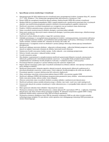 1. Specyfikacja systemu monitoringu i wizualizacji • Oprogramowanie SCADA dedykowane do wizualizacji pracy przepompowni ścieków, komputer klasy PC, monitor 21,5”, UPS, Windows 7 Pro, komercyjne oprogramowanie antywirusowe z licencją na 2 lata. Router GPRS do zarządzania transferem danych pełniący funkcję bramki GPRS dla systemu wizualizacji Modem GSM do wysyłania komunikatów SMS o stanach alarmowych z możliwością ustawiania listy wysyłanych alarmów oraz możliwością przypisania numerów telefonów do poszczególnych sygnałów alarmowych. Możliwość ustawiania wysyłania komunikatów po wystąpieniu oraz po usunięciu stanu alarmowego. Pendrive 16GB do automatycznego wykonywania kopii bazy danych Status wszystkich monitorowanych obiektów dostępny z poziomu jednej zakładki Status pracy pomp oraz aktywnych stanów alarmowych dostępny z poziomu paska statusowego, zlokalizowanego w górnej części ekranu Możliwość wyboru obiektu do analizy z mapy lub z poziomu statusu Zakładka prezentująca w szczegółach pracę przepompowni ścieków z animacją poziomu, rysowaniem cykli pracy pomp i zmianami poziomu ścieków, wyświetlaniem stanu przełączników trybu pracy, informacją o awarii pomp, zaniku zasilania, zasilaniu modułu MT, włamaniu do komory lub szafki, itd. Informowanie o wystąpieniu awarii na obiektach w postaci jednego zbiorczego ekranu pop-up, komunikatów dźwiękowych Możliwość zdalnego sterownia obiektem : załączenia wybranej pompy , całkowitej blokady pompowni, odczytu danych na żądanie, kasowania włamania do obiektu, kasowania awarii zbiorczej Sumaryczny licznik czasu pracy każdej z pomp , liczby załączeń , czas ostatniego pompowania Dobowy licznik czasu pracy i załączeń każdej z pomp Licznik remontowy pomp Dla obiektów wyposażonych w przepływomierze możliwość generowania bilansów rocznych, miesięcznych, dobowych, godzinowych w dowolnym przedziale czasowym , w przypadku braku przepływomierza należy zaimplementować uśredniony licznik przepływu wyliczany z wydajności pompy i czasu jej pracy Prezentacja bilansów przepływu w postaci tabelarycznej lub wykresów słupkowych Raport zdarzeń zawierający pełen zapis wszystkich zaistniałych na obiekcie zdarzeń oraz operacji wykonanych przez obsługę na obiekcie Możliwość generowania i eksportu raportów zdarzeń rocznych, miesięcznych, dobowych, godzinowych w dowolnym przedziale czasowym: czasów pracy i ilości załączeń, licznika przepływu do exela oraz do pdf-a, Prezentacja raportów w postaci tabelarycznej lub wykresów słupkowych Okno zawierające statystykę wykorzystania pakietu danych GPRS oraz poziom sygnału GSM Możliwość zdalnego (GPRS) lub lokalnego programowania parametrów pracy obiektu: ustawiania poziomów, limitu czasu pracy pomp, zakresu sondy, czasu zalegania Zbiorcze zestawienie stanu wszystkich obiektów na jednej zakładce z podstawowymi danymi pracy Możliwość pobrania statusu modułu telemetrycznego z obiektu: stan wejść, wyjść oraz wejść analogowych Generowanie danych do systemu wizualizacji w trybie zdarzeniowym, a w przypadku braku zdarzeń w trybie czasowym Brak ograniczeń odnośnie ilości obiektów włączonych do systemu Wykonawca dostarczy karty SIM telemetryczne z stałym adresem IP w prywatnym APN-ie, z opłaconą transmisją danych przez cały okres trwania okresu gwarancji urządzeń. W zależności od poziomu sygnału GSM w danej lokalizacji obiektu należy zastosować karty SIM od różnych operatorów. Wykonawca dostarczy dodatkowo karty SIM do transmisji wiadomości SMS na cały okres trwania rozruchu technologicznego urządzeń. Po tym okresie wybór operatora sieci obsługującego transmisję SMS pozostanie po stronie Zamawiającego. • • • • • • • • • • • • • • • • • • • • • • • • • •