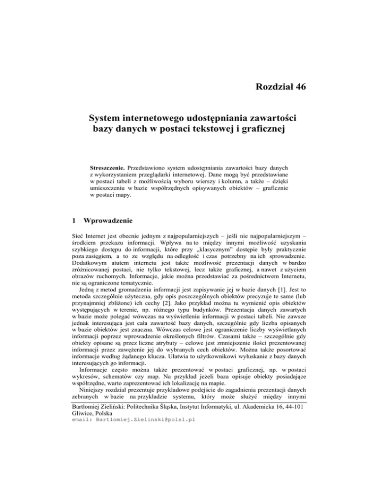 Rozdział 46 System internetowego udostępniania zawartości bazy danych w postaci tekstowej i graficznej Streszczenie. Przedstawiono system udostępniania zawartości bazy danych z wykorzystaniem przeglądarki internetowej. Dane mogą być przedstawiane w postaci tabeli z możliwością wyboru wierszy i kolumn, a także – dzięki umieszczeniu w bazie współrzędnych opisywanych obiektów – graficznie w postaci mapy. 1 Wprowadzenie Sieć Internet jest obecnie jednym z najpopularniejszych – jeśli nie najpopularniejszym – środkiem przekazu informacji. Wpływa na to między innymi możliwość uzyskania szybkiego dostępu do informacji, które przy „klasycznym” dostępie były praktycznie poza zasięgiem, a to ze względu na odległość i czas potrzebny na ich sprowadzenie. Dodatkowym atutem internetu jest także możliwość prezentacji danych w bardzo zróżnicowanej postaci, nie tylko tekstowej, lecz także graficznej, a nawet z użyciem obrazów ruchomych. Informacje, jakie można przedstawiać za pośrednictwem Internetu, nie są ograniczone tematycznie. Jedną z metod gromadzenia informacji jest zapisywanie jej w bazie danych [1]. Jest to metoda szczególnie użyteczna, gdy opis poszczególnych obiektów precyzuje te same (lub przynajmniej zbliżone) ich cechy [2]. Jako przykład można tu wymienić opis obiektów występujących w terenie, np. różnego typu budynków. Prezentacja danych zawartych w bazie może polegać wówczas na wyświetleniu informacji w postaci tabeli. Nie zawsze jednak interesująca jest cała zawartość bazy danych, szczególnie gdy liczba opisanych w bazie obiektów jest znaczna. Wówczas celowe jest ograniczenie liczby wyświetlanych informacji poprzez wprowadzenie określonych filtrów. Czasami także – szczególnie gdy obiekty opisane są przez liczne atrybuty – celowe jest zmniejszenie ilości prezentowanej informacji przez zawężenie jej do wybranych cech obiektów. Można także posortować informacje według żądanego klucza. Ułatwia to użytkownikowi wyłuskanie z bazy danych interesujących go informacji. Informacje często można także prezentować w postaci graficznej, np. w postaci wykresów, schematów czy map. Na przykład jeżeli baza opisuje obiekty posiadające współrzędne, warto zaprezentować ich lokalizację na mapie. Niniejszy rozdział prezentuje przykładowe podejście do zagadnienia prezentacji danych zebranych w bazie na przykładzie systemu, który może służyć między innymi Bartłomiej Zieliński: Politechnika Śląska, Instytut Informatyki, ul. Akademicka 16, 44-101 Gliwice, Polska email: [email protected] B. Zieliński do tekstowego i graficznego przedstawienia informacji na temat lokalizacji stacji bazowych sieci telefonii komórkowej. Informacja taka może być pomocna podczas orientacyjnego określania miejsca przebywania. 2 Geneza problemu Zagadnienie prezentacji zawartości bazy danych przez Internet pojawiło się podczas tworzenia strony internetowej, przedstawiającej dane dotyczące stacji bazowych jednej z sieci telefonii komórkowej. Dane te obejmują informacje, jakie można odczytać z telefonu komórkowego z włączonym monitorem sieci [3], [4], a także informacje na temat lokalizacji geograficznej stacji bazowej. Do danych podawanych przez telefon należą numer obszaru przywołań (LAC, ang. Location Area Code) oraz identyfikator komórki (CID, ang. Cell Identification). Kody te są liczbami z zakresu 0 – 65535. Pojedyncza lokalizacja stacji bazowej obsługuje zazwyczaj kilka komórek (tzn. na jednym maszcie znajduje się kilka anten, po jednej na komórkę). W opisywanej sieci komórki takie różnią się tylko najmniej znaczącą cyfrą kodu CID. Pozostałe cyfry można więc traktować jako identyfikator lokalizacji stacji bazowej. Z kolei identyfikator obszaru przywołań określa ogólnie obszar, na którym znajduje się stacja bazowa. W opisywanej sieci pojedynczy obszar przywołań obejmuje np. kilka sąsiadujących ze sobą miast. Informacje dotyczące lokalizacji stacji bazowej określają adres oraz przybliżone współrzędne geograficzne. Powiązanie danych podawanych przez telefon komórkowy ze współrzędnymi geograficznymi stacji bazowych umożliwia przybliżone określenie aktualnej lokalizacji telefonu (i jego użytkownika). Dokładność ta zależy od gęstości rozmieszczenia stacji bazowych i wielu innych czynników, wpływających na propagację fal radiowych. Bez stosowania dodatkowych mechanizmów wspierających lokalizację można przyjąć, że dokładność ta jest rzędu kilkuset metrów, co w niektórych przypadkach jest wystarczające. Dane zebrane są w pliku typu DBF. Wybór ten podyktowany jest zamiarem zapewnienia możliwości aktualizacji danych przy użyciu komputerów starszej generacji, na których zainstalowany jest tylko system operacyjny MS-DOS. Ponadto format pliku DBF, jako znany od dawna, jest dobrze udokumentowany (np. [5]), co umożliwia względnie łatwą realizację przetwarzania danych pochodzących z bazy poprzez samodzielne napisanie odpowiednich procedur. W najprostszym przypadku dane te można publikować na stronie internetowej przez wygenerowanie kodu w języku HTML, który przedstawia wszystkie informacje zawarte w bazie w postaci tabeli według ustalonego porządku. W tym celu stworzono specjalne narzędzie, które odczytuje kolejno dane z pliku DBF [5] i umieszcza je w wynikowym pliku HTML. Rozwiązanie to, aczkolwiek proste, ma kilka wad. Przede wszystkim dane w bazie muszą zostać posortowane według określonego klucza przed konwersją. Poza tym nie ma możliwości dynamicznego wpływania na postać wynikowej tabeli. Przy objętości bazy danych rzędu kilkudziesięciu rekordów utrudnia to odnalezienie właściwej informacji. 388 System internetowego udostępniania zawartości bazy danych... 3 Rozwiązanie problemu Problem prezentacji danych pochodzących z opisanej bazy rozwiązano przez zbudowanie systemu, umożliwi