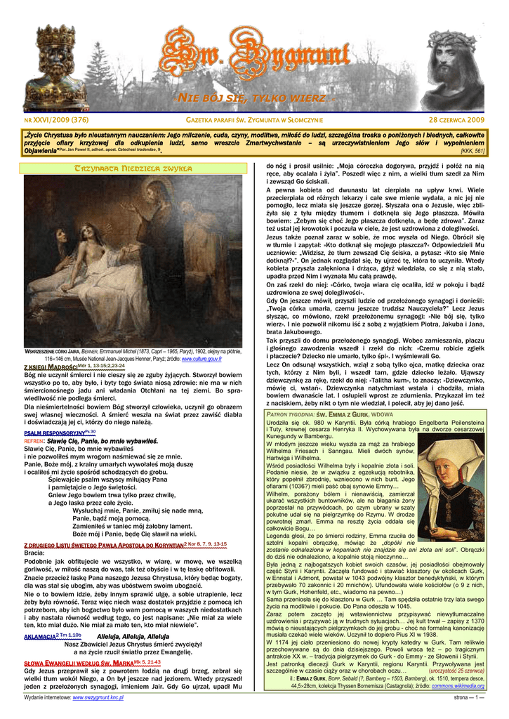 NIE BÓJ SIĘ, TYLKO WIERZ…« » NR XXVI/2009 (376) GAZETKA PARAFII ŚW. ZYGMUNTA W SŁOMCZYNIE 28 CZERWCA 2009 „Życie Chrystusa było nieustannym nauczaniem: Jego milczenie, cuda, czyny, modlitwa, miłość do ludzi, szczególna troska o poniżonych i biednych, całkowite przyjęcie ofiary krzyżowej dla odkupienia ludzi, samo wreszcie Zmartwychwstanie – są urzeczywistnieniem Jego słów i wypełnieniem Objawienia”Por. Jan Paweł II, adhort. apost. Catechesi tradendae, 9. [KKK, 561] TRZYNASTA NIEDZIELA ZWYKŁA WSKRZESZENIE CÓRKI JAIRA, BENNER, Emmanuel Michel (1873, Capri – 1965, Paryż), 1902, olejny na płótnie, 116146 cm, Musée National Jean-Jacques Henner, Paryż; źródło: www.culture.gouv.fr Z KSIĘGI MĄDROŚCIMdr 1, 13-15;2,23-24 Bóg nie uczynił śmierci i nie cieszy się ze zguby żyjących. Stworzył bowiem wszystko po to, aby było, i byty tego świata niosą zdrowie: nie ma w nich śmiercionośnego jadu ani władania Otchłani na tej ziemi. Bo sprawiedliwość nie podlega śmierci. Dla nieśmiertelności bowiem Bóg stworzył człowieka, uczynił go obrazem swej własnej wieczności. A śmierć weszła na świat przez zawiść diabła i doświadczają jej ci, którzy do niego należą. PSALM RESPONSORYJNYPs 30 REFREN: Sławię Cię, Panie, bo mnie wybawiłeś. Sławię Cię, Panie, bo mnie wybawiłeś i nie pozwoliłeś mym wrogom naśmiewać się ze mnie. Panie, Boże mój, z krainy umarłych wywołałeś moją duszę i ocaliłeś mi życie spośród schodzących do grobu. Śpiewajcie psalm wszyscy miłujący Pana i pamiętajcie o Jego świętości. Gniew Jego bowiem trwa tylko przez chwilę, a Jego łaska przez całe życie. Wysłuchaj mnie, Panie, zmiłuj się nade mną, Panie, bądź moją pomocą. Zamieniłeś w taniec mój żałobny lament. Boże mój i Panie, będę Cię sławił na wieki. Z DRUGIEGO LISTU ŚWIĘTEGO PAWŁA APOSTOŁA DO KORYNTIAN2 Kor 8, 7, 9, 13-15 Bracia: Podobnie jak obfitujecie we wszystko, w wiarę, w mowę, we wszelką gorliwość, w miłość naszą do was, tak też obyście i w tę łaskę obfitowali. Znacie przecież łaskę Pana naszego Jezusa Chrystusa, który będąc bogaty, dla was stał się ubogim, aby was ubóstwem swoim ubogacić. Nie o to bowiem idzie, żeby innym sprawić ulgę, a sobie utrapienie, lecz żeby była równość. Teraz więc niech wasz dostatek przyjdzie z pomocą ich potrzebom, aby ich bogactwo było wam pomocą w waszych niedostatkach i aby nastała równość według tego, co jest napisane: „Nie miał za wiele ten, kto miał dużo. Nie miał za mało ten, kto miał niewiele”. AKLAMACJA2 Tm 1,10b Alleluja, Alleluja, Alleluja Nasz Zbawiciel Jezus Chrystus śmierć zwyciężył a na życie rzucił światło przez Ewangelię. SŁOWA EWANGELII WEDŁUG ŚW. MARKAMk 5, 21-43 Gdy Jezus przeprawił się z powrotem łodzią na drugi brzeg, zebrał się wielki tłum wokół Niego, a On był jeszcze nad jeziorem. Wtedy przyszedł jeden z przełożonych synagogi, imieniem Jair. Gdy Go ujrzał, upadł Mu Wydanie internetowe: www.swzygmunt.knc.pl do nóg i prosił usilnie: „Moja córeczka dogorywa, przyjdź i połóż na nią ręce, aby ocalała i żyła”. Poszedł więc z nim, a wielki tłum szedł za Nim i zewsząd Go ściskali. A pewna kobieta od dwunastu lat cierpiała na upływ krwi. Wiele przecierpiała od różnych lekarzy i całe swe mienie wydała, a nic jej nie pomogło, lecz miała się jeszcze gorzej. Słyszała ona o Jezusie, więc zbliżyła się z tyłu między tłumem i dotknęła się Jego płaszcza. Mówiła bowiem: „Żebym się choć Jego płaszcza dotknęła, a będę zdrowa”. Zaraz też ustał jej krowotok i poczuła w ciele, że jest uzdrowiona z dolegliwości. Jezus także poznał zaraz w sobie, że moc wyszła od Niego. Obrócił się w tłumie i zapytał: »Kto dotknął się mojego płaszcza?« Odpowiedzieli Mu uczniowie: „Widzisz, że tłum zewsząd Cię ściska, a pytasz: »Kto się Mnie dotknął?«”. On jednak rozglądał się, by ujrzeć tę, która to uczyniła. Wtedy kobieta przyszła zalękniona i drżąca, gdyż wiedziała, co się z nią stało, upadła przed Nim i wyznała Mu całą prawdę. On zaś rzekł do niej: »Córko, twoja wiara cię ocaliła, idź w pokoju i bądź uzdrowiona ze swej dolegliwości«. Gdy On jeszcze mówił, przyszli ludzie od przełożonego synagogi i donieśli: „Twoja córka umarła, czemu jeszcze trudzisz Nauczyciela?” Lecz Jezus słysząc, co mówiono, rzekł przełożonemu synagogi: »Nie bój się, tylko wierz«. I nie pozwolił nikomu iść z sobą z wyjątkiem Piotra, Jakuba i Jana, brata Jakubowego. Tak przyszli do domu przełożonego synagogi. Wobec zamieszania, płaczu i głośnego zawodzenia wszedł i rzekł do nich: »Czemu robicie zgiełk i płaczecie? Dziecko nie umarło, tylko śpi«. I wyśmiewali Go. Lecz On odsunął wszystkich, wziął z sobą tylko ojca, matkę dziecka oraz tych, którzy z Nim byli, i wszedł tam, gdzie dziecko leżało. Ująwszy dziewczynkę za rękę, rzekł do niej: »Talitha kum«, to znaczy: »Dziewczynko, mówię ci, wstań«. Dziewczynka natychmiast wstała i chodziła, miała bowiem dwanaście lat. I osłupieli wprost ze zdumienia. Przykazał im też z naciskiem, żeby nikt o tym nie wiedział, i polecił, aby jej dano jeść. PATRON TYGODNIA: ŚW. EMMA Z GURK, WDOWA Urodziła się ok. 980 w Karyntii. Była córką hrabiego Engelberta Peilensteina i Tuty, krewnej cesarza Henryka II. Wychowywana była na dworze cesarzowej Kunegundy w Bambergu. W młodym jeszcze wieku wyszła za mąż za hrabiego Wilhelma Friesach i Sanngau. Mieli dwóch synów, Hartwiga i Wilhelma. Wśród posiadłości Wilhelma były i kopalnie złota i soli. Podanie niesie, że w związku z egzekucją robotnika, który popełnił zbrodnię, wzniecono w nich bunt. Jego ofiarami (1036?) mieli paść obaj synowie Emmy… Wilhelm, porażony bólem i nienawiścią, zamierzał ukarać wszystkich buntowników, ale na błagania