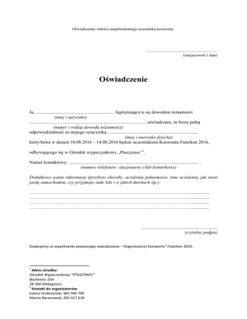 Oświadczenie rodzica niepełnoletniego uczestnika konwentu. ..................................................................... (miejscowość i data) Oświadczenie Ja, .................................................................. legitymujący/a się dowodem tożsamości (imię i nazwisko) .................................................................................................. oświadczam, że biorę pełną (numer i rodzaj dowodu tożsamości) odpowiedzialność za mojego syna/córkę..........................................................................., (imię i nazwisko dziecka) który/która w dniach 10.08.2016 – 14.08.2016 będzie uczestnikiem Konwentu Futerkon 2016, odbywającego się w Ośrodek wypoczynkowy „Ptaszyniec”1. Numer kontaktowy: ............................................................................................................. . (numery telefonów: stacjonarny i/lub komórkowy) Dodatkowe ważne informacje (przebyte choroby, uczulenia pokarmowe, inne uczulenia, jak znosi jazdę samochodem, czy przyjmuje stałe leki i w jakich dawkach itp.): …………………………………………………………………………………………............... …………………………………………………………………………………………............... …………………………………………………………………………………………............... …………………………………………………………………………………………............... ................................................................ (czytelny podpis) 2 Dziękujemy za wypełnienie powyższego oświadczenia – Organizatorzy Konwentu Futerkon 2016. 1 Adres ośrodka: Ośrodek Wypoczynkowy "PTASZYNIEC" Bocheniec 55A 28-366 Małogoszcz 2 Kontakt do organizatorów: Łukasz Grabczyński, 661 945 700 Marcin Baranowski, 692 617 618