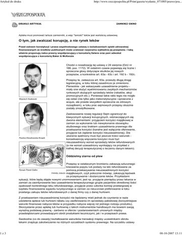 Artykuł do druku 1z3 http://www.rzeczpospolita.pl/Print/gazeta/wydanie_071005/prawo/pra... DRUKUJ ARTYKUŁ ZAMKNIJ OKNO Apteka musi promować tańsze zamienniki, a więc "taniość" leków jest wartością ustawową O tym, jak zwalczać korupcję, a nie rynek leków Przed ostrzem konstytucji i prawa wspólnotowego ustawę o świadczeniach opieki zdrowotnej finansowanych ze środków publicznych moŜe uratować racjonalna wykładnia jej przepisów. I taką właśnie proponują radca prawny współpracujący z kancelarią Salans oraz pani adwokat współpracująca z kancelarią Baker & McKenzie Chodzi o nowelizację tej ustawy z 24 sierpnia (DzU nr 166, poz. 1172). W ostatnim czasie pojawiają się liczne i sprzeczne głosy dotyczące skutków jej nowych przepisów, a konkretnie art. 63a - 63c i art. 192 b - 192c. Wojciech Kozłowski Paulina Kieszkowska-Knapik Przepisy te, zwłaszcza art. 63a, przeszły długą drogę legislacyjną, w toku której zasadniczo je zmieniono. Pierwotnie - jak wskazywało uzasadnienie projektu miały one słuŜyć wyeliminowaniu zwykłych mechanizmów rynkowych słuŜących sprzedaŜy leków (rabatów, akcji promocyjnych etc.). PoniewaŜ takie ratio legis nie mogło się ostać (nie tylko jako niekonstytucyjne i sprzeczne z acquis, ale przede wszystkim sprzeczne ze zdrowym rozsądkiem), w toku prac sejmowych przepisy słusznie zostały zmodyfikowane. Zastosowanie nowej regulacji Sejm ograniczył do klasycznych sytuacji korupcyjnych, odznaczających się dwoma elementami: przyjęciem korzyści majątkowej w zamian za wykonanie lub niewykonanie obowiązku słuŜbowego oraz brakiem uzasadnienia prawnego dla przekazania korzyści (karalne jest wyłącznie oferowanie, przyjęcie lub Ŝądanie korzyści nieuzasadnionej). Dla ukarania spełniony musi być jeszcze trzeci warunek konsekwencją wręczania korzyści musi być nieuzasadniony wzrost sprzedaŜy leków refundowanych (a nie wzrost uzasadniony wynikający na przykład z trafnej decyzji terapeutycznej o leczeniu danym lekiem). Oddzielmy ziarna od plew Przepisy w ostatecznym brzmieniu zakazują sztucznego kreowania popytu lub podaŜy na leki refundowane za Rysuje Paweł Gałka pomocą przekazywania nieuzasadnionych korzyści PAWEŁ GAŁKA majątkowych, czyli potocznie mówiąc, zakazują łapówek za przepisywanie i dostarczanie leków. Przykładami sytuacji, które będą objęte nowymi unormowaniami, jest np. przyjęcie pieniędzy przez lekarza w zamian za zaordynowanie bez uzasadnienia terapeutycznego grupie pacjentów określonej ilości opakowań konkretnego leku refundowanego, przyjęcie przez członka komisji przetargowej w szpitalu finansowania wyjazdu turystycznego w zamian za nieuczciwe preferowanie w toku przetargu zakupu leków refundowanych z danej firmy czy z danej hurtowni. Z przekazaniem nieuzasadnionej korzyści nie będziemy mieli jednak do czynienia w razie udzielenia aptece lub hurtowni rabatu czy zaoferowania im sprzedaŜy pakietowej (korzystniejsze warunki finansowe nabycia leków w przypadku nabycia więcej niŜ jednego rodzaju produktu). Skorzystanie przez aptekę lub hurtownię z takich instrumentów handlowych ma bowiem swoją wyraźną podstawę prawną - zarówno w ofercie i postanowieniach umownych między przedsiębiorcami prowadzącymi obrót produktami leczniczymi, jak i w przepisach prawa. Swobodne (co do zasady) kształtowanie warunków transakcji między uczestnikami obrotu lekami znajduje zakotwiczenie na róŜnych szczeblach systemu prawnego. Na szczeblu ustawy 08-10-2007 13:11 Artykuł do druku 2z3 http://www.rzeczpospolita.pl/Print/gazeta/wydanie_071005/prawo/pra... będzie to art. 353 1 kodeksu cywilnego (zasada swobody umów) oraz art. 6 ust 1 ustawy o swobodzie działalności gospodarczej (zasada domniemania swobody wykonywania działalności gospodarczej). Na szczeblu konstytucji zasadę wolności gospodarczej chroni art. 22. Z wolności tej korzysta takŜe pacjent, któremu rynek moŜe obniŜyć płaconą przez niego część ceny leku refundowanego. Pacjent jest nie ofiarą, ale beneficjentem rabatów. Wreszcie swobodę taką gwarantuje prawo wspólnotowe - zgodnie z art. 94 ust. 4 dyrektywy 2001/83/WE (tzw. farmaceutycznej) zakazy przekazywania korzyści osobom uprawnionym do przepisywania leków i ich dostarczania nie dotyczą praktyk handlowych odnoszących się do cen, marŜ i rabatów. Stosowanie rabatów, ofert promocyjnych czy sprzedaŜy pakietowej nie jest takŜe co do zasady zakazane przez art. 63c omawianej ustawy dotyczący róŜnicowania cen i stosowania niejednolitych warunków handlowych. Po pierwsze bowiem art. 63c dotyczy tylko relacji z hurtowniami, a sprzedaŜy leków przez hurtownie na rzecz aptek dotyczy tylko pośrednio, o tyle Ŝe warunki sprzedaŜy na rzecz aptek są częściowo ekonomicznie zaleŜne od warunków nabycia tych leków przez hurtownie. Po drugie, zakazane róŜnicowanie cen to stosowanie odmiennych cen wobec podmiotów znajdujących się w takiej samej sytuacji, co nie wyklucza moŜności stosowania rabatów wobec tych, którzy spełniają jednolite kryteria ich udzielania (np. poziom dotychczasowych zakupów, termin płatności etc.). Z kolei np. oferta sprzedaŜy dwóch róŜnych rodzajów leków w pakiecie po korzystniejszej cenie nie oznacza niejednolitego traktowania przedsiębiorców, gdy taki pakiet jest dostępny na takich samych zasadach dla wszystkich kontrahentów znajdujących się w takiej samej sytuacji. Pacjent - primus inter pares Art. 63 a - 63c nie ustanawiają takŜe samoistnego zakazu prowadzenia akcji skierowanych do pacjentów, w tym programów lojalnościowych opartych na zbieraniu punktów czy teŜ akcji typu "lek za grosz". W takim zakresie, w jakim takie akcje były dopuszczalne do tej pory, pozostają one dopuszczalne i teraz, po nowelizacji ustawy. Po pierwsze, nabycie leku przez pacjenta (konsumenta) nie stanowi jako takie nieuzasadnionej korzyści. śaden przepis prawa nie przewiduje obowiązku nabywan