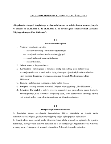 AKCJA DOKARMIANIA KOTÓW WOLNO ŻYJĄCYCH ,,Regulamin zakupu i bezpłatnego wydawania karmy suchej dla kotów wolno żyjących w okresie od 01.12.2016 r. do 28.02.2017 r. na terenie gmin członkowskich Związku Międzygminnego „Eko Siódemka”. §1 Postanowienia ogólne 1. Niniejszy regulamin określa: zasady weryfikacji opiekunów społecznych zasady dokarmiania kotów wolno żyjących zasady zakupu i wydawania karmy zasady kontroli. 2. Ilekroć mowa w Regulaminie o: a) Karmicielu – należy przez to rozumieć osobę pełnoletnią, która dobrowolnie sprawuje opiekę nad kotami wolno żyjących w tym zajmuje się ich dokarmianiem i jest wpisana do rejestru prowadzonego przez Związek Międzygminny „Eko Siódemka”, b) Kotach – należy przez to rozumieć koty wolno żyjące, c) Związku – należy przez to rozumieć Związek Międzygminny „Eko Siódemka”, d) Rejestrze Karmicieli - należy przez to rozumieć spis prowadzony przez Związek Międzygminny „Eko Siódemka” dotyczący osób, które dobrowolnie sprawują opiekę nad kotami wolno żyjących w tym zajmują się ich dokarmianiem. §2 Weryfikacja Karmicieli kotów 1. Bezpłatna karma przysługuje karmicielom, którzy mieszkają na terenie gmin członkowskich Związku, gdzie przebywają koty objęte opieką tychże opiekunów. 2. Karmicielem może zostać osoba fizyczna, która złoży wniosek o wpisanie do rejestru karmicieli, którego wzór stanowi załącznik nr 1 do niniejszego Regulaminu oraz wniosek o zakup karmy, którego wzór stanowi załącznik nr 2 do niniejszego Regulaminu. 3. Wnioski należy złożyć najpóźniej do dnia 10 listopada 2016r. 4. Złożone wnioski będą podlegały weryfikacji. W przypadku dużego zainteresowania akcją, decydować będzie kolejność złożenia wniosku oraz pozytywna opinia organizacji pozarządowej potwierdzającej dokarmianie kotów przez wnioskującą osobę. O podjętej decyzji Związek pisemnie powiadomi wnioskodawcę w terminie 14 dni od złożenia wniosku. §3 Dokarmianie kotów wolno żyjących 1. Karmiciel zobowiązuje się w ramach współpracy ze Związkiem: 1) prowadzić regularne dokarmianie kotów w stałym i bezpiecznym dla zwierząt miejscu; 2) przechowywać karmę przekazaną przez Związek w sposób zabezpieczający ją przed zniszczeniem lub zepsuciem; 3) sprawować opiekę nad kotami w zakresie ich dokarmiania we wskazanym miejscu za akceptacją/zgodą właściciela lub zarządcy nieruchomości; 4) dokarmiać koty w sposób nie stwarzający uciążliwości dla mieszkańców oraz zachować porządek i czystość w miejscu dokarmiania; 5) zgłaszać niezwłocznie do Związku zmianę danych wskazanych we wniosku o zakup karmy, o którym mowa w § 2 ust. 2, a w szczególności o ilości dokarmianych kotów oraz o fakcie zaprzestania dokarmiania. 2. Karmicielowi nie przysługuje jakiekolwiek wynagrodzenie lub świadczenie z tytułu realizowanego porozumienia. 3. Karmiciel wykonuje zadanie osobiście. 4. Karmiciel może powierzyć wykonywanie zadania innej osobie (czasowo w uzasadnionych i losowych przypadkach), lecz w pełni odpowiada za wykonanie porozumienia. §4 Zasady zakupu i wydawania karmy 1. Na realizację zadania związanego z dokarmianiem kotów, Związek zapewnia w budżecie na 2016 rok, łączną kwotę 10 000,00 zł. 2. Zakupem i wydawaniem karmy suchej dla kotów zajmuje się Związek. 3. Z uwagi na ograniczone środki budżetowe ustala się następujące warunki wydawania i wykładania karmy: 1) ustala się liczbę kotów, dla których wydawana będzie karma jednemu opiekunowi w ilości od 5 do 15 kotów, przyjmując limit – 1,5 kg karmy suchej/miesiąc/kot; 2) ilość wydawanej karmy jednemu opiekunowi stanowi iloczyn liczby kotów wskazanych we wniosku o zakup karmy i przyjętego limitu karmy na jednego kota na miesiąc; 3. Karma wydawana będzie Karmicielom we wcześniej ustalonych terminach, w biurach Związku Międzygminnego „Eko Siódemka” zlokalizowanych na: 1) ul. Kołłątaja 7 w Krotoszynie, pokój nr 58, 2) al. Powstańców Wlkp. 47 w Kobylinie, 3) ul. Grunwaldzkiej 41 w Cieszkowie, 4) ul. Rynek 2 w Zdunach, 5) ul. Rynek 11 w Sulmierzycach, 4. Wydawanie karmy odbywać się będzie za potwierdzeniem odbioru, którego wzór stanowi załącznik nr 3 do niniejszego Regulaminu. §5 Zasady kontroli 1. Związek Międzygminny „Eko Siódemka” zastrzega sobie prawo do przeprowadzania kontroli realizacji zadania powierzonego Karmicielowi. Kontrola może dotyczyć w szczególności wyznaczenia i zorganizowania miejsca dokarmiania kotów. 2. O terminie kontroli Związek nie ma obowiązku powiadamiać Karmiciela. 3. Kontrole przeprowadza się w miejscu i godzinach wskazanych we wniosku o przyznanie karmy. 4. Związek Międzygminny „Eko Siódemka” zastrzega sobie prawo rozwiązania współpracy z Karmicielem w przedmiocie zapewnienia opieki kotom wolno żyjących poprzez ich dokarmianie oraz wykreślenia z Rejestru Karmicieli z uwagi na nieprzestrzeganie zasad lub warunków współpracy, a w szczególności w przypadku: karmienia w niewłaściwym miejscu, tj. niebezpiecznym dla zwierząt lub bez zgody właściciela lub zarządcy nieruchomości, nieregularnego wykładania karmy, dysponowania karmą niezgodnie z przeznaczeniem, niewłaściwego przechowywania karmy, przekazania otrzymanej karmy osobom trzecim (za wyjątkiem czasowego przekazania zadania innej osobie w uzasadnionych i losowych przypadkach) lub nieodebrania karmy w wyznaczonym terminie.