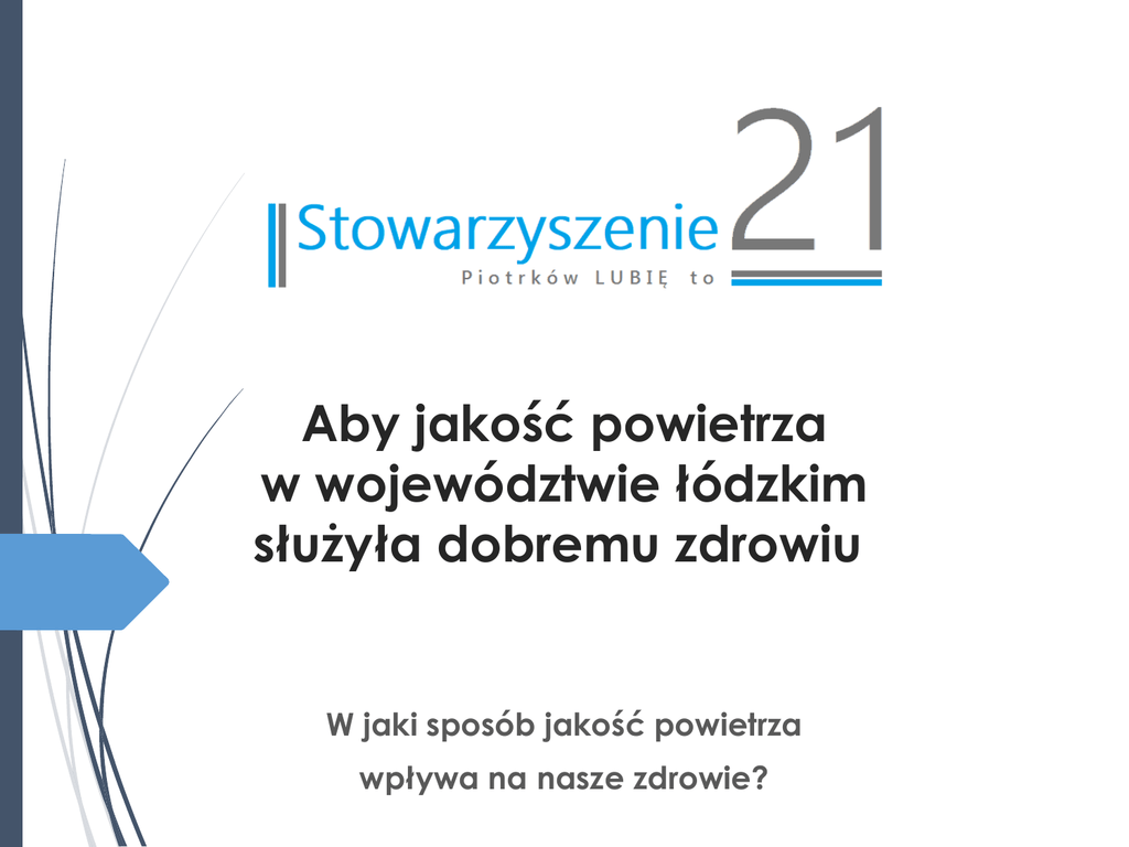 Aby jakość powietrza w województwie łódzkim służyła dobremu zdrowiu W jaki sposób jakość powietrza wpływa na nasze zdrowie? Oddychając zanieczyszczonym powietrzem chorujemy ! Polska jest krajem o największym zanieczyszczeniu powietrza w całej Unii Europejskiej Z tego powodu każdego roku, przedwcześnie umiera 43 000 około mieszkańców Polski (jest to co dziewiąty zgon) Dla porównania: każdego roku w wypadkach drogowych w Polsce ginie 3.300 osób Wachlarz chorób do jakich przyczynia się zanieczyszczenie powietrza jest wyjątkowo szeroki: • układ oddechowy: astma, rak płuca, przewlekła obturacyjna choroba płuc, częste infekcje dróg oddechowych; • układ krwionośny: zawał serca, nadciśnienie tętnicze, choroba niedokrwienna serca, zaburzenia rytmu serca, niewydolność serca • układ nerwowy: problemy z pamięcią i koncentracją, wyższy poziom niepokoju, stany depresyjne, zmiany anatomiczne w mózgu, choroba Alzhaimera, przyspieszone starzenie układu nerwowego, udar mózgu; • układ rozrodczy: bezpłodność, przedwczesny poród, obumarcie płodu Niestety zanieczyszczone powietrze ma również negatywny wpływ na płód Prowadzone w Krakowie badania - przez prof. Wiesława Jędrychowskiego - dowodzą, że kobiety, które podczas ciąży oddychały powietrzem o wysokim stężeniu benzo[a]pirenu rodzą dzieci o niższym wzroście, z mniejszą wagą urodzeniową, o mniejszym obwodzie głowy i niższym ilorazie inteligencji. Dzieci te są również mniej odporne na infekcje w późniejszym wieku Co robić podczas wysokich stężeń zanieczyszczeń? Na przykład w Krakowie dzieci nie wychodzą z budynku przedszkola, dorośli mieszkańcy coraz częściej zakładają maski przeciwpyłowe, nie uprawiają sportu na „powietrzu”, nie wietrzą mieszkań. Coraz częściej instalowane są instalacje przeciwpyłowe Warto się poważnie zastanowić nad konsekwencjami oddychania zanieczyszczonym powietrzem i postarać się o ograniczenie emisji zanieczyszczeń. Zacznijmy od siebie ! Dziękujemy za uwagę „Aby jakość powietrza w województwie łódzkim służyła dobremu zdrowiu” Projekt „Aby jakość powietrza w województwie łódzkim służyła dobremu zdrowiu” jest realizowany przez Stowarzyszenie „21” w ramach konkursu pn. „EDUKACJA EKOLOGICZNA MIESZKAŃCÓW WOJEWÓDZTWA ŁÓDZKIEGO – EDYCJA 2016” (obszar priorytetowy: edukacja ekologiczna obejmująca problematykę zanieczyszczeń powietrza oraz ich szkodliwego oddziaływania na zdrowie ludzi). Projekt ma na celu pokazanie zalet pozyskiwania energii ze źródeł odnawialnych oraz zaprezentowanie tego w jaki sposób wytwarzanie energii elektrycznej, w różny sposób, ma wpływ na zanieczyszczenie powietrza. Więcej o projekcie pod adresem: www.stowarzyszenie21.pl <<Projekty realizowane>> Wartość ogólna zadania: 14 650,00 PLN www.stowarzyszenie21.pl Dofinansowanie z WFOŚiGW w Łodzi: Dotacja w kwocie 10 100,00 PLN www.zainwestujwekologie.pl Projekt dofinansowany jest przez Wojewódzki Fundusz Ochrony Środowiska i Gospodarki Wodnej w Łodzi z siedzibą przy ul. Dubois 118, w Łodzi (93-465).