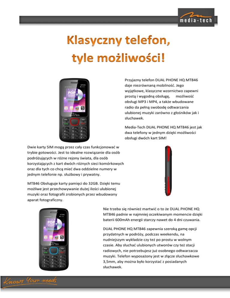 Przyjazny telefon DUAL PHONE HQ MT846 daje - Media-Tech