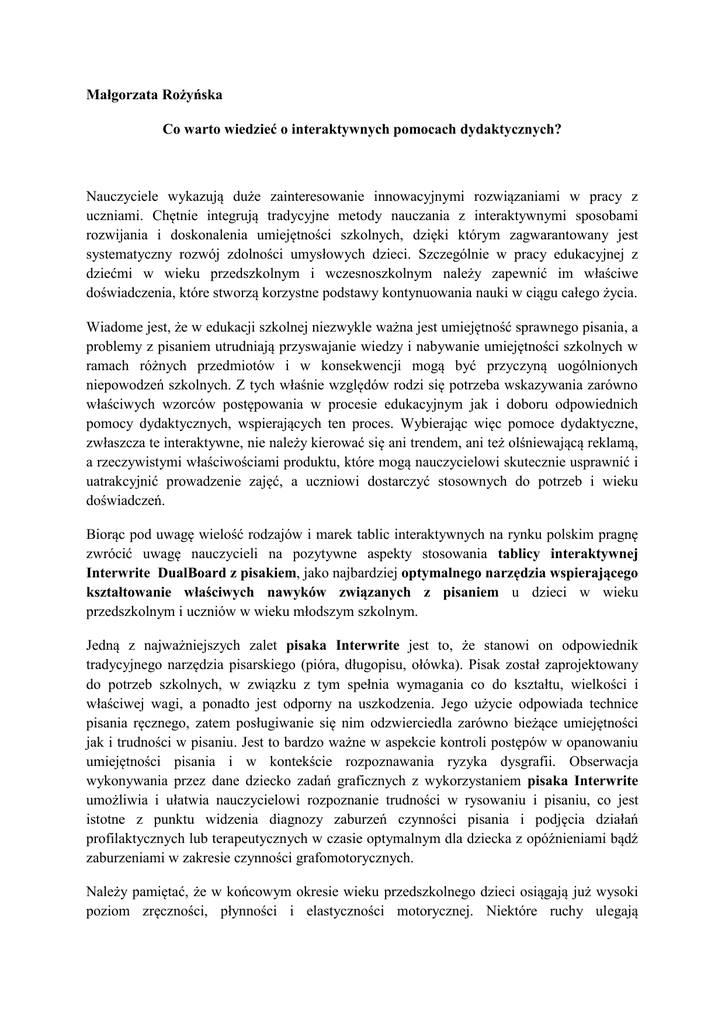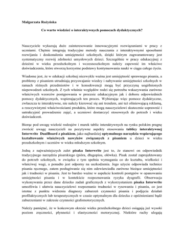 Małgorzata Rożyńska Co warto wiedzieć o interaktywnych pomocach dydaktycznych? Nauczyciele wykazują duże zainteresowanie innowacyjnymi rozwiązaniami w pracy z uczniami. Chętnie integrują tradycyjne metody nauczania z interaktywnymi sposobami rozwijania i doskonalenia umiejętności szkolnych, dzięki którym zagwarantowany jest systematyczny rozwój zdolności umysłowych dzieci. Szczególnie w pracy edukacyjnej z dziećmi w wieku przedszkolnym i wczesnoszkolnym należy zapewnić im właściwe doświadczenia, które stworzą korzystne podstawy kontynuowania nauki w ciągu całego życia. Wiadome jest, że w edukacji szkolnej niezwykle ważna jest umiejętność sprawnego pisania, a problemy z pisaniem utrudniają przyswajanie wiedzy i nabywanie umiejętności szkolnych w ramach różnych przedmiotów i w konsekwencji mogą być przyczyną uogólnionych niepowodzeń szkolnych. Z tych właśnie względów rodzi się potrzeba wskazywania zarówno właściwych wzorców postępowania w procesie edukacyjnym jak i doboru odpowiednich pomocy dydaktycznych, wspierających ten proces. Wybierając więc pomoce dydaktyczne, zwłaszcza te interaktywne, nie należy kierować się ani trendem, ani też olśniewającą reklamą, a rzeczywistymi właściwościami produktu, które mogą nauczycielowi skutecznie usprawnić i uatrakcyjnić prowadzenie zajęć, a uczniowi dostarczyć stosownych do potrzeb i wieku doświadczeń. Biorąc pod uwagę wielość rodzajów i marek tablic interaktywnych na rynku polskim pragnę zwrócić uwagę nauczycieli na pozytywne aspekty stosowania tablicy interaktywnej Interwrite DualBoard z pisakiem, jako najbardziej optymalnego narzędzia wspierającego kształtowanie właściwych nawyków związanych z pisaniem u dzieci w wieku przedszkolnym i uczniów w wieku młodszym szkolnym. Jedną z najważniejszych zalet pisaka Interwrite jest to, że stanowi on odpowiednik tradycyjnego narzędzia pisarskiego (pióra, długopisu, ołówka). Pisak został zaprojektowany do potrzeb szkolnych, w związku z tym spełnia wymagania co do kształtu, wielkości i właściwej wagi, a ponadto jest odporny na uszkodzenia. Jego użycie odpowiada technice pisania ręcznego, zatem posługiwanie się nim odzwierciedla zarówno bieżące umiejętności jak i trudności w pisaniu. Jest to bardzo ważne w aspekcie kontroli postępów w opanowaniu umiejętności pisania i w kontekście rozpoznawania ryzyka dysgrafii. Obserwacja wykonywania przez dane dziecko zadań graficznych z wykorzystaniem pisaka Interwrite umożliwia i ułatwia nauczycielowi rozpoznanie trudności w rysowaniu i pisaniu, co jest istotne z punktu widzenia diagnozy zaburzeń czynności pisania i podjęcia działań profilaktycznych lub terapeutycznych w czasie optymalnym dla dziecka z opóźnieniami bądź zaburzeniami w zakresie czynności grafomotorycznych. Należy pamiętać, że w końcowym okresie wieku przedszkolnego dzieci osiągają już wysoki poziom zręczności, płynności i elastyczności motorycznej. Niektóre ruchy ulegają automatyzacji, co jest widoczne w harmonijnym ich wykonywaniu. Bardzo istotnym przejawem wysokiego stopnia sprawności ruchów jest przewidywanie (antycypacja ruchowa), które przejawia się we wcześniejszym przystosowaniu pozycji ciała, ustawieniu ręki do czynności mającej nastąpić. (M. Dmochowska, 1979) W związku z tym zadaniem priorytetowym dla tego okresu rozwojowego jest wykształcenie u dziecka prawidłowego chwytu i nauka prowadzenia narzędzia pisarskiego z poprawnym chwytem (narzędzie oparte jest na palcu środkowym, trzymane przez kciuk i palec wskazujący, odległość palców od końcówki narzędzia piszącego wynosi ok. 1,5 do 2,5cm.). Właściwy rodzaj chwytu jest pożądany ze względu na optymalny sposób operowania narzędziem, chodzi o wytworzenie ekonomiczności, swobody i precyzji ruchów pisarskich. Należy wiedzieć, że zmiana nieprawidłowych nawyków w tym zakresie nie jest zadaniem łatwym, a niekiedy nawet niemożliwym. Ponadto ważnym celem oddziaływań dydaktycznych w zakresie pisania jest wdrożenie dziecka do umiejętnego posługiwania się narzędziem ze zwróceniem uwagi na ułożenie pozycji całego ciała. Jeśli dziecko jest w stanie dobrze skoordynować ruchy, to rezultatem jest kreślenie znaków graficznych linią ciągłą, ruchami swobodnymi, bez zbytniego napięcia mięśni i stawów. Braki koordynacji powodują widoczny, silny nacisk narzędzia na papier, szybko występujące objawy zmęczenia ręki, linie chwiejne, przerywane, o nierównym śladzie. W tej sytuacji konieczne jest stymulowanie i usprawnianie sprawności grafomotorycznej. W tym zadaniu pomocny może być pisak Interwrite. Wśród kolejnych zalet tego urządzenia należy wymienić: może mieć wpływ na stabilizację napięcia mięśniowego w obrębie ramion i barków, jeśli ustalimy z dzieckiem prawidłowy sposób posługiwania się narzędziem w pozycji stojącej i siedzącej (np. podczas pracy z kolejnym urządzeniem Interwrite, tabletem Mobi, obsługiwanym identycznym pisakiem, jak tablica interaktywna DualBoard.); umożliwia dziecku wykonywanie zadań wymagających planowania przestrzeni, co może sprzyjać rozwojowi jego wyobraźni przestrzennej i zwiększać koncentrację uwagi; korzystnie może wpływać na integrację sensoryczną, stymulując u dziecka sferę dotykową i proprioceptywną podczas trzymania pisaka i manipulowania nim po tablicy oraz podczas dozowania odpowiedniego nacisku w czasie wykonywania zadania graficznego, a także stymulując sferę przedsionkową podczas kontroli ruchów głowy, oczu i ręki; umożliwia wykonie ćwiczeń planowania ruchowego w obrębie oczu oraz płynności ruchów gałek ocznych podczas przekraczania linii środkowej ciała; stwarza możliwość do wykonywania ćwiczeń koordynacji wzrokowo- ruchowej podczas rysowania oburącz (tablica ma funkcję rozpoznawania z osobna dwóch pisaków, jest też możliwe ustawienie dwó
