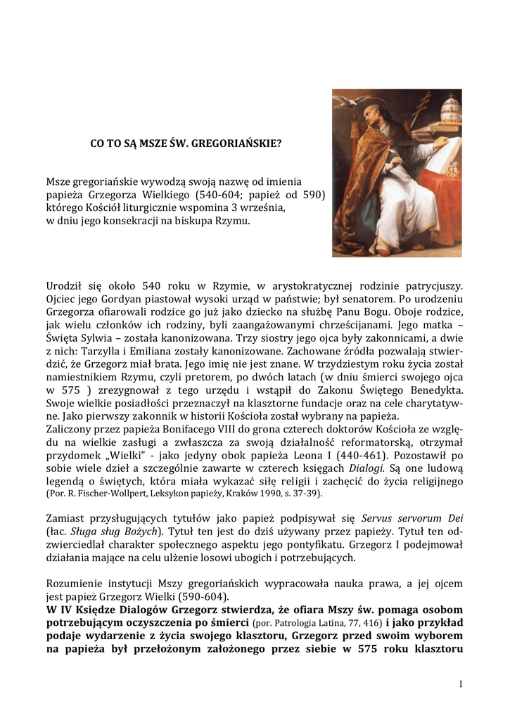 CO TO SĄ MSZE ŚW. GREGORIAŃSKIE? Msze gregoriańskie wywodzą swoją nazwę od imienia papieża Grzegorza Wielkiego (540-604; papież od 590) którego Kościół liturgicznie wspomina 3 września, w dniu jego konsekracji na biskupa Rzymu. Urodził się około 540 roku w Rzymie, w arystokratycznej rodzinie patrycjuszy. Ojciec jego Gordyan piastował wysoki urząd w państwie; był senatorem. Po urodzeniu Grzegorza ofiarowali rodzice go już jako dziecko na służbę Panu Bogu. Oboje rodzice, jak wielu członków ich rodziny, byli zaangażowanymi chrześcijanami. Jego matka – Święta Sylwia – została kanonizowana. Trzy siostry jego ojca były zakonnicami, a dwie z nich: Tarzylla i Emiliana zostały kanonizowane. Zachowane źródła pozwalają stwierdzić, że Grzegorz miał brata. Jego imię nie jest znane. W trzydziestym roku życia został namiestnikiem Rzymu, czyli pretorem, po dwóch latach (w dniu śmierci swojego ojca w 575 ) zrezygnował z tego urzędu i wstąpił do Zakonu Świętego Benedykta. Swoje wielkie posiadłości przeznaczył na klasztorne fundacje oraz na cele charytatywne. Jako pierwszy zakonnik w historii Kościoła został wybrany na papieża. Zaliczony przez papieża Bonifacego VIII do grona czterech doktorów Kościoła ze względu na wielkie zasługi a zwłaszcza za swoją działalność reformatorską, otrzymał przydomek „Wielki” - jako jedyny obok papieża Leona I (440-461). Pozostawił po sobie wiele dzieł a szczególnie zawarte w czterech księgach Dialogi. Są one ludową legendą o świętych, która miała wykazać siłę religii i zachęcić do życia religijnego (Por. R. Fischer-Wollpert, Leksykon papieży, Kraków 1990, s. 37-39). Zamiast przysługujących tytułów jako papież podpisywał się Servus servorum Dei (łac. Sługa sług Bożych). Tytuł ten jest do dziś używany przez papieży. Tytuł ten odzwierciedlał charakter społecznego aspektu jego pontyfikatu. Grzegorz I podejmował działania mające na celu ulżenie losowi ubogich i potrzebujących. Rozumienie instytucji Mszy gregoriańskich wypracowała nauka prawa, a jej ojcem jest papież Grzegorz Wielki (590-604). W IV Księdze Dialogów Grzegorz stwierdza, że ofiara Mszy św. pomaga osobom potrzebującym oczyszczenia po śmierci (por. Patrologia Latina, 77, 416) i jako przykład podaje wydarzenie z życia swojego klasztoru, Grzegorz przed swoim wyborem na papieża był przełożonym założonego przez siebie w 575 roku klasztoru 1 na wzgórzu Celio w Rzymie. Po śmierci jednego z mnichów imieniem Justus, w jego celi znaleziono trzy złote monety, których posiadanie sprzeciwiało się regule życia zakonnego, składali oni bowiem ślub ubóstwa. Grzegorz zastanawiał się, jak pomóc zmarłemu w oczyszczeniu się z tego grzechu. I wydał polecenie, aby przez trzydzieści kolejnych dni odprawiać Mszę św. w jego intencji. Po trzydziestu dniach zmarły Justus ukazał się w nocy jednemu z braci, Kopiozjuszowi, mówiąc, że został uwolniony od wszelkiej kary. Kopiozjusz nic nie wiedział o odprawianych Mszach św. i gdy później ujawnił treść swojego widzenia, pozostali współbracia doszli do wniosku, że nastąpiło ono w trzydziestym dniu, kiedy odprawiano Msze św. za Justusa. Uznano to za znak, że Msze św. odniosły oczekiwany skutek. Pod wpływem autorytetu Grzegorza - także jako biskupa Rzymu - zwyczaj odprawiania trzydziestu Mszy św. za osobę zmarłą zyskiwał swoje miejsce w praktyce religijnej Wiecznego Miasta. W Europie rozprzestrzeniał się stopniowo, począwszy od VIII wieku, najpierw w klasztorach, potem także w innych kościołach. Jeżeli chodzi o znaczenie Mszy gregoriańskich nie istnieje żadna oficjalna doktryna Kościoła związana z nimi. Powinny one być traktowane jako Msze św. za zmarłych. Zwyczaj ofiarowania Mszy św. za zmarłych jest tradycją przedgregoriańską, która została potwierdzona oficjalnie przez Sobór Trydencki jako najbardziej skuteczny sposób modlitwy za osoby, które potrzebują oczyszczenia po śmierci. Kościół jest przekonany o nieskończonej wartości Mszy św., wypływającej z zasług Chrystusa. Znaczenie to dotyczy nie tylko samych uczestników Mszy św., ale także osób lub spraw, w intencji których jest ona odprawiana przez kapłana. Zwyczaj odprawiania Mszy gregoriańskich znalazł swoje potwierdzenie przez Stolicę Apostolską dopiero w XIX wieku (istniały wątpliwości zgłaszane przez niektórych teologów zwłaszcza w XVI i XVII w.) i to wyłącznie jako pobożna praktyka wiernych, oparta na ich przeświadczeniu, które nie jest sprzeczne z nauką Kościoła. W wypadku Mszy gregoriańskich mamy więc do czynienia tylko z przekonaniem wiernych, które wskazywało zawsze na szczególną skuteczność powyższych Mszy św. Podobnie jak pozostałe intencje mszalne ofiarowane za osoby zmarłe, są one prośbą o uwolnienie zmarłego od konsekwencji grzechu. Sama liczba trzydzieści nie może być nigdy łączona z gwarancją wybawienia od pokuty po śmierci. W 1884 r. Kongregacja Odpustów Stolicy Apostolskiej wyjaśniła, że zaufanie wiernych do mszy gregoriańskich jako szczególnie skutecznych dla uwolnienia zmarłego od kary czyśćca należy uważać za rozumne i zgodne z wiarą. Człowiek, zgodnie ze swoją naturą, poszukuje pewności dotyczącej losu zmarłych. Msze gregoriańskie nie mogą być jednak podstawą takiej gwarancji. Człowiek może zawsze prosić, ale tym, który wysłuchuje próśb jest Bóg. Ostateczną wartość podobnych Mszy świętych zna tylko On. „On, który nawet własnego Syna nie oszczędził, ale Go za nas wszystkich wydał, jakże miałby wraz z Nim i wszystkiego nam nie darować?” (Rz 8,32) 2 Istnieją także szczegółowe regulacje kościelne dotyczące Mszy gregoriańskich. Określają one liczbę Mszy św. na trzydzieści odprawianych w trybie ciągłym. Wyjątkami od tej reguły mogą być nieprzewidziane przeszkody, takie jak np. choroba kapłana lub cele