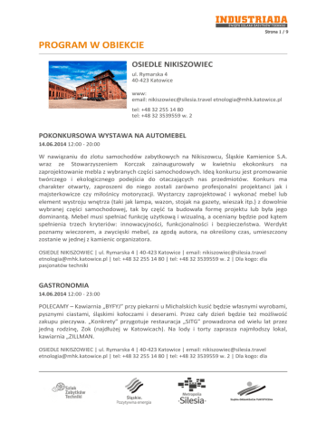 Strona 1 / 9 PROGRAM W OBIEKCIE OSIEDLE NIKISZOWIEC ul. Rymarska 4 40-423 Katowice www: email: [email protected] [email protected] tel: +48 32 255 14 80 tel: +48 32 3539559 w. 2 POKONKURSOWA WYSTAWA NA AUTOMEBEL 14.06.2014 12:00 - 20:00 W nawiązaniu do zlotu samochodów zabytkowych na Nikiszowcu, Śląskie Kamienice S.A. wraz ze Stowarzyszeniem Korczak zainaugurowały w kwietniu ekokonkurs na zaprojektowanie mebla z wybranych części samochodowych. Ideą konkursu jest promowanie twórczego i ekologicznego podejścia do otaczających nas przedmiotów. Konkurs ma charakter otwarty, zaproszeni do niego zostali zarówno profesjonalni projektanci jak i majsterkowicze czy miłośnicy motoryzacji. Wystarczy zaprojektować i wykonać mebel lub element wystroju wnętrza (taki jak lampa, wazon, stojak na gazety, wieszak itp.) z dowolnie wybranej części samochodowej, tak by część ta budowała formę projektu lub była jego dominantą. Mebel musi spełniać funkcję użytkową i wizualną, a oceniany będzie pod kątem spełnienia trzech kryteriów: innowacyjności, funkcjonalności i bezpieczeństwa. Werdykt poznamy wieczorem, a zwycięski mebel, za zgodą autora, na określony czas, umieszczony zostanie w jednej z kamienic organizatora. OSIEDLE NIKISZOWIEC | ul. Rymarska 4 | 40-423 Katowice | email: [email protected] [email protected] | tel: +48 32 255 14 80 | tel: +48 32 3539559 w. 2 | Dla kogo: dla pasjonatów techniki GASTRONOMIA 14.06.2014 12:00 - 23:00 POLECAMY – Kawiarnia „BYFYJ” przy piekarni u Michalskich kusić będzie własnymi wyrobami, pysznymi ciastami, śląskimi kołoczami i deserami. Przez cały dzień będzie też możliwość zakupu pieczywa. „Konkrety” przygotuje restauracja „SITG” prowadzona od wielu lat przez jedną rodzinę, Zok (najdłużej w Katowicach). Na lody i torty zaprasza najmłodszy lokal, kawiarnia „ZILLMAN. OSIEDLE NIKISZOWIEC | ul. Rymarska 4 | 40-423 Katowice | email: [email protected] [email protected] | tel: +48 32 255 14 80 | tel: +48 32 3539559 w. 2 | Dla kogo: dla Strona 2 / 9 wszystkich ZLOT SAMOCHODÓW ZABYTKOWYCH 14.06.2014 14:00 - 18:30 Zlot starych samochodów, czyli pojazdów zabytkowych, to wspaniałe uzupełnienie historii zakładów wydobywczych czy produkujących maszyny, urządzenia, materiały. To symbioza historii techniki i motoryzacji, dodatkowo propagująca coraz bardziej modną turystykę industrialną. Jest zjawiskiem znanym szeroko na zachodzie a w naszym kraju cieszy się coraz większym zainteresowaniem. OSIEDLE NIKISZOWIEC | ul. Rymarska 4 | 40-423 Katowice | email: [email protected] [email protected] | tel: +48 32 255 14 80 | tel: +48 32 3539559 w. 2 | Dla kogo: dla rodzin z dziećmi WYSTAWA U NOS W DOMA NA NIKISZU. WE WNĘTRZU NIKISZOWIECKIEGO MIESZKANIA 14.06.2014 14:00 - 20:00 Wystawa stała: „U nos w doma na Nikiszu. We wnętrzu nikiszowieckiego mieszkania”. Wystawa jest próbą odtworzenia warunków, w jakich mieszkały rodziny górników zatrudnionych w kopalni „Giesche”, później „Wieczorek”. Została przygotowana przy wykorzystaniu eksponatów ze zbiorów Działu Etnologii Miasta Muzeum Historii Katowic oraz darów, przez lata przekazywanych przez mieszkańców Nikiszowca istniejącej tu „Galerii Magiel”. Jednocześnie na wystawę może wejść ok. 20 osób. ODDZIAŁ MUZEUM HISTORII KATOWIC – DZIAŁ ETNOLOGII MIASTA | ul. Rymarska 4 | email: [email protected] [email protected] | tel: +48 32 255 14 80 | tel: +48 32 3539559 w. 2 | Dla kogo: dla rodzin z dziećmi WYSTAWA MISTRZOWIE GRUPY JANOWSKIEJ 14.06.2014 14:00 - 20:00 Wystawa stała: „Mistrzowie Grupy Janowskiej. Ociepka, Wróbel, Gawlik, Sówka”. Prezentacja wybranych prac czterech artystów nieprofesjonalnych tworzących w ramach Grupy Janowskiej, która od 1946 roku zrzeszała malarzy amatorów – pracowników kopalni „Wieczorek”. Sławę zdobyli zarówno indywidualnie, jak i jako Grupa. ODDZIAŁ MUZEUM HISTORII KATOWIC – DZIAŁ ETNOLOGII MIASTA | ul. Rymarska 4 | email: [email protected] [email protected] | tel: +48 32 255 14 80 | tel: +48 32 3539559 w. 2 | Dla kogo: dla wszystkich Strona 3 / 9 RECYKLINGART I TWÓRCZA REANIMACJA ODPADÓW – WARSZTATY 14.06.2014 14:00 - 20:00 Wyobraźnia nie zna granic, więc można w twórczy sposób wykorzystać różne opakowania i stworzyć fantastyczne makiety czy roboty. Z plastikowych zakrętek pomożemy dzieciom wyczarować kolorowe dywany i bajkowe obrazy (jeśli uczestnicy Industriady mają/zbierają w domu zakrętki to prosimy o przyniesienie ich; potrzebna będzie każda ilość). OSIEDLE NIKISZOWIEC | ul. Rymarska 4 | 40-423 Katowice | email: [email protected] [email protected] | tel: +48 32 255 14 80 | tel: +48 32 3539559 w. 2 | Dla kogo: dla rodzin z dziećmi WODA I MYDŁO NAJLEPSZE BIELIDŁO. W PRALNI I MAGLU W NIKISZOWCU – WYSTAWA 14.06.2014 14:00 - 20:00 Wystawa stała: „Woda i mydło najlepsze bielidło. W pralni i maglu na Nikiszowcu”. Na wystawie przedstawiono cały cykl pracy, jaką musiały wykonać kobiety, rozpoczynając od przyniesienia ciężkiego kosza do pralni, poprzez pranie na tarach, suszenie, maglowanie i kończąc na misternym ułożeniu pachnących, wygładzonych tkanin – owiniętych w czysty maglownik – w wiklinowym koszu. ODDZIAŁ MUZEUM HISTORII KATOWIC – DZIAŁ ETNOLOGII MIASTA | ul. Rymarska 4 | email: [email protected] [email protected] | tel: +48 32 255 14 80 | tel: +48 32 3539559 w. 2 | Dla kogo: dla rodzin z dziećmi 120-LECIE GÓRNOŚLĄSKIEJ KOMUNIKACJI MIEJSKIEJ – WYSTAWA 14.06.2014 14:00 - 20:30 Jeszcze niedawno stały element naszego krajobrazu, a dziś coraz większy rarytas. "Legenda za życia", czyli odrestaurowany, miejski Ikarus z floty Przedsiębiorstwa Komunikacji Miejskiej Sp. z o.o. w Sosnowcu zajedzie na nikiszowiecki rynek, by w swym wnętrzu zaprezentować wszystkim chętnym wystawę 120-lecia dziejów górnośląskiej komunikacji miejskiej, a także 15-letnią historię świętującego swój jubileusz Klubu Mi