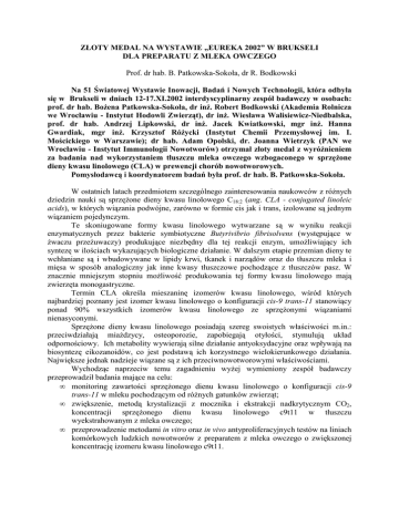 ZŁOTY MEDAL NA WYSTAWIE „EUREKA 2002” W BRUKSELI DLA PREPARATU Z MLEKA OWCZEGO Prof. dr hab. B. Patkowska-Sokoła, dr R. Bodkowski Na 51 Światowej Wystawie Inowacji, Badań i Nowych Technologii, która odbyła się w Brukseli w dniach 12-17.XI.2002 interdyscyplinarny zespół badawczy w osobach: prof. dr hab. BoŜena Patkowska-Sokoła, dr inŜ. Robert Bodkowski (Akademia Rolnicza we Wrocławiu - Instytut Hodowli Zwierząt), dr inŜ. Wiesława Walisiewicz-Niedbalska, prof. dr hab. Andrzej Lipkowski, dr inŜ. Jacek Kwiatkowski, mgr inŜ. Hanna Gwardiak, mgr inŜ. Krzysztof RóŜycki (Instytut Chemii Przemysłowej im. I. Mościckiego w Warszawie); dr hab. Adam Opolski, dr. Joanna Wietrzyk (PAN we Wrocławiu - Instytut Immunologii Nowotworów) otrzymał złoty medal z wyróŜnieniem za badania nad wykorzystaniem tłuszczu mleka owczego wzbogaconego w sprzęŜone dieny kwasu linolowego (CLA) w prewencji chorób nowotworowych. Pomysłodawcą i koordynatorem badań była prof. dr hab. B. Patkowska-Sokoła. W ostatnich latach przedmiotem szczególnego zainteresowania naukowców z róŜnych dziedzin nauki są sprzęŜone dieny kwasu linolowego C18:2 (ang. CLA - conjugated linoleic acids), w których wiązania podwójne, zarówno w formie cis jak i trans, izolowane są jednym wiązaniem pojedynczym. Te skoniugowane formy kwasu linolowego wytwarzane są w wyniku reakcji enzymatycznych przez bakterie symbiotyczne Butyrivibrio fibrisolvens (występujące w Ŝwaczu przeŜuwaczy) produkujące niezbędny dla tej reakcji enzym, umoŜliwiający ich syntezę w ilościach wykazujących biologiczne działanie. W dalszym etapie przemian dieny te wchłaniane są i wbudowywane w lipidy krwi, tkanek i narządów oraz do tłuszczu mleka i mięsa w sposób analogiczny jak inne kwasy tłuszczowe pochodzące z tłuszczów pasz. W znacznie mniejszym stopniu moŜliwość produkowania tej formy kwasu linolowego mają zwierzęta monogastryczne. Termin CLA określa mieszaninę izomerów kwasu linolowego, wśród których najbardziej poznany jest izomer kwasu linolowego o konfiguracji cis-9 trans-11 stanowiący ponad 90% wszystkich izomerów kwasu linolowego ze sprzęŜonymi wiązaniami nienasyconymi. SprzęŜone dieny kwasu linolowego posiadają szereg swoistych właściwości m.in.: przeciwdziałają miaŜdzycy, osteoporozie, zapobiegają otyłości, stymulują układ odpornościowy. Ich metabolity wywierają silne działanie antyoksydacyjne oraz wpływają na biosyntezę eikozanoidów, co jest podstawą ich korzystnego wielokierunkowego działania. Największe jednak nadzieje wiązane są z ich przeciwnowotworowymi właściwościami. Wychodząc naprzeciw temu zagadnieniu wyŜej wymieniony zespół badawczy przeprowadził badania mające na celu: • monitoring zawartości sprzęŜonego dienu kwasu linolowego o konfiguracji cis-9 trans-11 w mleku pochodzącym od róŜnych gatunków zwierząt; • zwiększenie, metodą krystalizacji z mocznika i ekstrakcji nadkrytycznym CO2, koncentracji sprzęŜonego dienu kwasu linolowego c9t11 w tłuszczu wyekstrahowanym z mleka owczego; • przeprowadzenie metodami in vitro oraz in vivo antyproliferacyjnych testów na liniach komórkowych ludzkich nowotworów z preparatem z mleka owczego o zwiększonej koncentrację izomeru kwasu linolowego c9t11. W pierwszym etapie badań oznaczono zawartość sprzęŜonego dienu kwasu linolowego o konfiguracji cis-9 trans-11 w mleku pochodzącym od róŜnych gatunków zwierząt (krowie, owcze, kozie) oraz zbadano wpływ Ŝywienia na kształtowanie się jego poziomu w mleku (badania wykonano na owcach). Tłuszcz z mleka ekstrahowano metodą Folcha dodatkowo wydzielając go z warstwy metanolowej eterem naftowym. Oznaczenia zawartości kwasów tłuszczowych (w tym izomeru c9t11) wykonano na chromatografie gazowym PU 4410 firmy Philips z detektorem płomieniowo-jonizacyjnym. Do rozdziału kwasów tłuszczowych uŜyto kolumny kapilarnej typu Rtx-2330 o grubości 20µm, długości 105m i średnicy 0,25mm. Na podstawie wykonanych analiz chromatograficznych stwierdzono znaczne róŜnice gatunkowe w poziomie sprzęŜonego dienu kwasu linolowego c9t11. NajwyŜszym poziomem tego dienu charakteryzowało się mleko owcze 1,24% kolejno krowie 0,87% a najniŜszym mleko kozie 0,67%. Ponadto zaobserwowano, Ŝe Ŝywienie zielonką pastwiskową oraz dodatkiem nasion roślin oleistych znacznie podnosi (1,5–2 krotnie) poziom tego izomeru w mleku. W drugim etapie badań w Instytucie Chemii Przemysłowej im. I Mościckiego w Warszawie na bazie tłuszczu mleka owczego, metodą krystalizacji z mocznika i ekstrakcji dwutlenkiem węgla w warunkach nadkrytycznych, uzyskano preparat o zwiększonej koncentracji CLA (głównie izomeru c9t11). Substratem wyjściowym było mleko owcze (od owiec fryzyjskich z gospodarstwa ekologicznego „Folwark Polski” w Łaziskach Poręby koło Twardogóry), które w porównaniu z innymi gatunkami mleka charakteryzowało się znacznie wyŜszą zawartością tłuszczu i sprzęŜonego dienu kwasu linolowego c9t11. Ekstrakcję tłuszczu z mleka przeprowadzono zgodnie z metodyką z I etapu. Następnie tłuszcz przeprowadzono w wolne kwasy tłuszczowe w procesie zmydlania alkoholowym roztworem wodorotlenku potasu i wykwaszania roztworem HCL. 1/3 wolnych kwasów tłuszczowych o 1,4% zawartości izomeru kwasu linolowego c9t11 pozostawiono do dalszych badań (preparat KT) natomiast pozostałą resztę wykorzystywano do otrzmywania, metodą krystalizację z mocznika i ekstrakcję nadkrytycznym CO2, frakcji wzbogaconej w izomer kwasu linolowego c9t11. W czasie krystalizacji z mocznika wykorzystano zdolność kwasów tłuszczowych nasyconych do tworzenia stałych adduktów z mocznikiem. Filtrat uzyskany po oddzieleniu adduktów średniołańcuchowych kwasów tłuszczowych z mocznikiem, frakcjonowano metodą ekstrakcji dwutlenkiem węgla uzyskując preparat o 11,2% zawartości izomeru c9t11 (KT/M-CO2). Oznaczenia składu kwasów tłuszczowych wyko