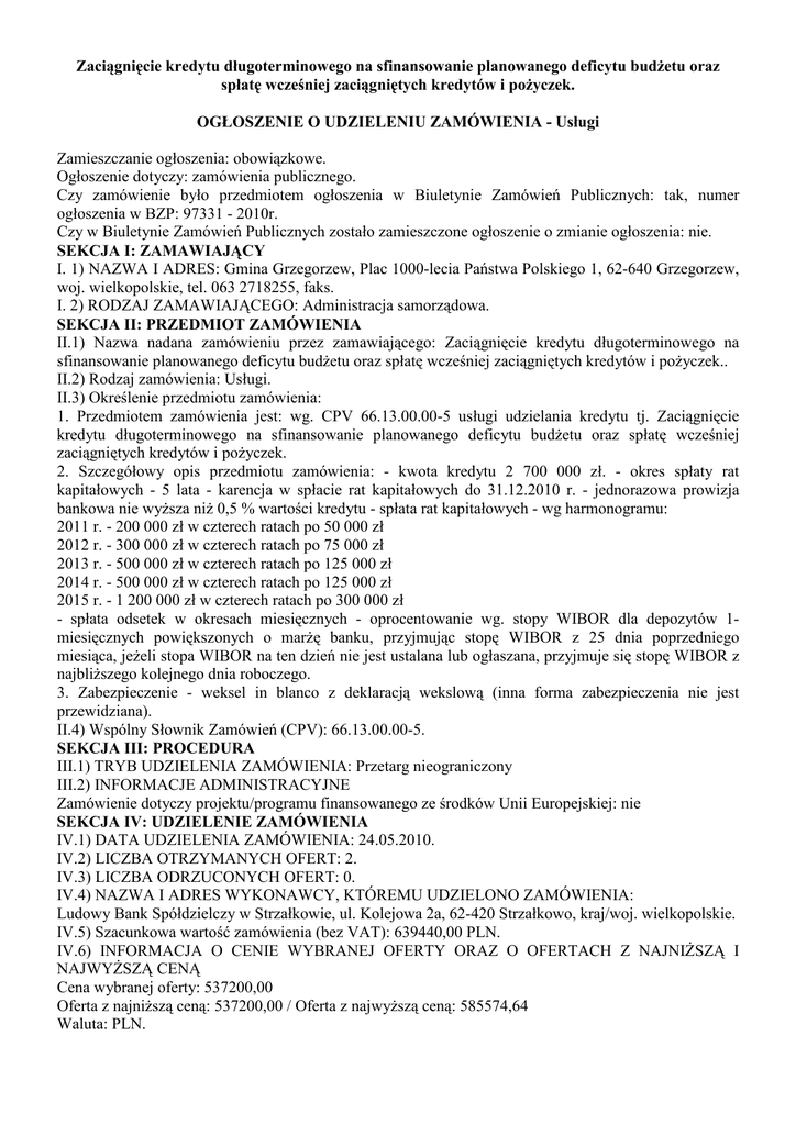 Zaciągnięcie kredytu długoterminowego na sfinansowanie planowanego deficytu budŜetu oraz spłatę wcześniej zaciągniętych kredytów i poŜyczek. OGŁOSZENIE O UDZIELENIU ZAMÓWIENIA - Usługi Zamieszczanie ogłoszenia: obowiązkowe. Ogłoszenie dotyczy: zamówienia publicznego. Czy zamówienie było przedmiotem ogłoszenia w Biuletynie Zamówień Publicznych: tak, numer ogłoszenia w BZP: 97331 - 2010r. Czy w Biuletynie Zamówień Publicznych zostało zamieszczone ogłoszenie o zmianie ogłoszenia: nie. SEKCJA I: ZAMAWIAJĄCY I. 1) NAZWA I ADRES: Gmina Grzegorzew, Plac 1000-lecia Państwa Polskiego 1, 62-640 Grzegorzew, woj. wielkopolskie, tel. 063 2718255, faks. I. 2) RODZAJ ZAMAWIAJĄCEGO: Administracja samorządowa. SEKCJA II: PRZEDMIOT ZAMÓWIENIA II.1) Nazwa nadana zamówieniu przez zamawiającego: Zaciągnięcie kredytu długoterminowego na sfinansowanie planowanego deficytu budŜetu oraz spłatę wcześniej zaciągniętych kredytów i poŜyczek.. II.2) Rodzaj zamówienia: Usługi. II.3) Określenie przedmiotu zamówienia: 1. Przedmiotem zamówienia jest: wg. CPV 66.13.00.00-5 usługi udzielania kredytu tj. Zaciągnięcie kredytu długoterminowego na sfinansowanie planowanego deficytu budŜetu oraz spłatę wcześniej zaciągniętych kredytów i poŜyczek. 2. Szczegółowy opis przedmiotu zamówienia: - kwota kredytu 2 700 000 zł. - okres spłaty rat kapitałowych - 5 lata - karencja w spłacie rat kapitałowych do 31.12.2010 r. - jednorazowa prowizja bankowa nie wyŜsza niŜ 0,5 % wartości kredytu - spłata rat kapitałowych - wg harmonogramu: 2011 r. - 200 000 zł w czterech ratach po 50 000 zł 2012 r. - 300 000 zł w czterech ratach po 75 000 zł 2013 r. - 500 000 zł w czterech ratach po 125 000 zł 2014 r. - 500 000 zł w czterech ratach po 125 000 zł 2015 r. - 1 200 000 zł w czterech ratach po 300 000 zł - spłata odsetek w okresach miesięcznych - oprocentowanie wg. stopy WIBOR dla depozytów 1miesięcznych powiększonych o marŜę banku, przyjmując stopę WIBOR z 25 dnia poprzedniego miesiąca, jeŜeli stopa WIBOR na ten dzień nie jest ustalana lub ogłaszana, przyjmuje się stopę WIBOR z najbliŜszego kolejnego dnia roboczego. 3. Zabezpieczenie - weksel in blanco z deklaracją wekslową (inna forma zabezpieczenia nie jest przewidziana). II.4) Wspólny Słownik Zamówień (CPV): 66.13.00.00-5. SEKCJA III: PROCEDURA III.1) TRYB UDZIELENIA ZAMÓWIENIA: Przetarg nieograniczony III.2) INFORMACJE ADMINISTRACYJNE Zamówienie dotyczy projektu/programu finansowanego ze środków Unii Europejskiej: nie SEKCJA IV: UDZIELENIE ZAMÓWIENIA IV.1) DATA UDZIELENIA ZAMÓWIENIA: 24.05.2010. IV.2) LICZBA OTRZYMANYCH OFERT: 2. IV.3) LICZBA ODRZUCONYCH OFERT: 0. IV.4) NAZWA I ADRES WYKONAWCY, KTÓREMU UDZIELONO ZAMÓWIENIA: Ludowy Bank Spółdzielczy w Strzałkowie, ul. Kolejowa 2a, 62-420 Strzałkowo, kraj/woj. wielkopolskie. IV.5) Szacunkowa wartość zamówienia (bez VAT): 639440,00 PLN. IV.6) INFORMACJA O CENIE WYBRANEJ OFERTY ORAZ O OFERTACH Z NAJNIśSZĄ I NAJWYśSZĄ CENĄ Cena wybranej oferty: 537200,00 Oferta z najniŜszą ceną: 537200,00 / Oferta z najwyŜszą ceną: 585574,64 Waluta: PLN.