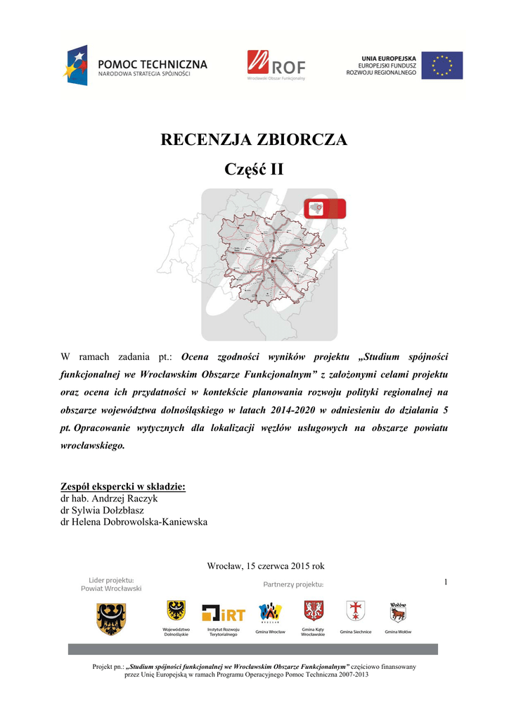 RECENZJA ZBIORCZA Część II W ramach zadania pt.: Ocena zgodności wyników projektu „Studium spójności funkcjonalnej we Wrocławskim Obszarze Funkcjonalnym” z założonymi celami projektu oraz ocena ich przydatności w kontekście planowania rozwoju polityki regionalnej na obszarze województwa dolnośląskiego w latach 2014-2020 w odniesieniu do działania 5 pt. Opracowanie wytycznych dla lokalizacji węzłów usługowych na obszarze powiatu wrocławskiego. Zespół ekspercki w składzie: dr hab. Andrzej Raczyk dr Sylwia Dołzbłasz dr Helena Dobrowolska-Kaniewska Wrocław, 15 czerwca 2015 rok 1 Projekt pn.: „Studium spójności funkcjonalnej we Wrocławskim Obszarze Funkcjonalnym” częściowo finansowany przez Unię Europejską w ramach Programu Operacyjnego Pomoc Techniczna 2007-2013 Z uwagi na dużą różnorodność tematyczną dokumentów realizujących oceniane zadania oraz realizację pojedynczych działań przez jeden lub kilka dokumentów, recenzja Działania 5 pt.: Opracowanie wytycznych dla lokalizacji węzłów usługowych na obszarze powiatu wrocławskiego została przeprowadzona w odniesieniu do następujących zadań: 1. Inwentaryzacja terenów istniejącej i planowanej zabudowy usługowej i mieszkaniowej na obszarze powiatu wrocławskiego (5.1). 2. Diagnoza trendów i analiza potrzeb w zakresie lokalizacji funkcji usługowych w powiecie wrocławskim (5.2) oraz Wytyczne planistyczne dla lokalizacji usług w powiecie wrocławskim (5.3). Dla obu tych zadań dokonano analizy łącznej w podziale na 4 etapy. 2 Projekt pn.: „Studium spójności funkcjonalnej we Wrocławskim Obszarze Funkcjonalnym” częściowo finansowany przez Unię Europejską w ramach Programu Operacyjnego Pomoc Techniczna 2007-2013 Spis treści I. Wstęp ...................................................................................................................................... 4 II. Recenzja zadania pt. Inwentaryzacja terenów istniejącej i planowanej zabudowy usługowej i mieszkaniowej na obszarze powiatu wrocławskiego ............................................. 5 II.1. Struktura dokumentu: .................................................................................................... 6 II.2. Ocena zgodności wyników projektu z zakładanymi celami strategicznymi oraz oczekiwanymi rezultatami w odniesieniu do planistycznych dokumentów strategicznych na poziomie lokalnym, wojewódzkim oraz krajowym. ................................ 7 II.3. Ocena spójności wewnętrznej projektu ....................................................................... 13 II.4. wartości dodanej projektu w stosunku do wymogów ustawy o planowaniu i zagospodarowaniu przestrzennym z dnia 8 kwietnia 2014r. w odniesieniu do „miejskich obszarów funkcjonalnych ośrodka wojewódzkiego” oraz przydatności w kontekście opracowania podstaw dla Zintegrowanej Strategii Rozwoju dla Wrocławskiego Obszaru Funkcjonalnego........................................................................... 17 III. Recenzja zadań pt. Diagnoza trendów i analiza potrzeb w zakresie lokalizacji funkcji usługowych w powiecie wrocławskim oraz Wytyczne planistyczne dla lokalizacji usług w powiecie wrocławskim.............................................................................. 18 III.1. Struktura dokumentu: ................................................................................................. 19 III.2. Ocena zgodności wyników projektu z zakładanymi celami strategicznymi oraz oczekiwanymi rezultatami w odniesieniu do planistycznych dokumentów strategicznych na poziomie lokalnym, wojewódzkim oraz krajowym. .............................. 28 III.3. Ocena spójności wewnętrznej projektu...................................................................... 32 III.4. wartości dodanej projektu w stosunku do wymogów ustawy o planowaniu i zagospodarowaniu przestrzennym z dnia 8 kwietnia 2014r. w odniesieniu do „miejskich obszarów funkcjonalnych ośrodka wojewódzkiego” oraz przydatności w kontekście opracowania podstaw dla Zintegrowanej Strategii Rozwoju dla Wrocławskiego Obszaru Funkcjonalnego........................................................................... 45 IV. Podsumowanie recenzji w odniesieniu do Działania pt. Opracowanie wytycznych dla lokalizacji węzłów usługowych na obszarze powiatu wrocławskiego............................... 48 3 Projekt pn.: „Studium spójności funkcjonalnej we Wrocławskim Obszarze Funkcjonalnym” częściowo finansowany przez Unię Europejską w ramach Programu Operacyjnego Pomoc Techniczna 2007-2013 I. Wstęp Mając na uwadze, iż o ile wszystkie realizowane w ramach projektu pt. „Studium spójności funkcjonalnej we Wrocławskim Obszarze Funkcjonalnych” analizy odnosiły się do zdefiniowanego w remach tego projektu Wrocławskiego Obszaru Funkcjonalnego, o tyle recenzowane w niniejszym dokumencie opracowania wchodzące w skład zadania 5 – „Opracowanie wytycznych dla lokalizacji węzłów usługowych na obszarze powiatu wrocławskiego” dotyczyły jedynie gmin wchodzących w skład tego powiatu. W związku z powyższym należy pamiętać, że wszystkie powstałe w ramach tego zadania wytyczne czy wnioski mogą wprawdzie stanowić punkt wyjścia dla opracowywanej Zintegrowanej Strategii Rozwoju Wrocławskiego Obszaru Funkcjonalnego (WrOF) ale muszą być uzupełnione o analizy dotyczące pozostały gmin wchodzących w skład WrOF. Ponadto, jak zaznaczają sami autorzy opracowania, przedstawiona w recenzowanym dokumencie metoda opracowania katalogu usług i analizy ich przestrzennej dostępności mają charakter pilotażowy i są dostosowane do specyfiki powiatu wrocławskiego. W celu adaptacji jej na potrzeby Wrocławskiego Obszaru Funkcjonalnego lub innych terenów, należy dostosować poszczególne jej komponenty do charakteru obszaru, którego mają dotyczyć. 4 Projekt pn.: „Studium spójności funkcjonalnej we Wrocław