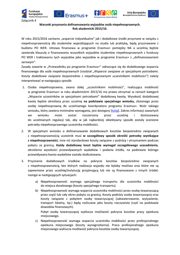 Załącznik 4 Warunki przyznania dofinansowania wyjazdów osób niepełnosprawnych. Rok akademicki 2015/16. W roku 2015/2016 zarówno „wsparcie indywidualne" jak i dodatkowe środki przyznane w związku z niepełnosprawnością dla studentów wyjeżdżających na studia lub praktykę, będą przyznawane z budżetu PO WER. Umowa finansowa w programie Erasmus+ pomiędzy NA a uczelnią będzie zawierała klauzulę o finansowaniu wszystkich wyjazdów studentów niepełnosprawnych z funduszy PO WER i traktowaniu tych wyjazdów jako wyjazdów w programie Erasmus+ z „dofinansowaniem zerowym”. Zasady zawarte w „Przewodniku po programie Erasmus+” odnoszące się do dodatkowego wsparcia finansowego dla osób niepełnosprawnych (rozdział „Wsparcie związane ze specjalnymi potrzebami. Koszty dodatkowe związane bezpośrednio z niepełnosprawnymi uczestnikami mobilności”) należy interpretować w następujący sposób: 1. Osoba niepełnosprawna, zwana dalej „uczestnikiem mobilności”, realizująca mobilność w programie Erasmus+ w roku akademickim 2015/16 ma prawo otrzymać w ramach kategorii „Wsparcie uczestników ze specjalnymi potrzebami” dodatkową kwotę. Wysokość dodatkowej kwoty będzie określana przez uczelnię na podstawie specjalnego wniosku, złożonego przez osobę niepełnosprawną do uczelnianego koordynatora programu Erasmus+. Wzór takiego wniosku, który zawiera minimalne wymagania, jest dostępny [tutaj]. Zakres informacji zawartych we wniosku może zostać rozszerzony przez uczelnię i dostosowany do uczelnianych regulacji tak, aby w jak najbardziej obiektywny sposób zostały ocenione potrzeby niepełnosprawnego uczestnika mobilności. 2. W specjalnym wniosku o dofinansowanie dodatkowych kosztów bezpośrednio związanych z niepełnosprawnością uczestnik musi w szczegółowy sposób określić potrzeby wynikające z niepełnosprawności, inne niż standardowe koszty związane z podróżą i utrzymaniem podczas pobytu za granicą. Każdy dodatkowy koszt będzie wymagał szczegółowego uzasadnienia, określenia wysokości przewidywanych wydatków i podania źródła, na podstawie którego przewidywana kwota wydatków została skalkulowana. 3. Przyznanie dodatkowych środków na pokrycie kosztów bezpośrednio związanych z niepełnosprawnością, bez których realizacja wyjazdu nie byłaby możliwa oraz które nie są zapewnione przez uczelnię/instytucję przyjmującą lub nie są finansowane z innych źródeł, nastąpi w następujących sytuacjach: a) Niepełnosprawność wymaga specjalnego transportu dla uczestnika mobilności do miejsca docelowego (koszty specjalnego transportu). b) Niepełnosprawność wymaga wsparcia uczestnika mobilności przez osobę towarzyszącą przez część lub cały okres pobytu za granicą. Koszty podróży osoby towarzyszącej oraz koszty związane z pobytem osoby towarzyszącej (zakwaterowanie, wyżywienie, transport lokalny, itp.) będą rozliczane jako koszty rzeczywiste (czyli na podstawie dowodów finansowych). Pobyt osoby towarzyszącej wyklucza możliwość pokrycia kosztów pracy opiekuna miejscowego. c) Niepełnosprawność wymaga wsparcia uczestnika mobilności przez profesjonalnego opiekuna miejscowego (koszty wynagrodzenia). Praca profesjonalnego opiekuna miejscowego wyklucza możliwość pokrycia kosztów osoby towarzyszącej. d) Niepełnosprawność wymaga korzystania ze specjalnych materiałów dydaktycznych przez uczestnika mobilności w kształceniu/ podczas pracy w instytucji przyjmującej (koszty specjalnych materiałów dydaktycznych); e) Niepełnosprawność wymaga specjalnej opieki medycznej dla uczestnika mobilności na miejscu (koszty opieki lekarskiej, rehabilitacji, leków, bez których pobyt za granicą nie byłby możliwy); f) Niepełnosprawność wymaga specjalnego ubezpieczenia dla uczestnika mobilności (koszty specjalnego ubezpieczenia); g) Niepełnosprawność wymaga poniesienia innych kosztów przez uczestnika mobilności, bez których wyjazd stypendialny nie mógłby się odbyć (ta kategoria wymaga udokumentowania w postaci zalecenia organu orzekającego o niepełnosprawności lub lekarza). 4. Każdy wniosek będzie rozpatrywany przez uczelnię indywidualnie. Wniosek musi być zaopiniowany przez przedstawiciela uczelnianej komórki zajmującej się osobami niepełnosprawnymi. Jeżeli w uczelni nie ma takiej komórki, wniosek musi być zaopiniowany przez osobę, która ma w swoim zakresie obowiązków zagadnienia związane z kształceniem osób niepełnosprawnych. Jeżeli uczelnia oceniając wniosek będzie miała wątpliwości co do zasadności danego wydatku, może zażądać od uczestnika mobilności ubiegającego się o dofinansowanie dostarczenia dodatkowego uzasadnienia, np. odpowiedniego zaświadczenia lekarskiego. 5. Bezzwłocznie po podjęciu decyzji uczelnia powinna poinformować uczestnika mobilności ubiegającego się o dofinansowanie z tytułu niepełnosprawności o kwocie dodatkowego wsparcia (dodatkowego w stosunku do ryczałtu wynikającego z planowanego czasu trwania pobytu za granicą). 6. Po zatwierdzeniu wniosków uczestników mobilności uczelnia, zgodnie z Załącznikiem III „Zasady finansowe i umowne”, ubiega się o dofinansowanie uczestników w raporcie postępu do NA (w formie zbiorczej imiennej listy osób z przyznanymi kwotami). W przypadku wyczerpania środków przekazanych uczelni przez NA na podstawie raportu postępu uczelnia będzie mogła złożyć do NA dodatkowy wniosek-deklarację. Zalecanym przez NA terminem złożenia dodatkowego wniosku-deklaracji jest termin złożenia kolejnego raportu postępu. 7. Uczelnia będzie zobowiązana do rozliczenia uczestników z orzeczoną niepełnosprawnością bezzwłocznie po zakończeniu przez nich pobytu za granicą. NA będzie weryfikowała poprawność dokonanego przez uczelnię rozliczenia w ramach kontroli pogłębionych realizowanych po złożeniu przez uczelnię raportu końcowego. NA będzie miała